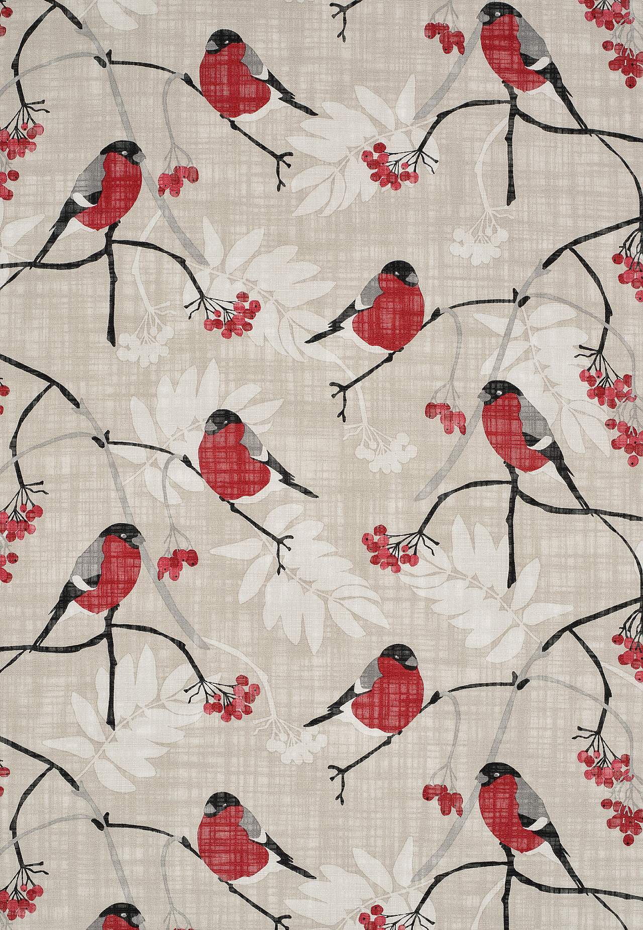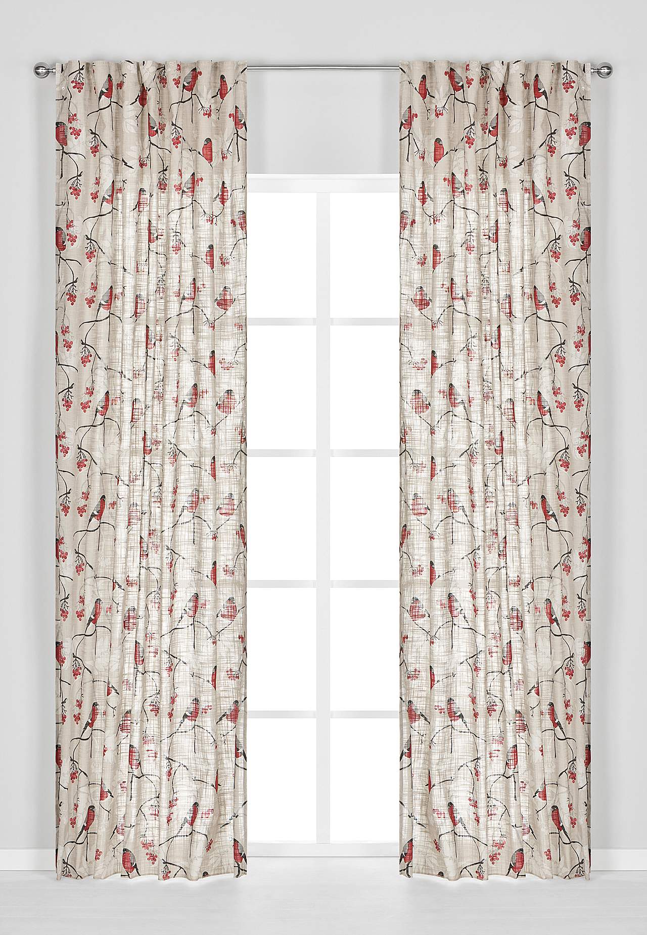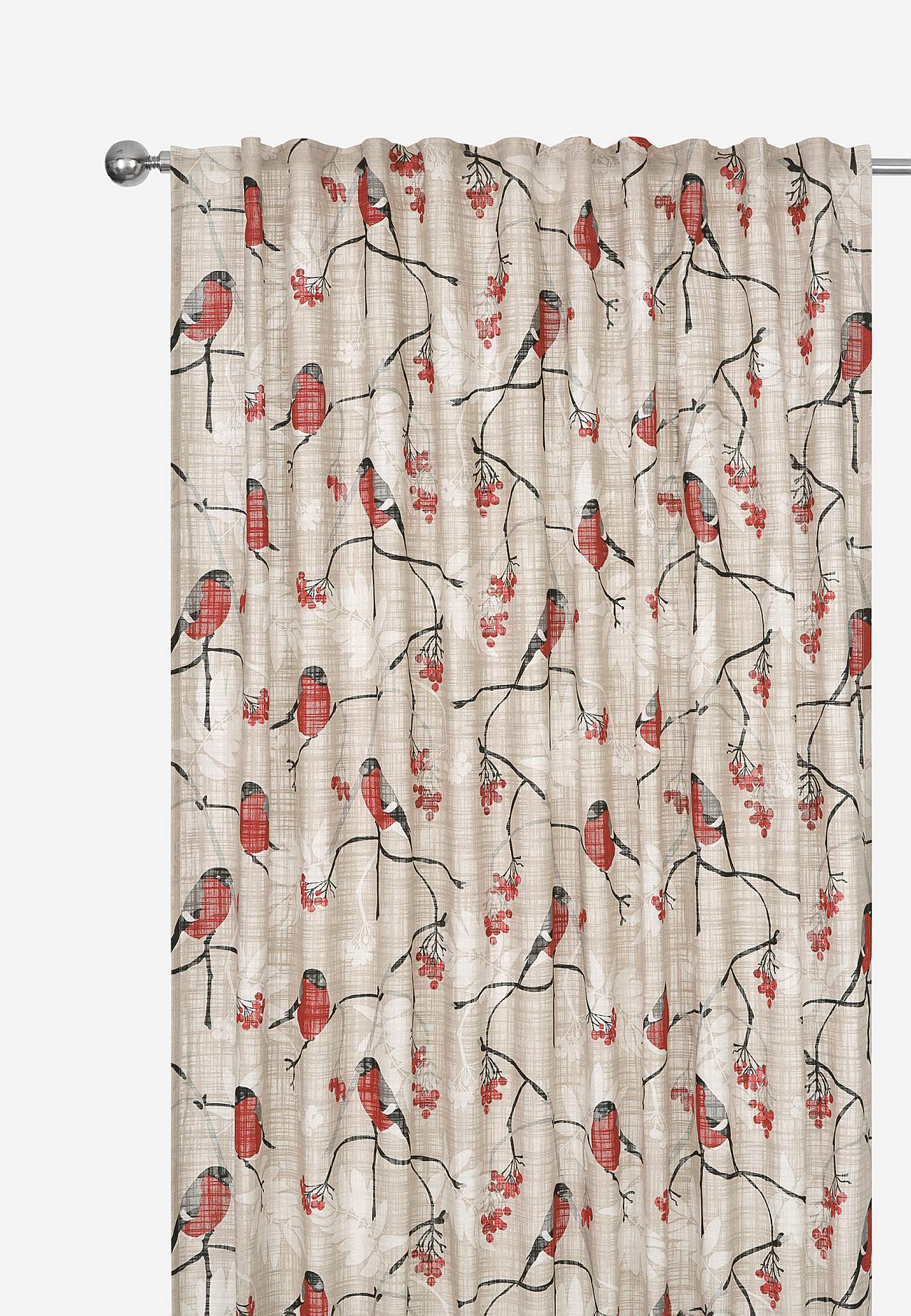 Natištěné panelové závěsy s rozkošnými hýli, listem a červenými bobulemi. Vetkaná rýhovaná vlákna poskytují nádhernou strukturu. Dobrá propustnost světla. Potisk je jasně viditelný na zadní straně. Obnitkovaný lem.