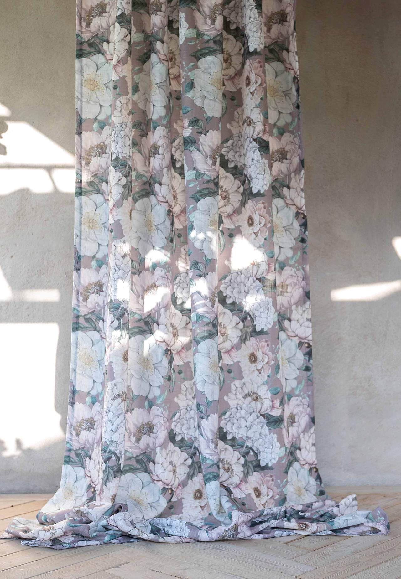 Panelové závěsy s krásnými pivoňkami. Materiál s hezkým řasením. Vetkaná rýhovaná vlákna poskytují nádhernou strukturu. Dobrá propustnost světla. Potisk je jasně viditelný na zadní straně.