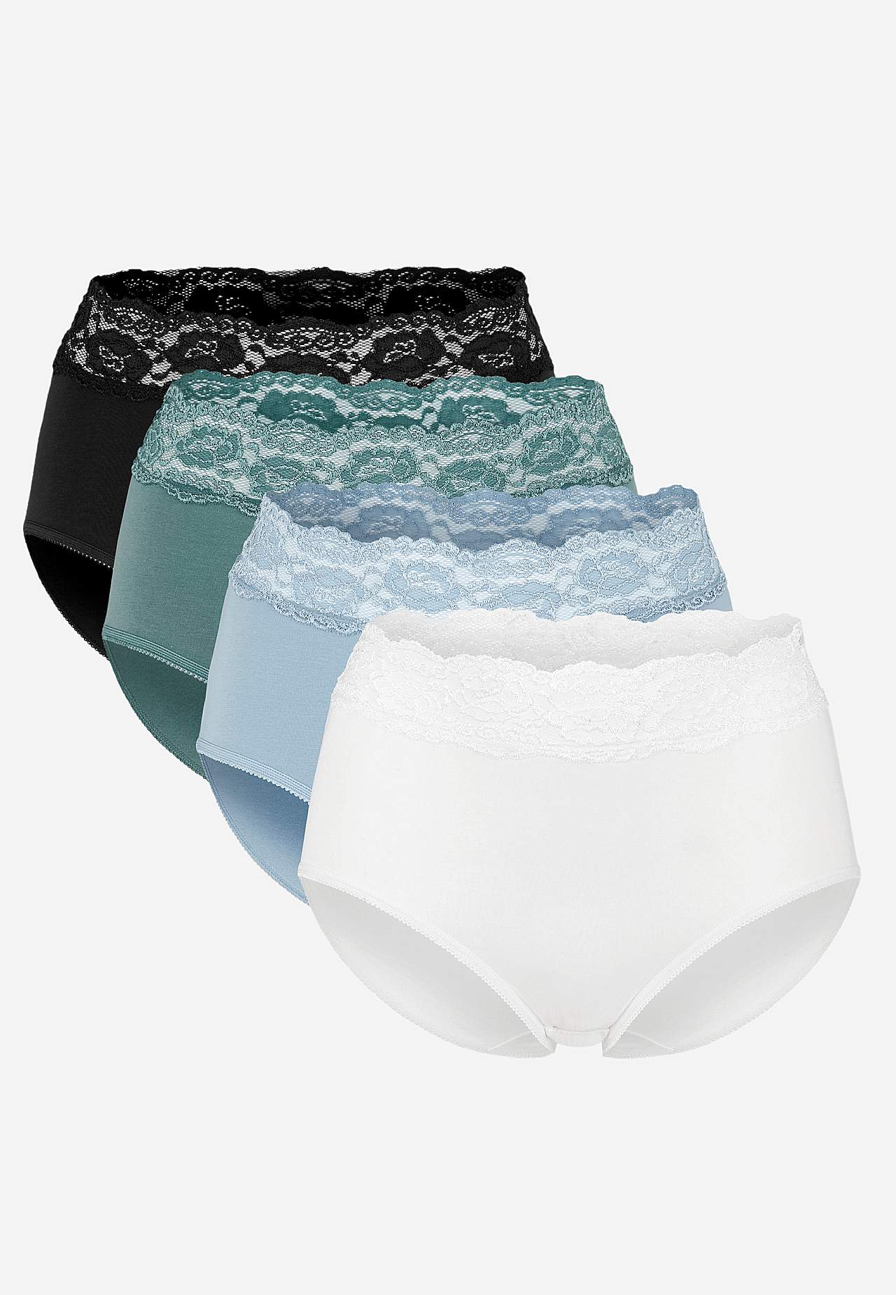 Kalhotky midi z měkké a organické bavlny a široké a pohodlné krajky v pase. Dokonalé každodenní kalhotky, dostupné ve výhodném balení po 4. Tenká guma na otvoru nohavice. Klínek s bavlněnou podšívkou.