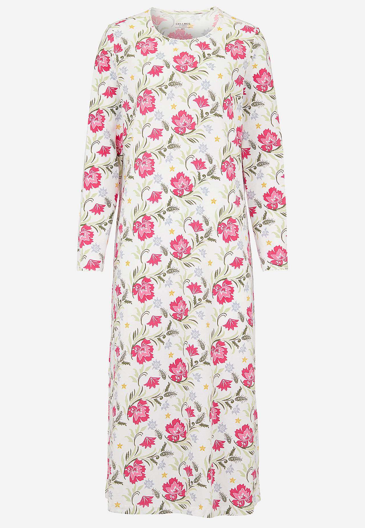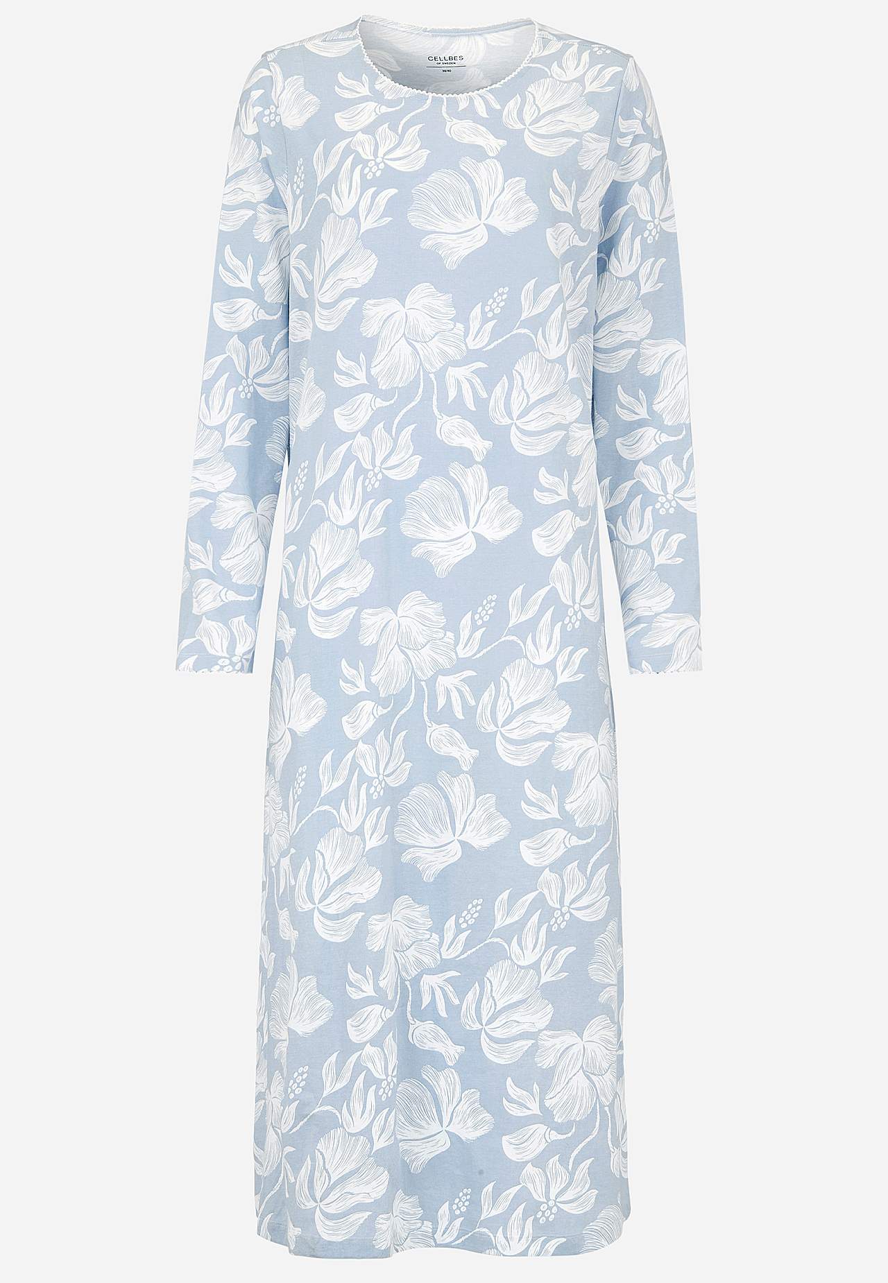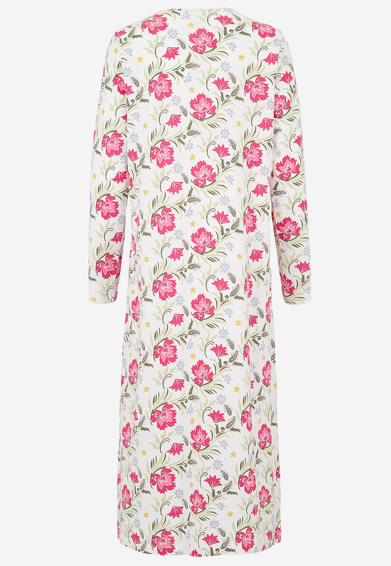 Kulatý krk s hezkým krajkovým okrajem. Dlouhé rukávy s krajkovým okrajem na manžetách. Rovný lem. Délka od ramene cca. 123 cm ve všech velikostech.