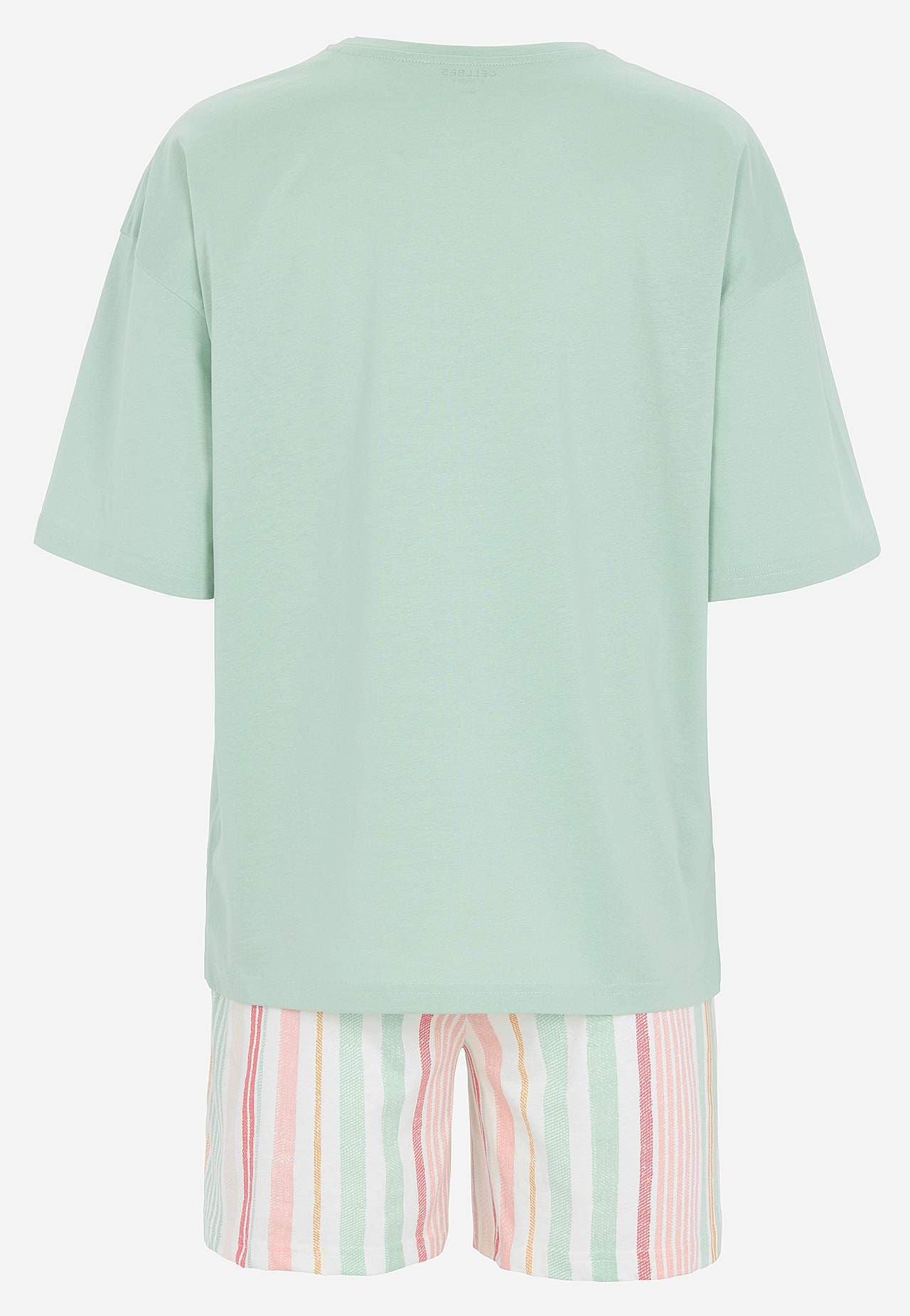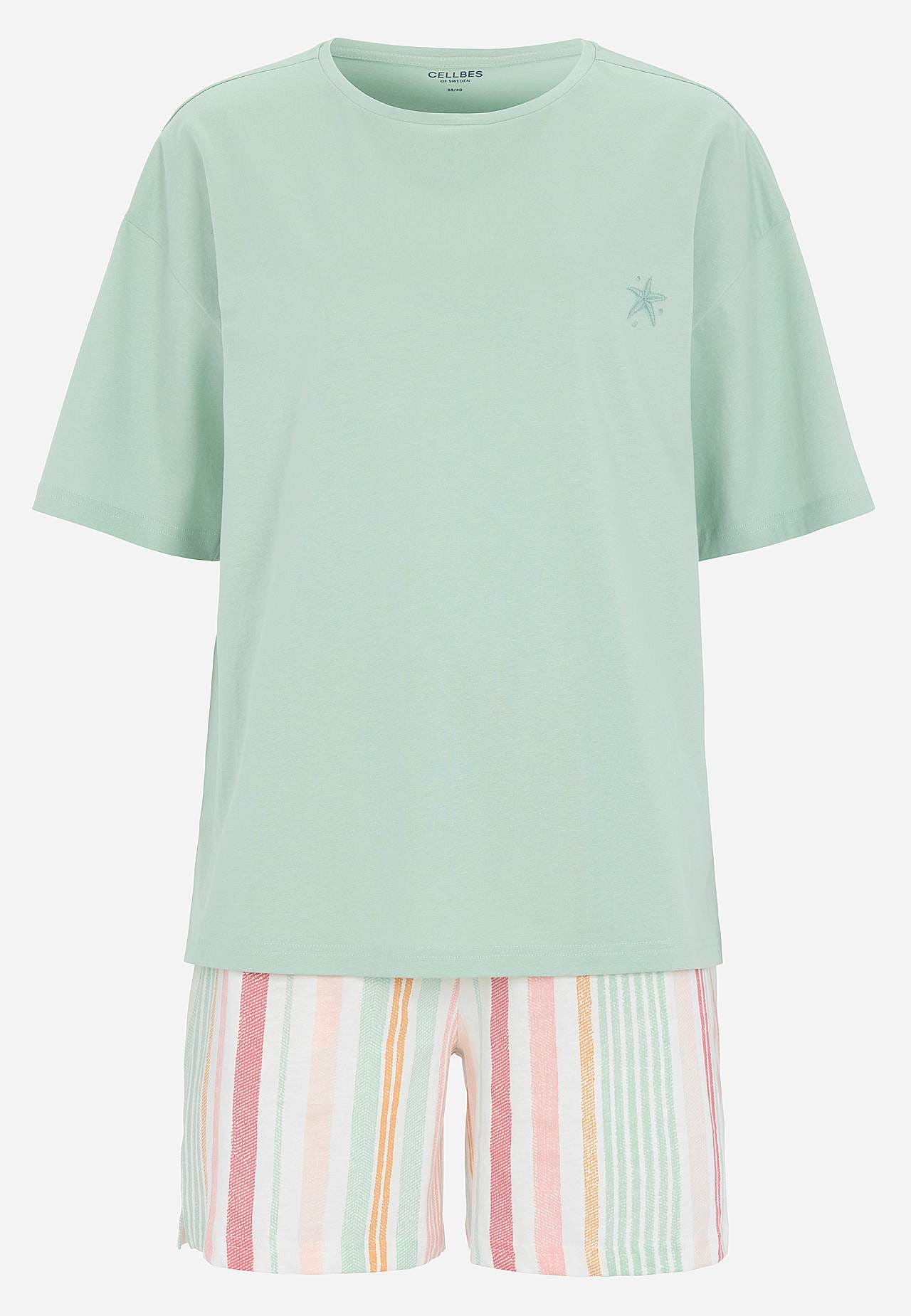 Pyžamová souprava s topem s krátkými rukávy a kraťasy. Měkká a organická bavlna. Klasický střih. Vršek: Tričko s jemně pokleslým ramenem. Malý detail výšivky ve stejném odstínu na levé straně. Krátké rukávy. Rovný lem s rozparkem na stranách. Délka zad se odvíjí od velikosti, cca 63-73 cm. Spodní část: Kraťasy se šířkou. Mě... Přečtěte si více