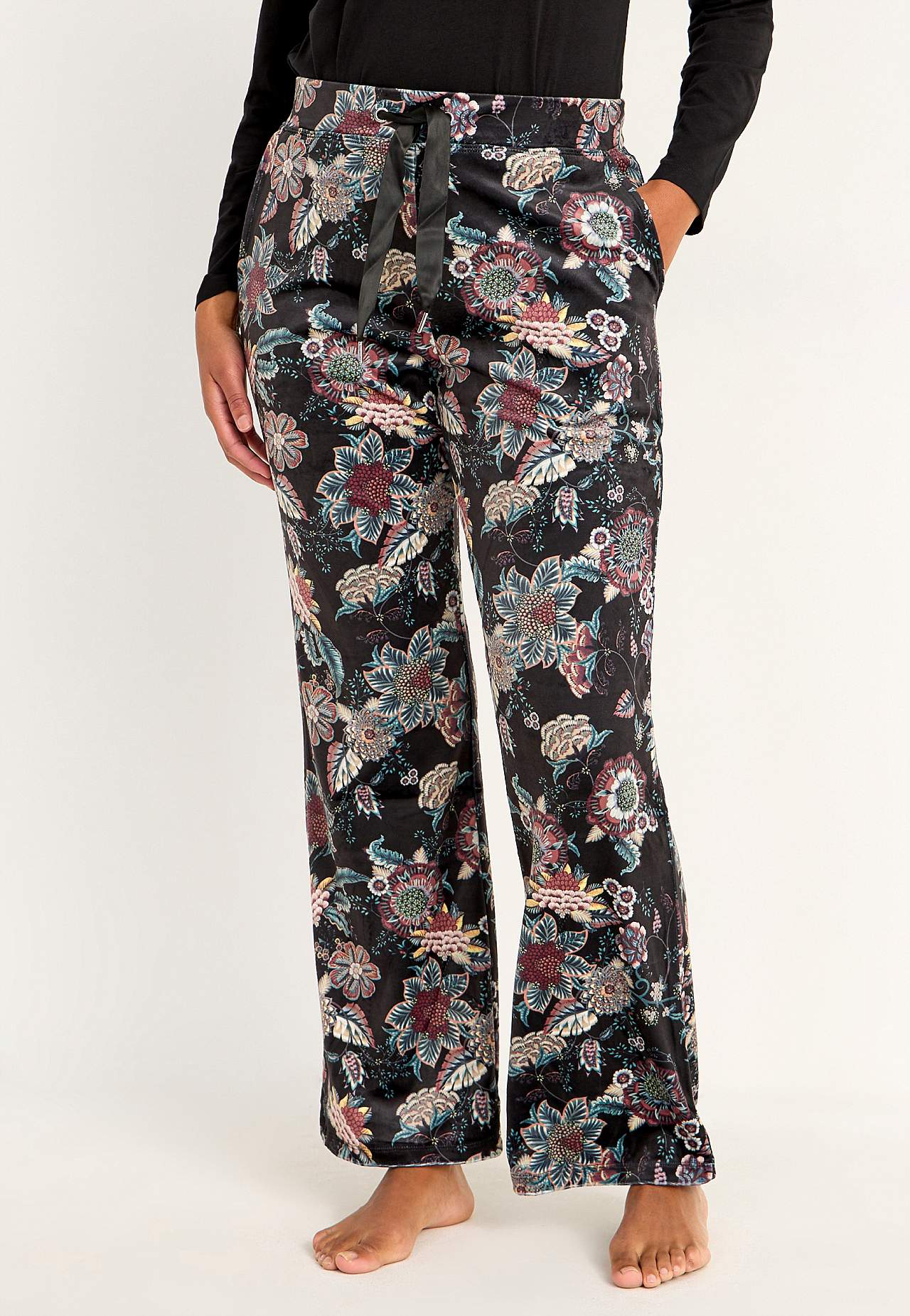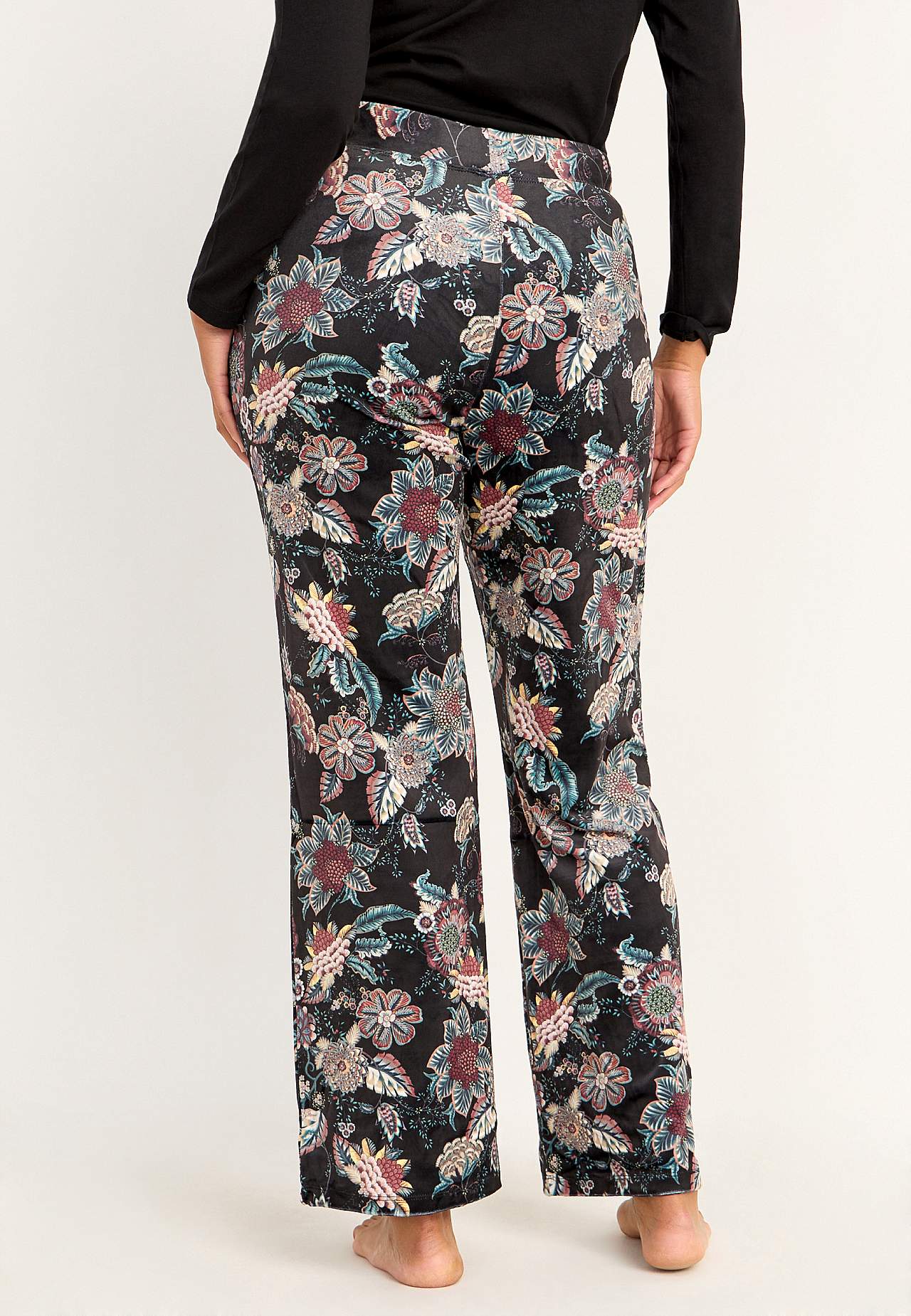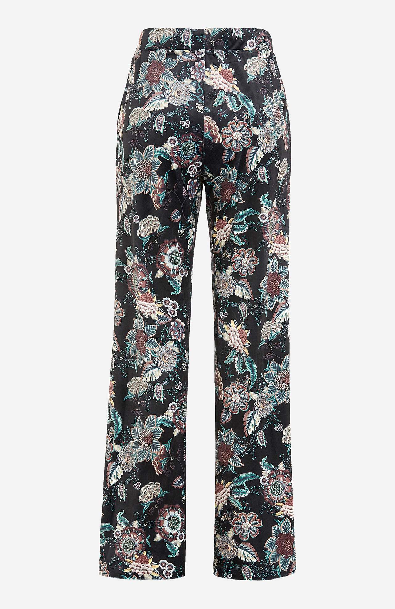 Velurové kalhoty se širokými nohavicemi. Široký elastický popruh v pase s utahovací šňůrou ze saténu. Kapsy na stranách se saténovou podšívkou uvnitř. Vnitřní délka nohavice se odvíjí od velikosti, cca 79 cm.