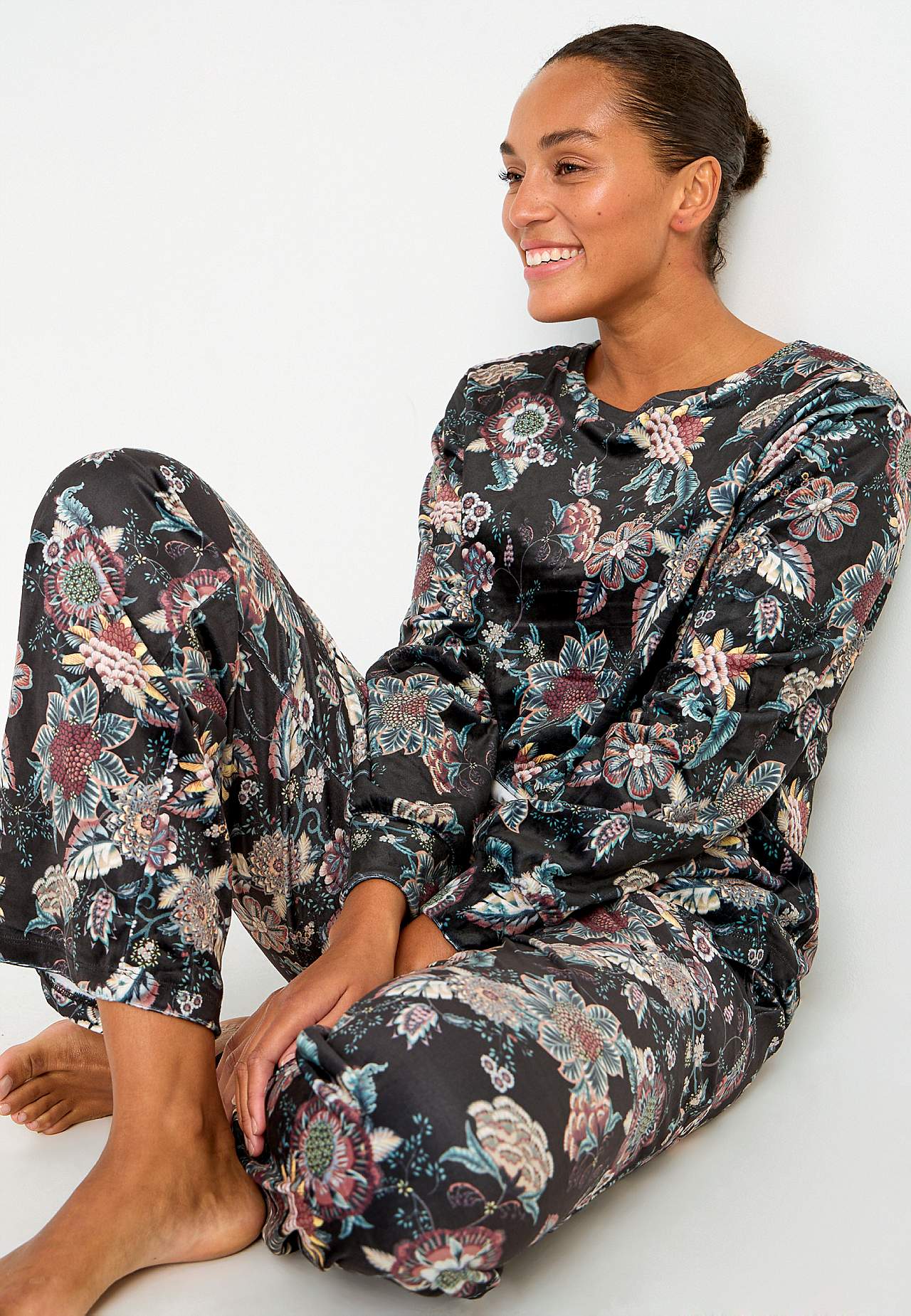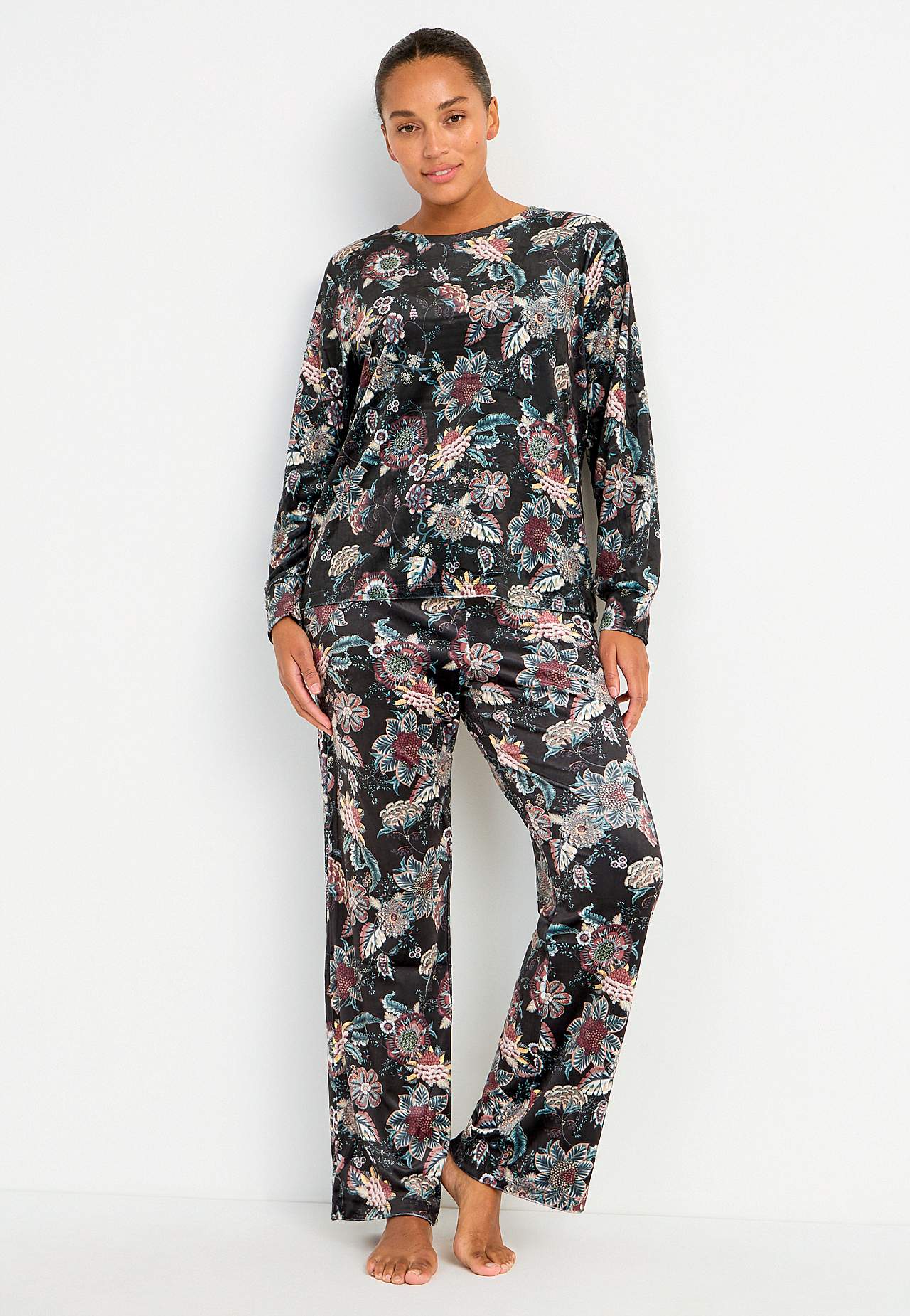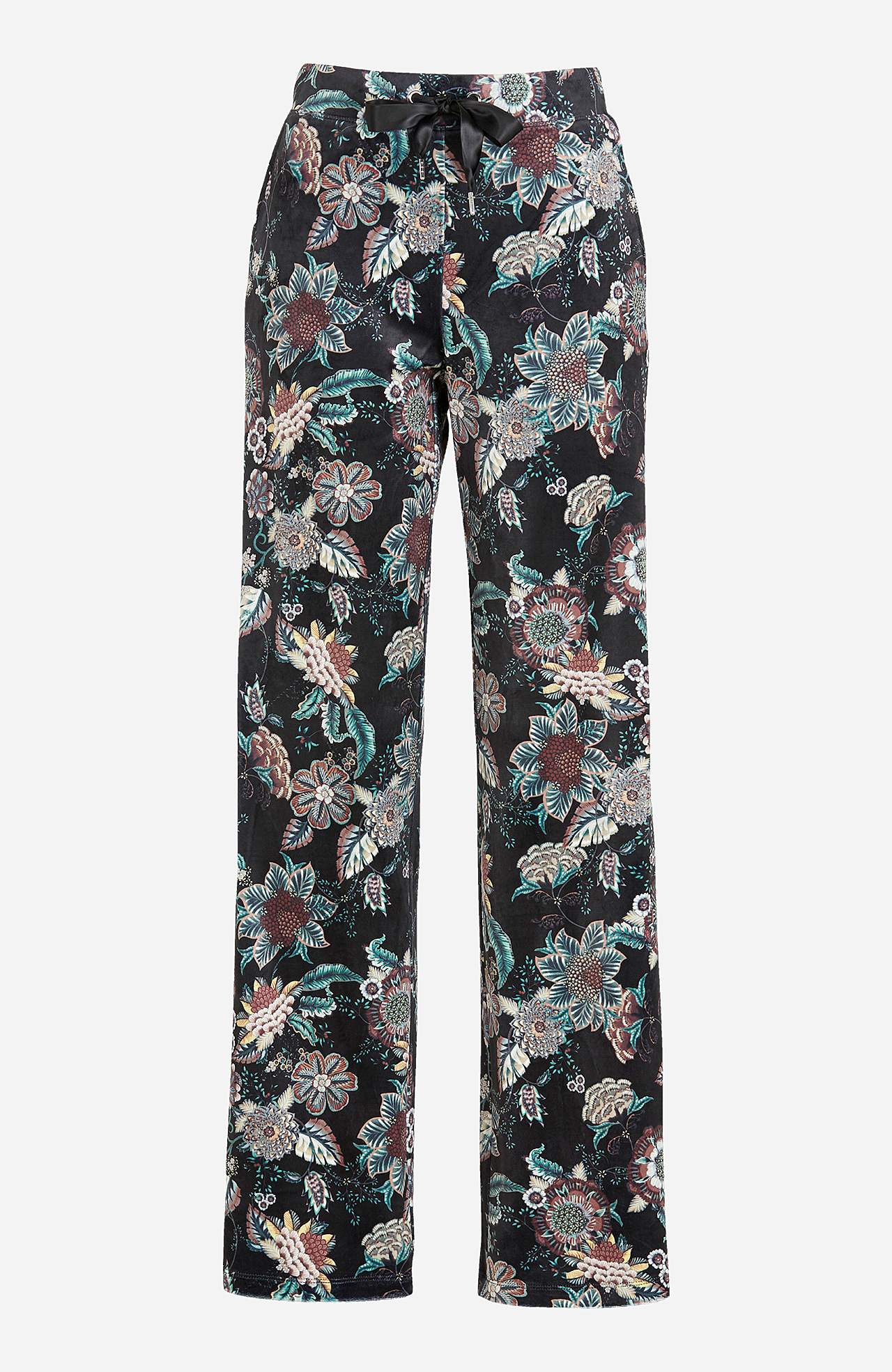 Velurové kalhoty se širokými nohavicemi. Široký elastický popruh v pase s utahovací šňůrou ze saténu. Kapsy na stranách se saténovou podšívkou uvnitř. Vnitřní délka nohavice se odvíjí od velikosti, cca 79 cm.
