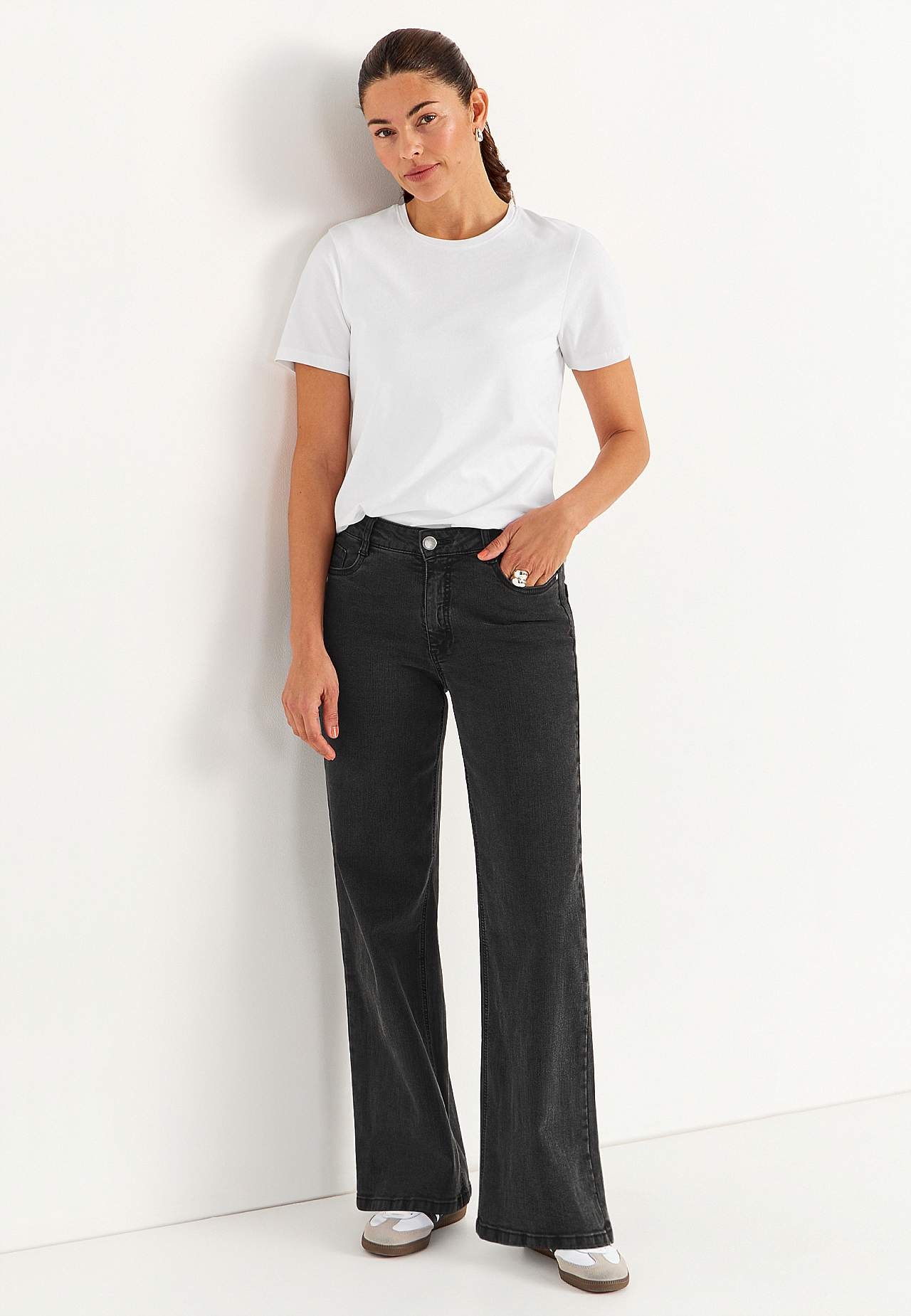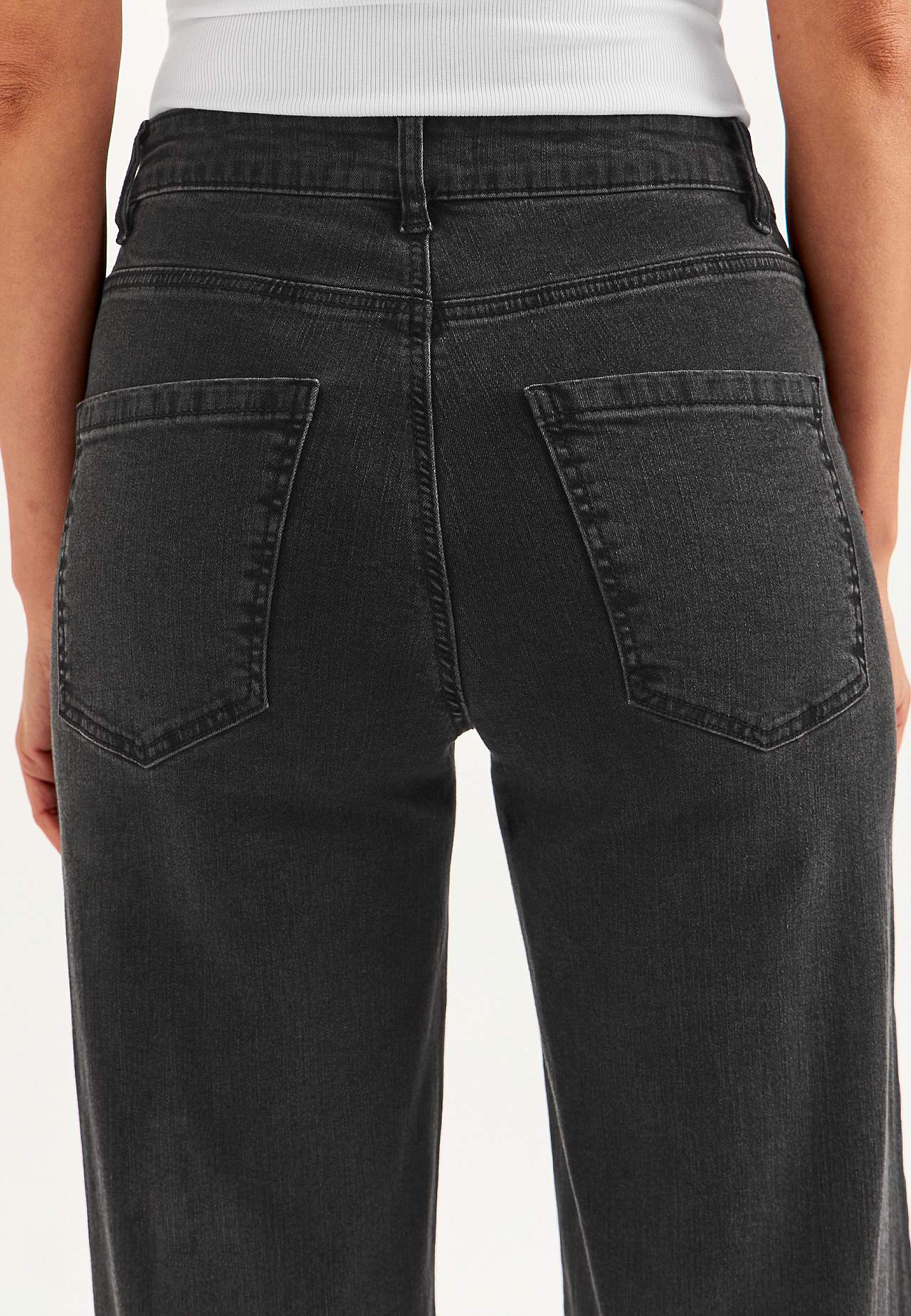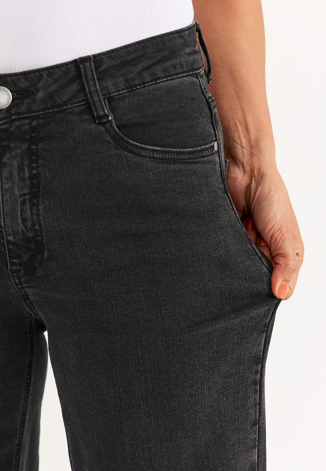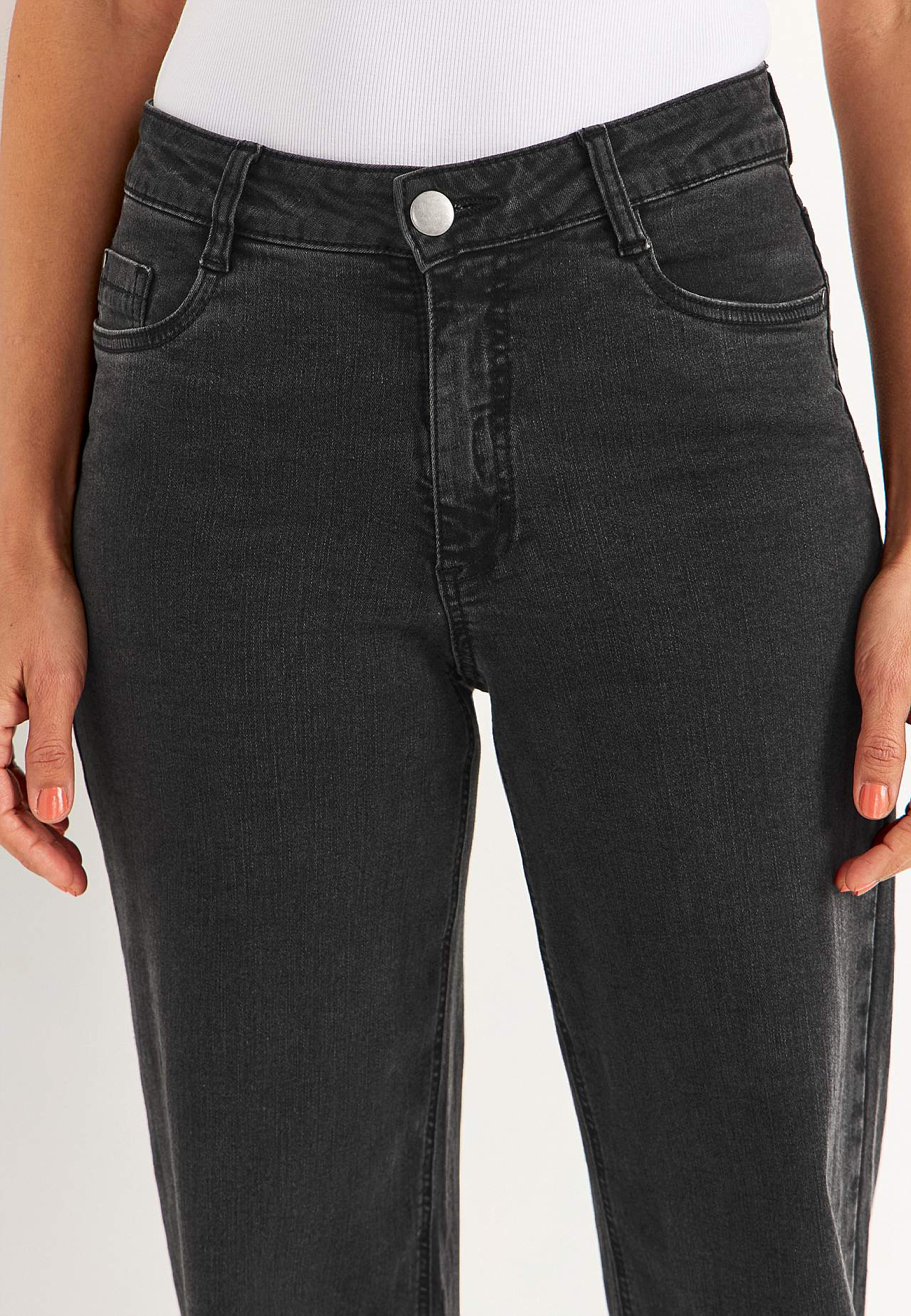Džíny s 5 kapsami. Vysoký pas. Rovný design. Široké nohavice. Zip s knoflíkem. Pas s poutky na pásek. Vnitřní délka nohavice cca 80 cm ve všech velikostech. Střih přední části se liší podle velikosti: přibližně 72-84 cm. K dispozici také s vnitřní délkou nohavice 85 cm, viz položka č. 700142.