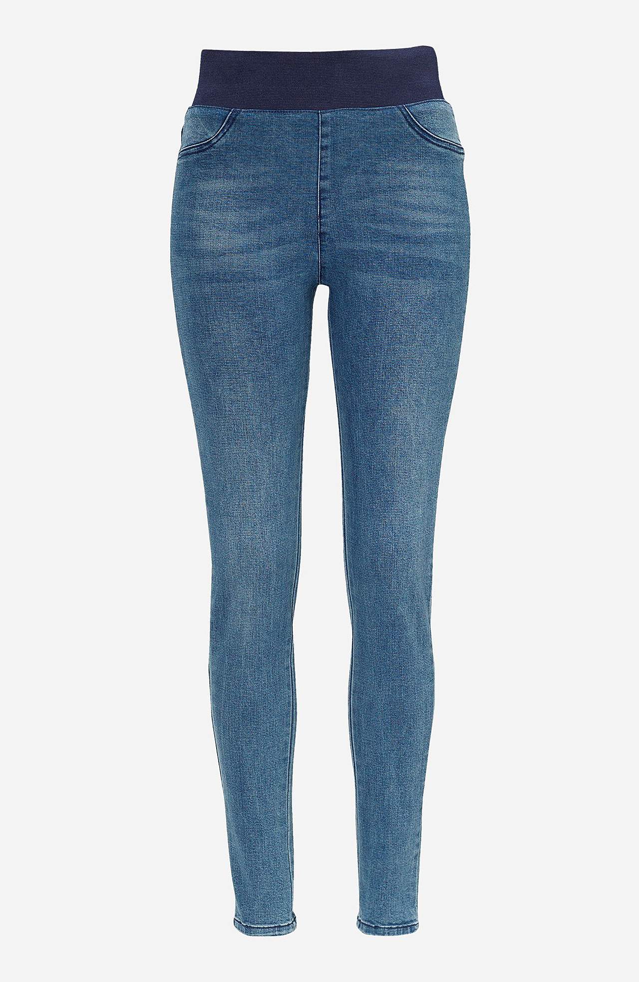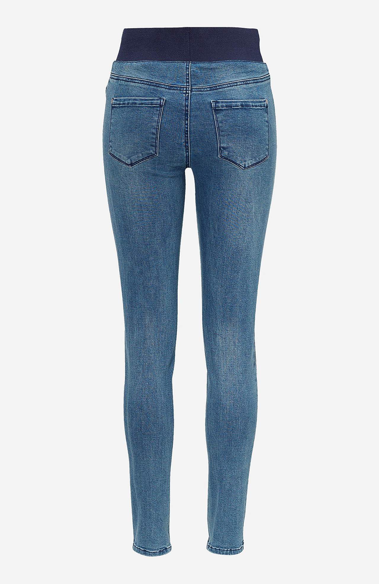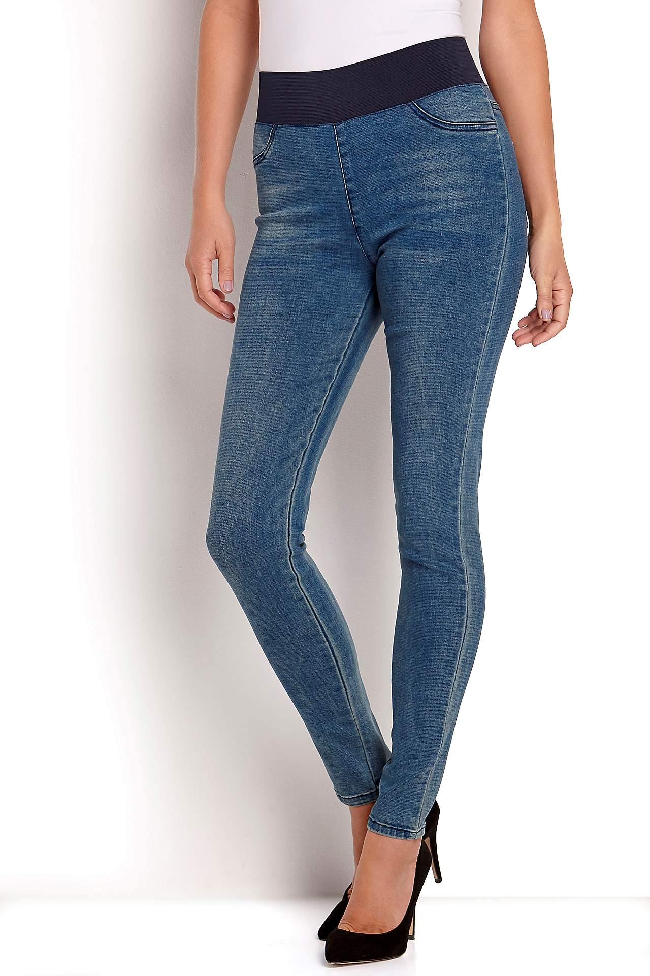 Skinny model s nohavicemi v plné délce. Pohodlná denimová kvalita s extra strečem. Vysoký pás s extra širokou a pohodlnou gumou. Falešné kapsy vpředu. Pravé kapsy vzadu. Středně modrá a krásná barva. Přední část po rozkrok: přibližně 29 cm. Délka vnitřního švu: přibližně 80 cm.