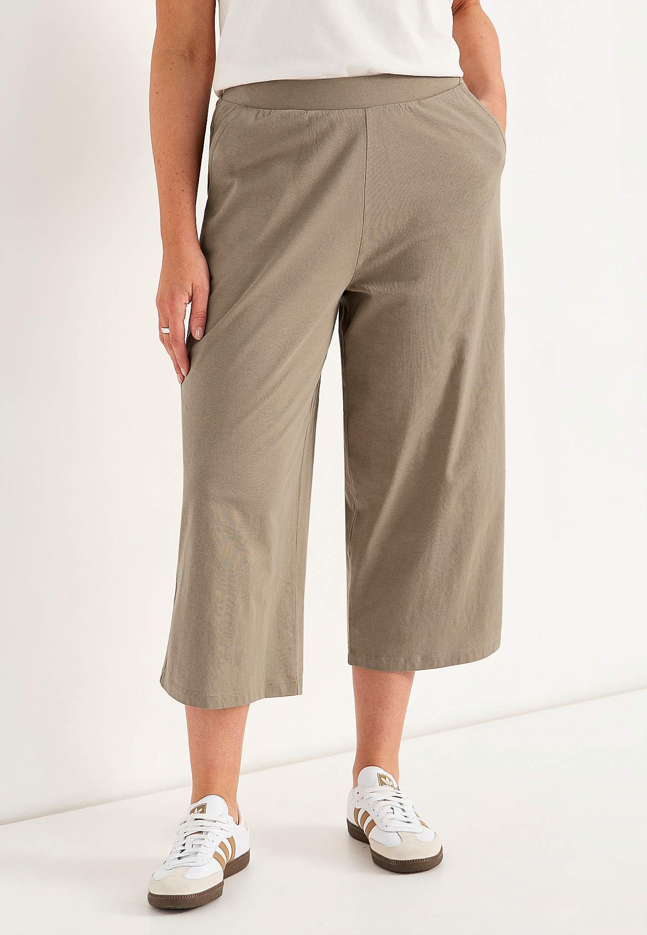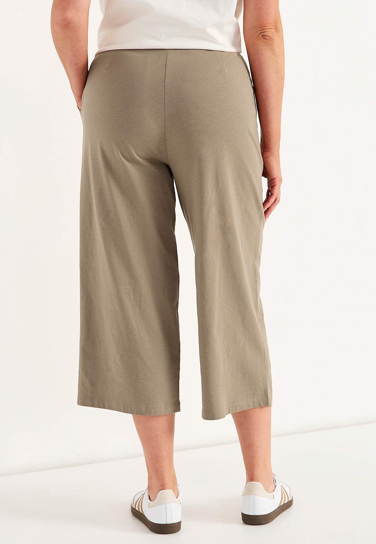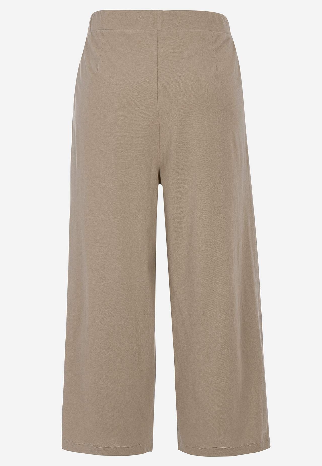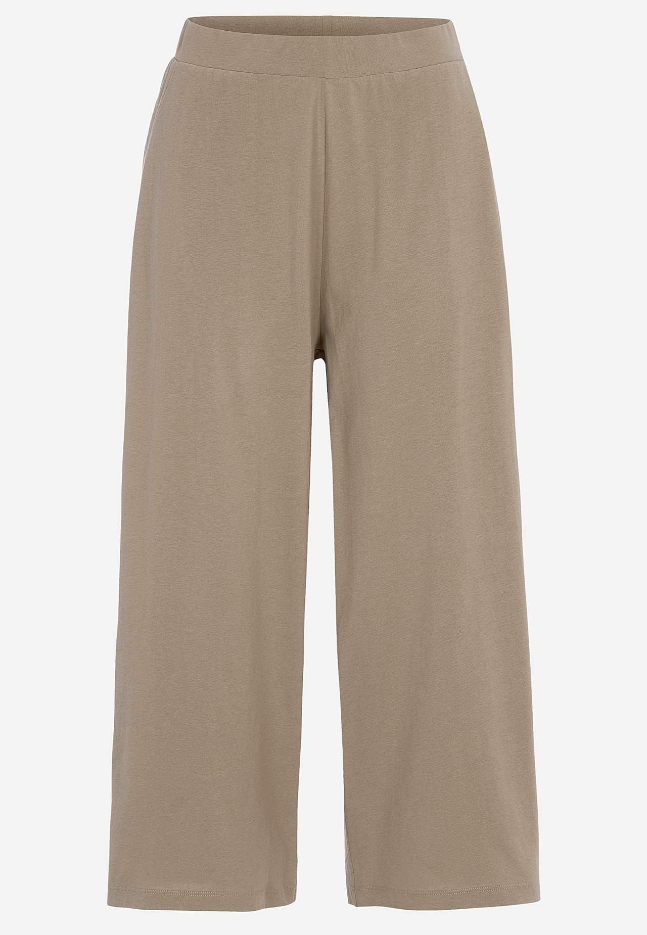 Kulotky z měkké a organické bavlny. Žerzejové kalhoty se širokými a rovnými nohavicemi. Ležérní střih. Vysoký pas se širokým a pohodlným elastickým pásem. Šikmé postranní kapsy. Kombinujte s 702634. Vnitřní délka nohavice se odvíjí od velikosti, cca 57-59 cm. Střih přední části se liší podle velikosti: přibližně 72-84 cm.