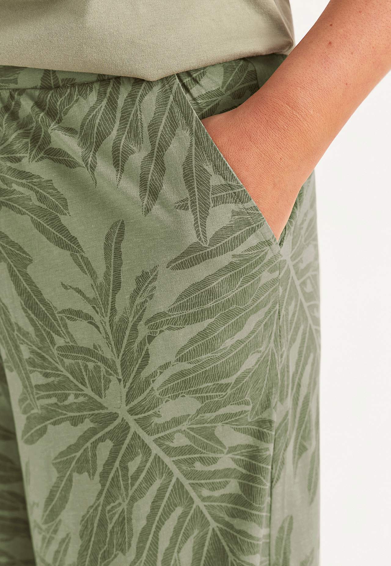 Kulotky z měkké a organické bavlny. Žerzejové kalhoty se širokými a rovnými nohavicemi. Ležérní střih. Vysoký pas se širokým a pohodlným elastickým pásem. Šikmé postranní kapsy. Kombinujte s 702634. Vnitřní délka nohavice se odvíjí od velikosti, cca 57-59 cm. Střih přední části se liší podle velikosti: přibližně 72-84 cm.