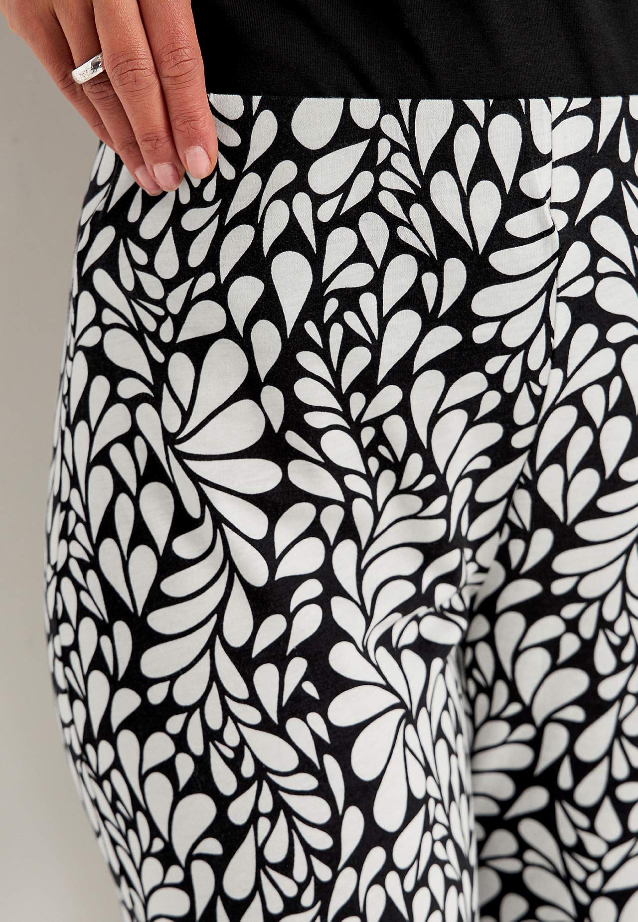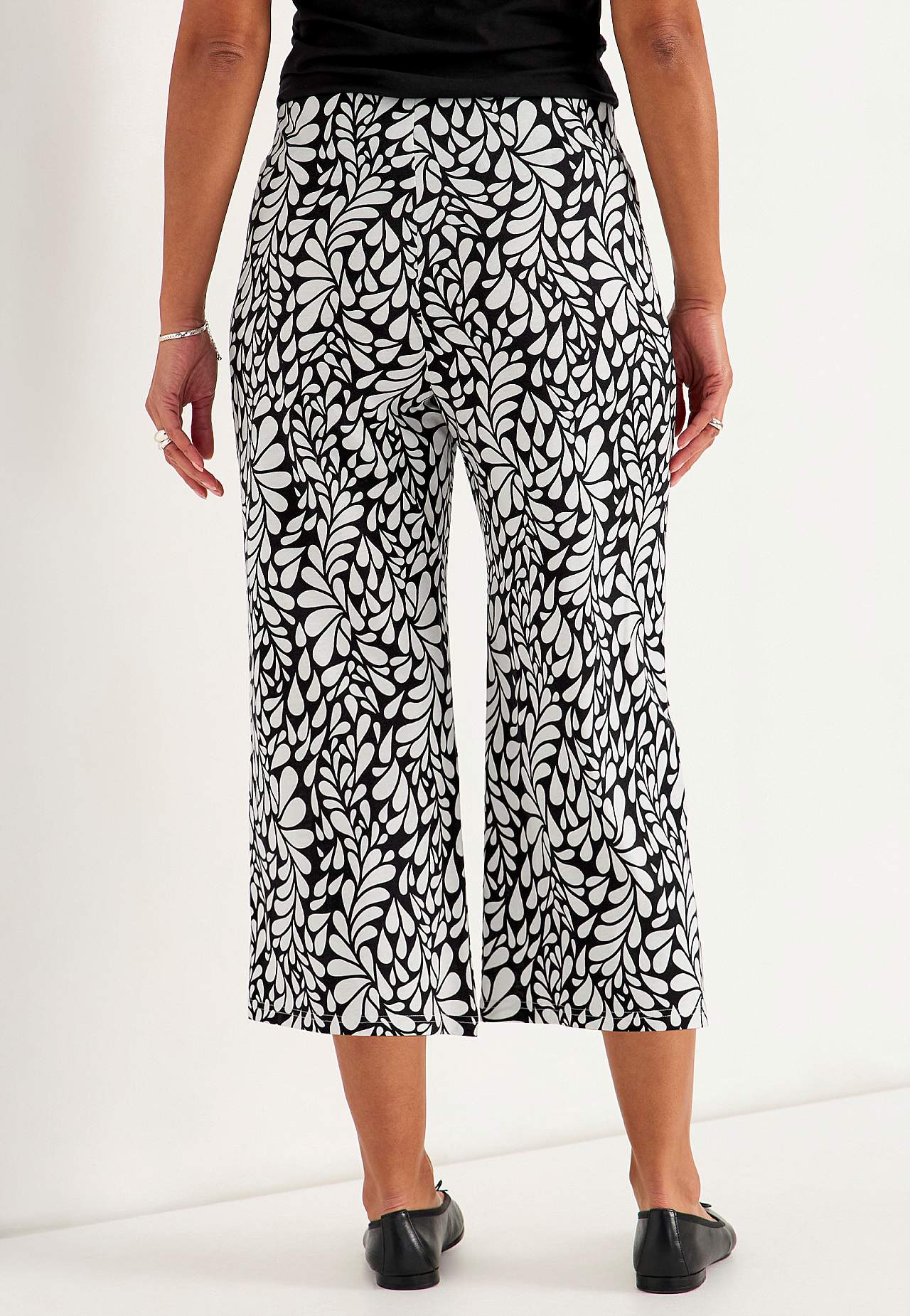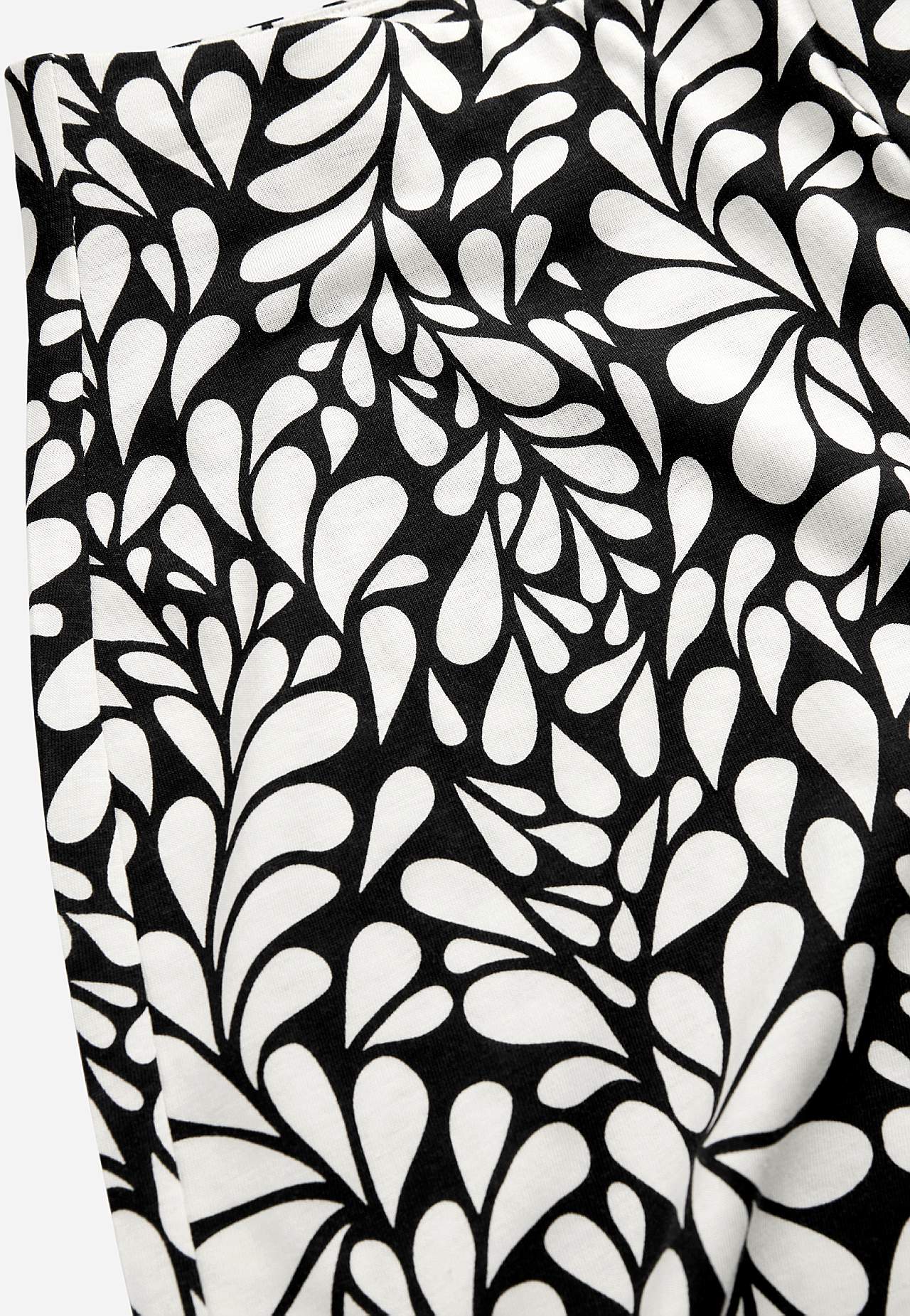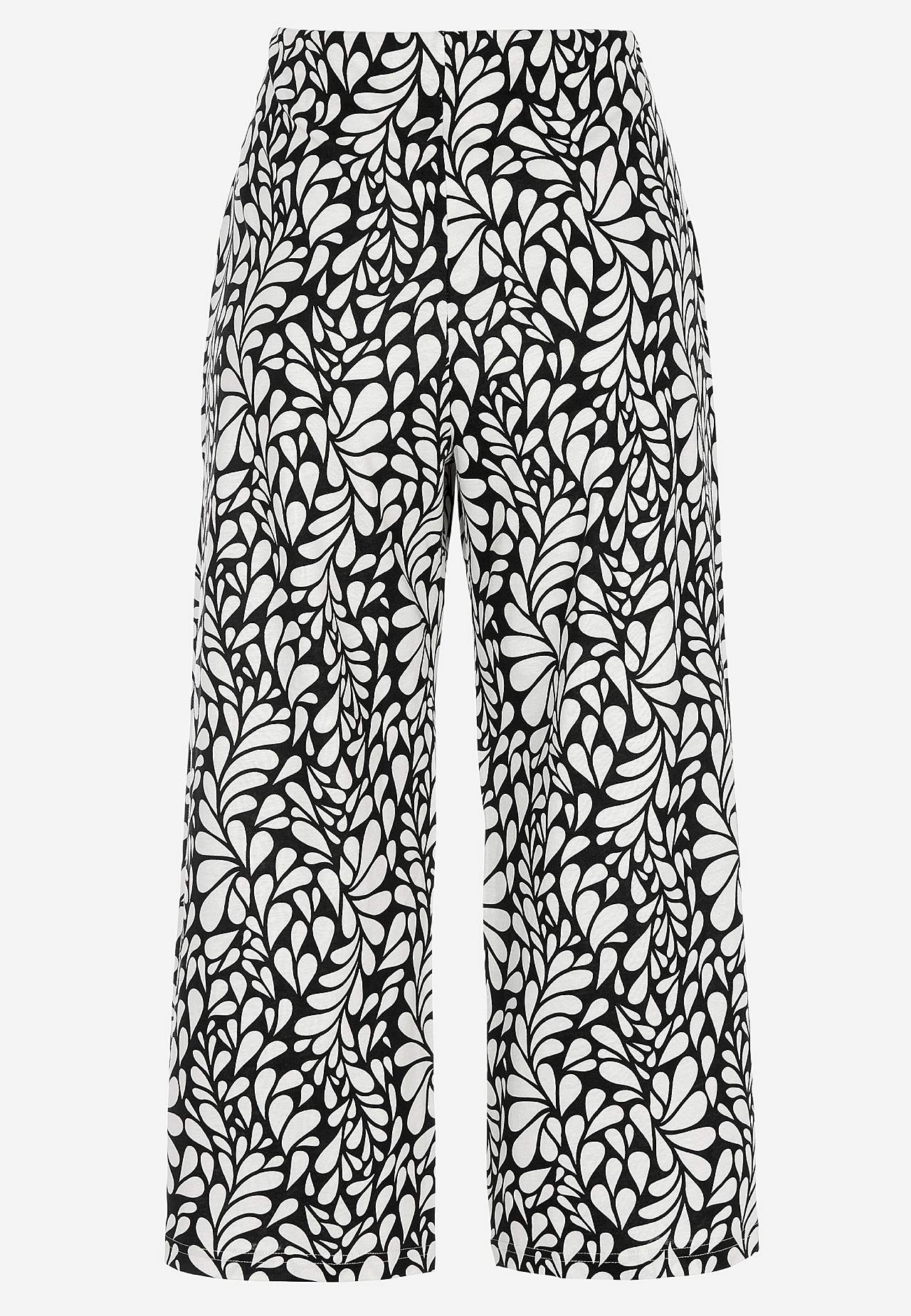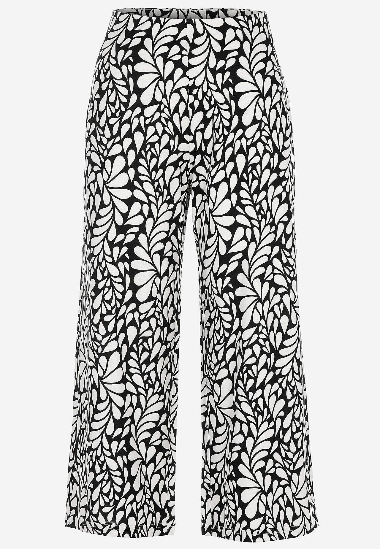 Kulotky ze směsi bavlny a viskózy. Měkká a elastická kvalita. Volný střih. Vysoký pas se širokým a pohodlným elastickým pásem. Široké a rovné nohavice. Kombinujte s 702556, 702638. Vnitřní délka nohavice cca 58 cm ve všech velikostech. Střih přední části se liší podle velikosti: přibližně 72-84 cm.
