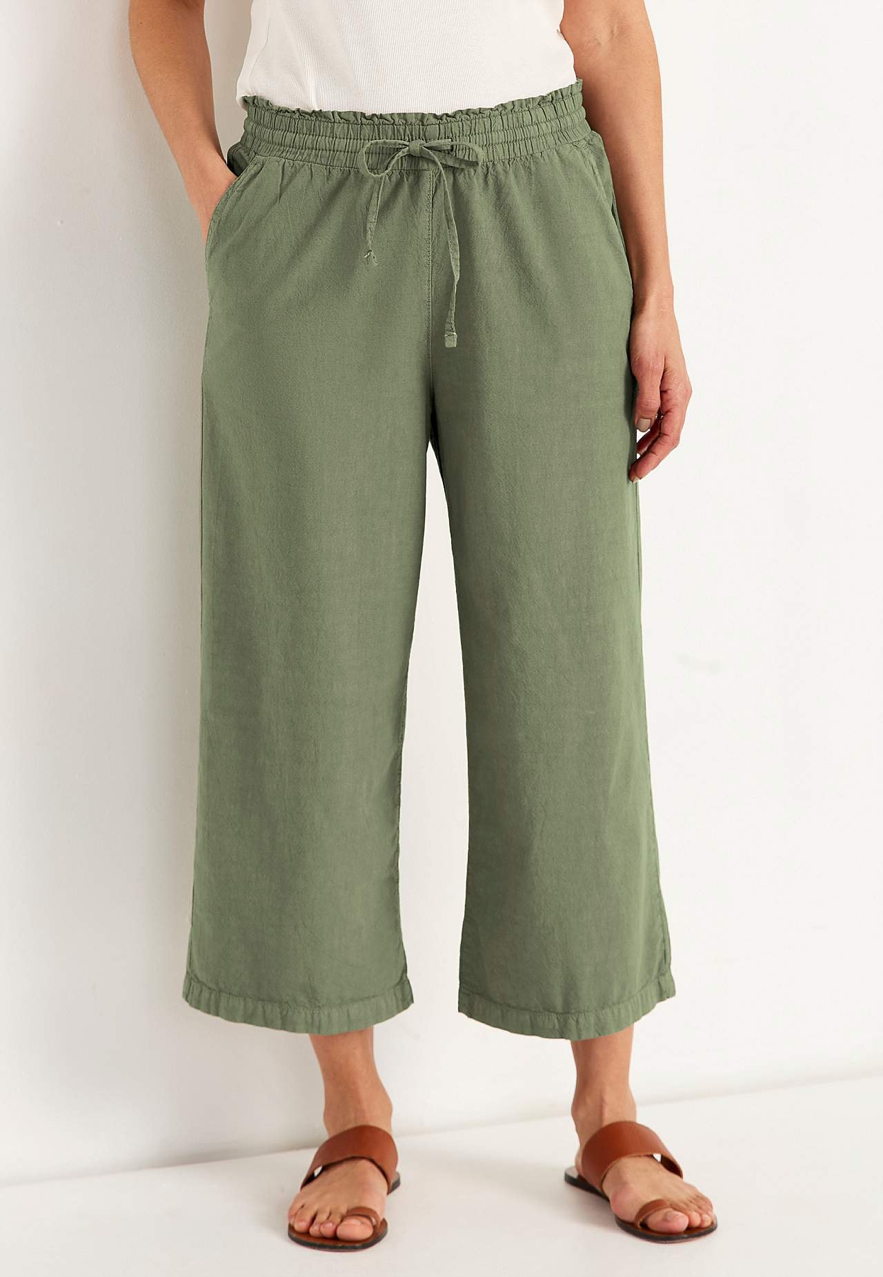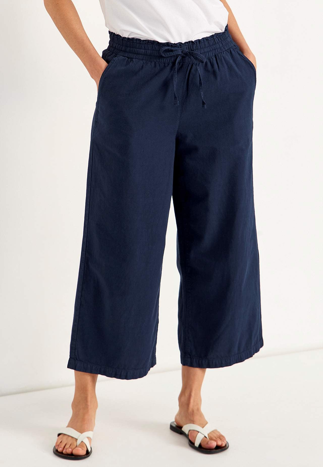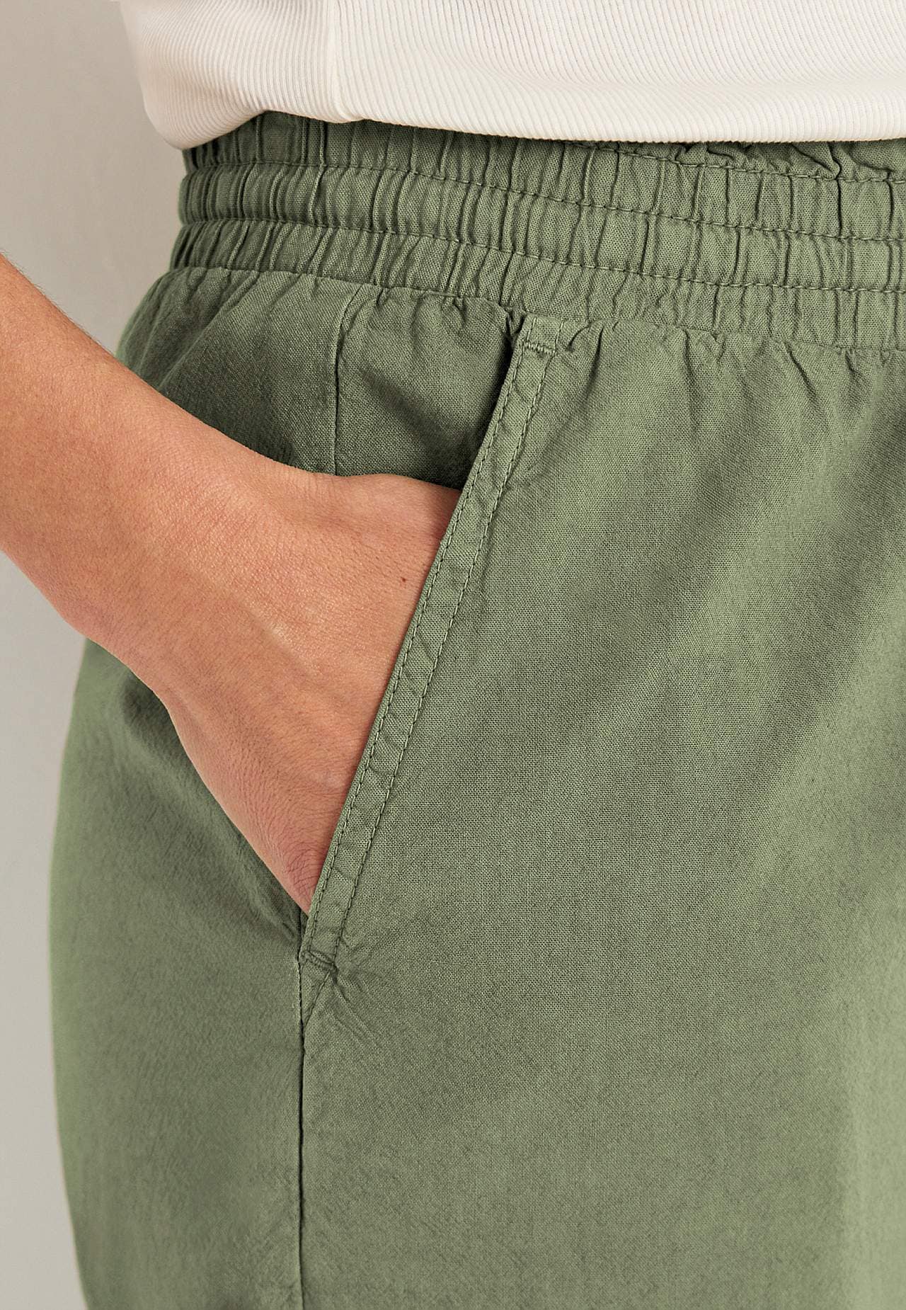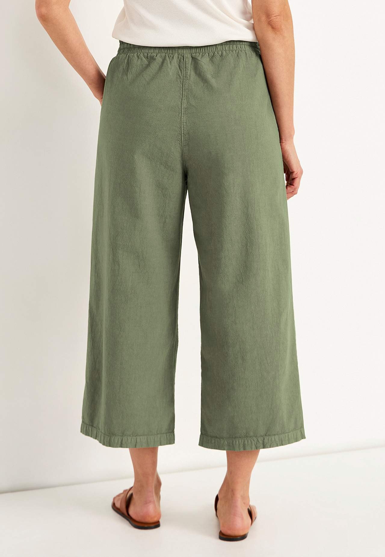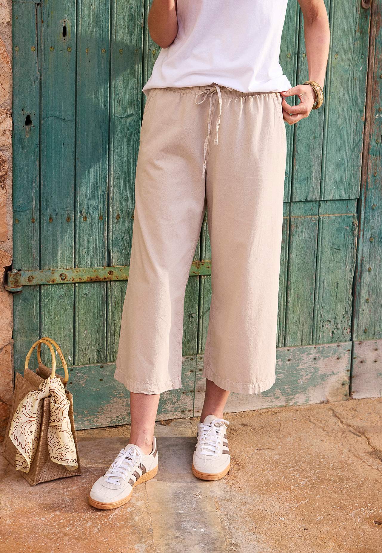 Uvolněné cullotes kalhoty. Tkaný materiál ze seprané a přizpůsobivé bavlny s přírodním pocitem. Volný střih. Pohodlný a elastický pás se stahovací šňůrou. Šikmé přední kapsy. Široké a rovné nohavice. Vnitřní délka nohavice cca 57 cm ve všech velikostech. Střih přední části se liší podle velikosti: přibližně 72-84 cm.