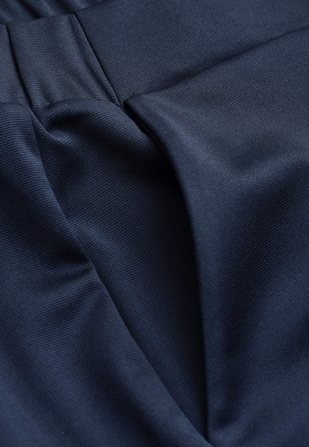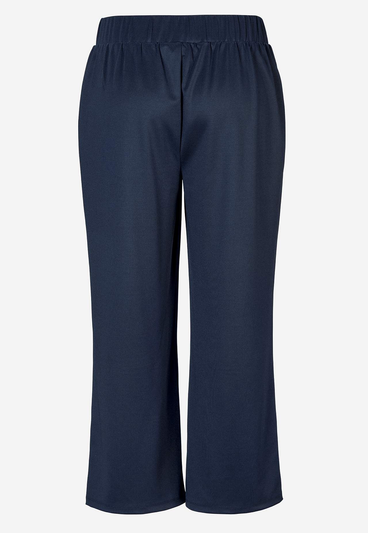 Kalhoty ke kotníkům se širokými nohavicemi. Elastický a hladký žerzej s hezkým leskem. Široký pas se skrytou gumou vzadu. Postranní švové kapsy. Vnitřní délka nohavice cca 62 cm ve všech velikostech. Střih přední části se liší podle velikosti: přibližně 72-84 cm.