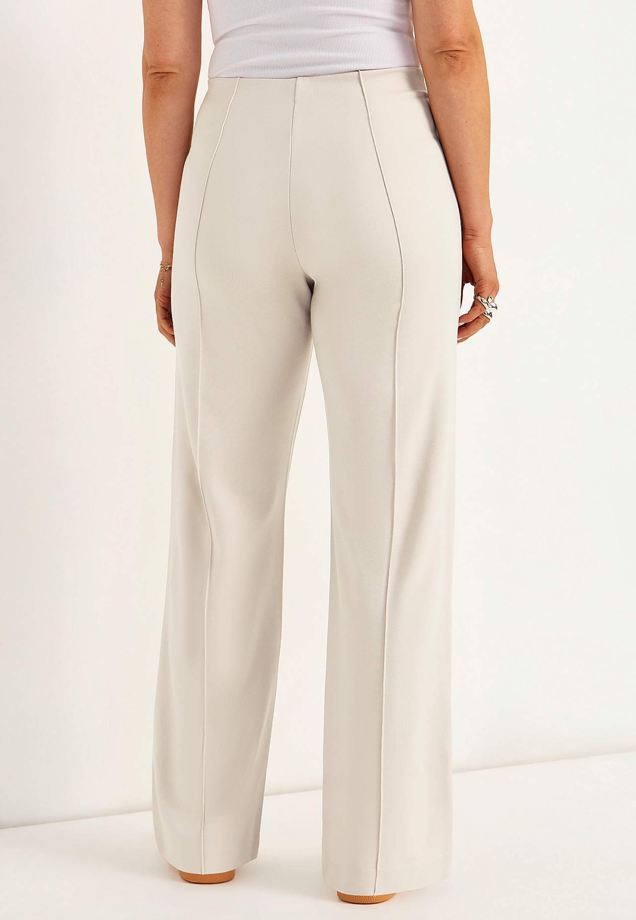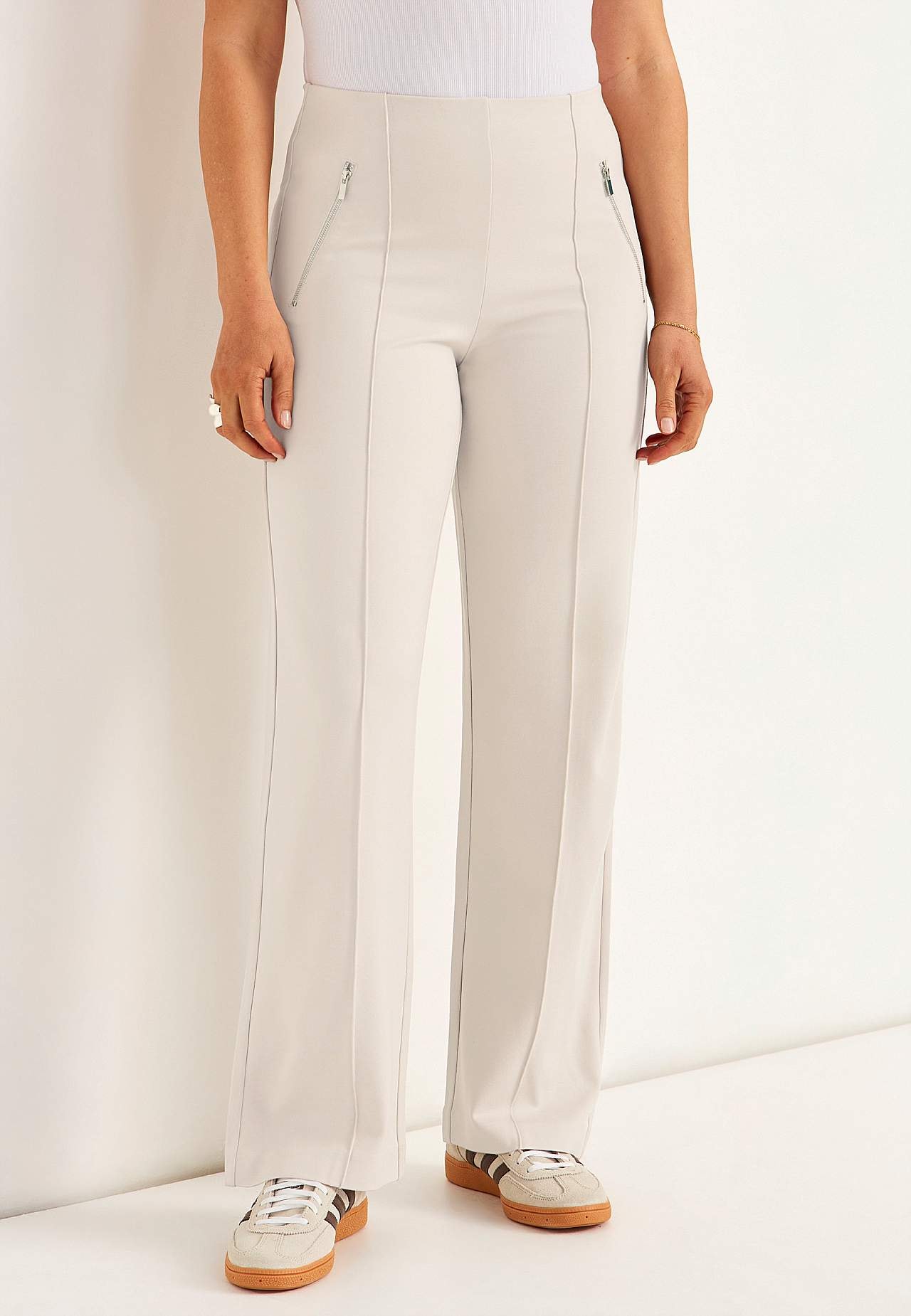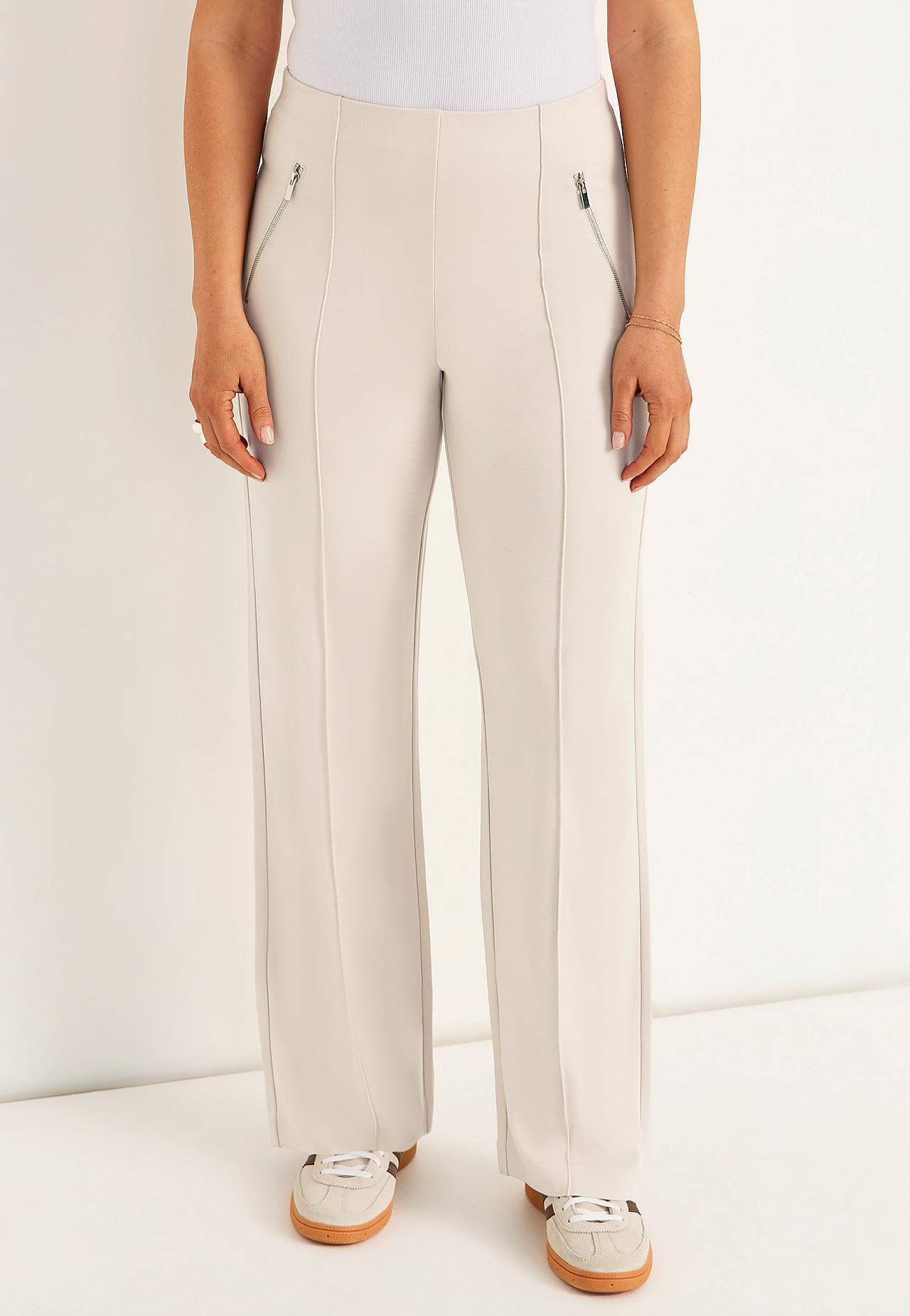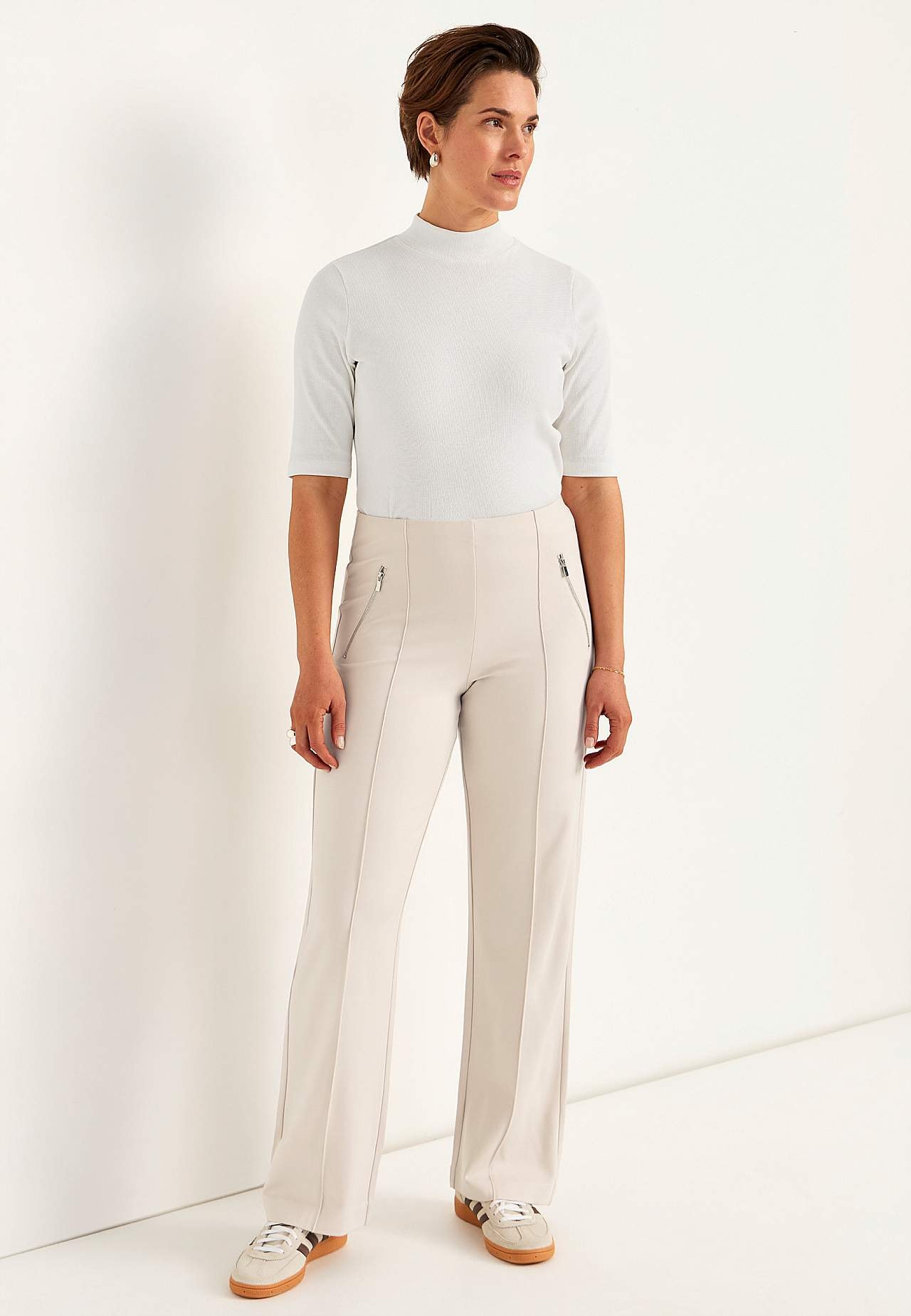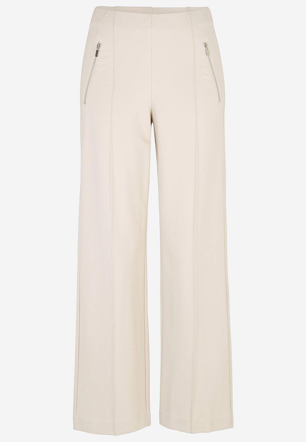 Kalhoty z pevného a roztažitelného trikotu v plné délce se šitými puky. Měkký a přizpůsobivý materiál s hezkou splývavosytí. Klasický střih s rovnými a širokými nohavicemi. Běžný pas se skrytou gumou. Dekorativní zipy vpředu. Šité puky v přední i zadní části. Vnitřní délka nohavice cca 78 cm ve všech velikostech. Střih před... Přečtěte si více