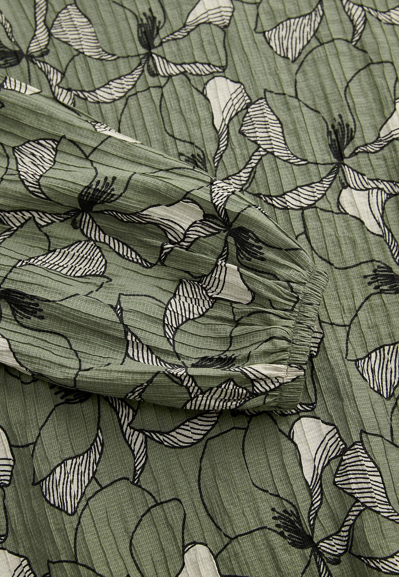 Strukturovaná blůza z měkké viskózy. Tkanina s výraznými pruhy. Klasický střih. Kulatý výstřih s malým výstřihem do V. Zaoblený a mírně prodloužený v zadní části lem. Vzadu sedlo. Délka se odvíjí od velikosti, cca 66-78 cm od ramene.