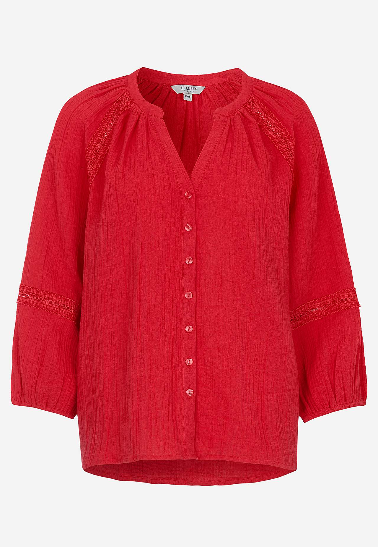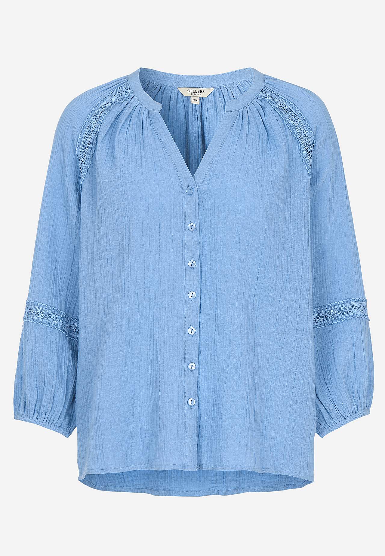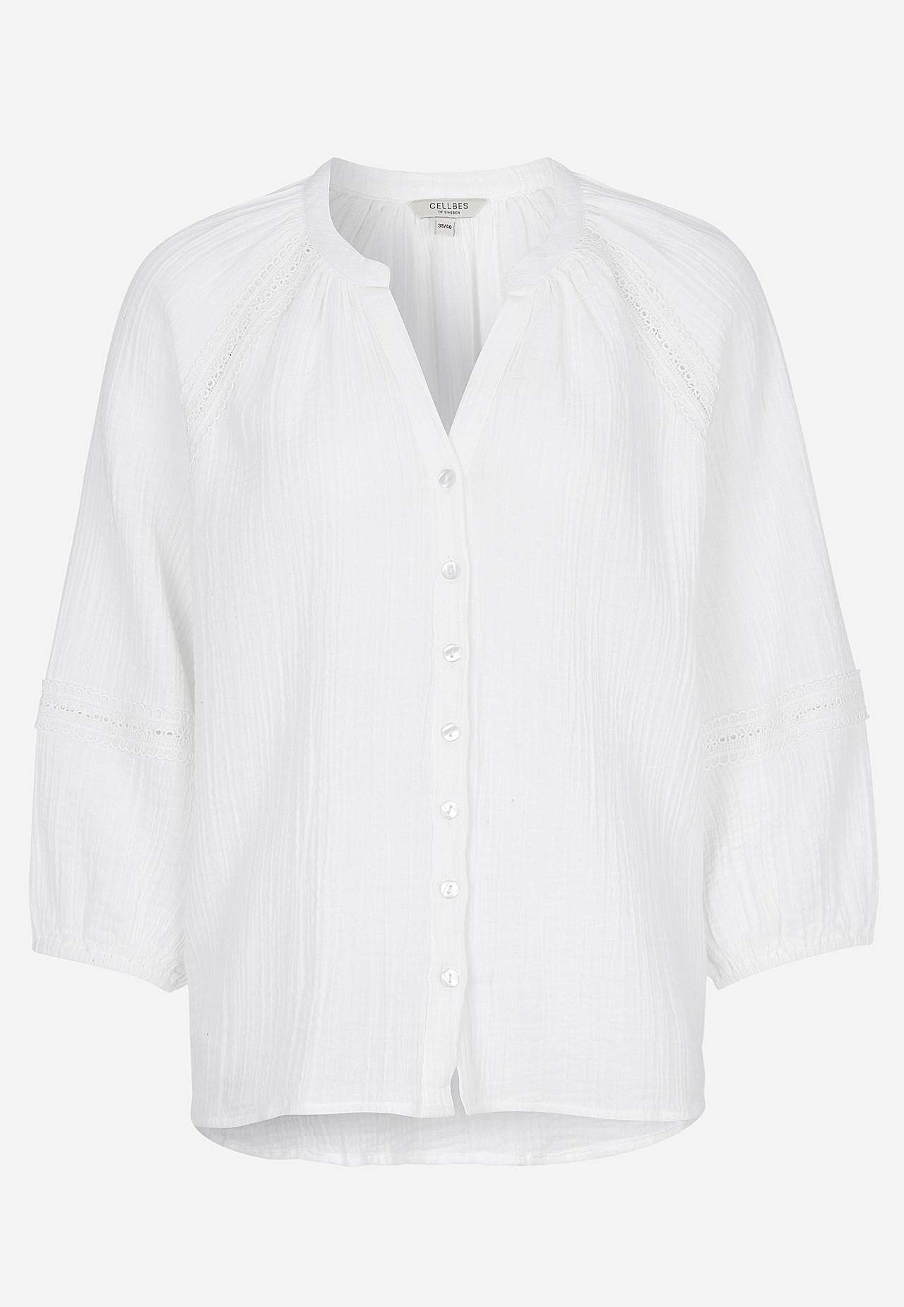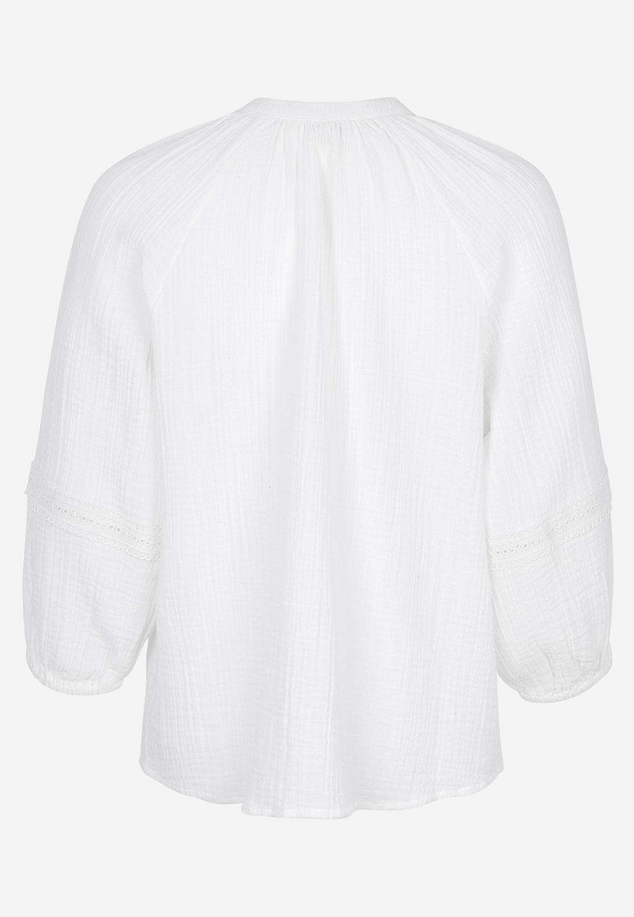 Vzdušná blůza s hezkými krajkovými olemováními na rukávech. Tkaný materiál z půvadného bavlněného mušelínu se strukturou. Volný střih. Kulatý krk s malým střihem výstřihu do V. Knoflíky na zapínání vpředu. Široké raglánové rukávy s 3/4 délkou, nafouknutím a gumou na manžetách. Jemně zdobená krajková lemovka podél raglánovéh... Přečtěte si více