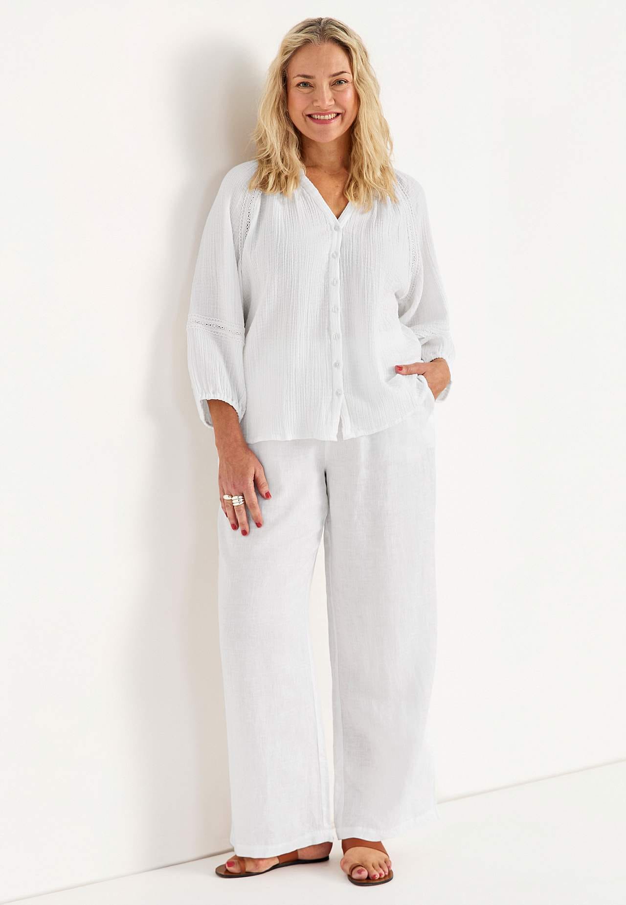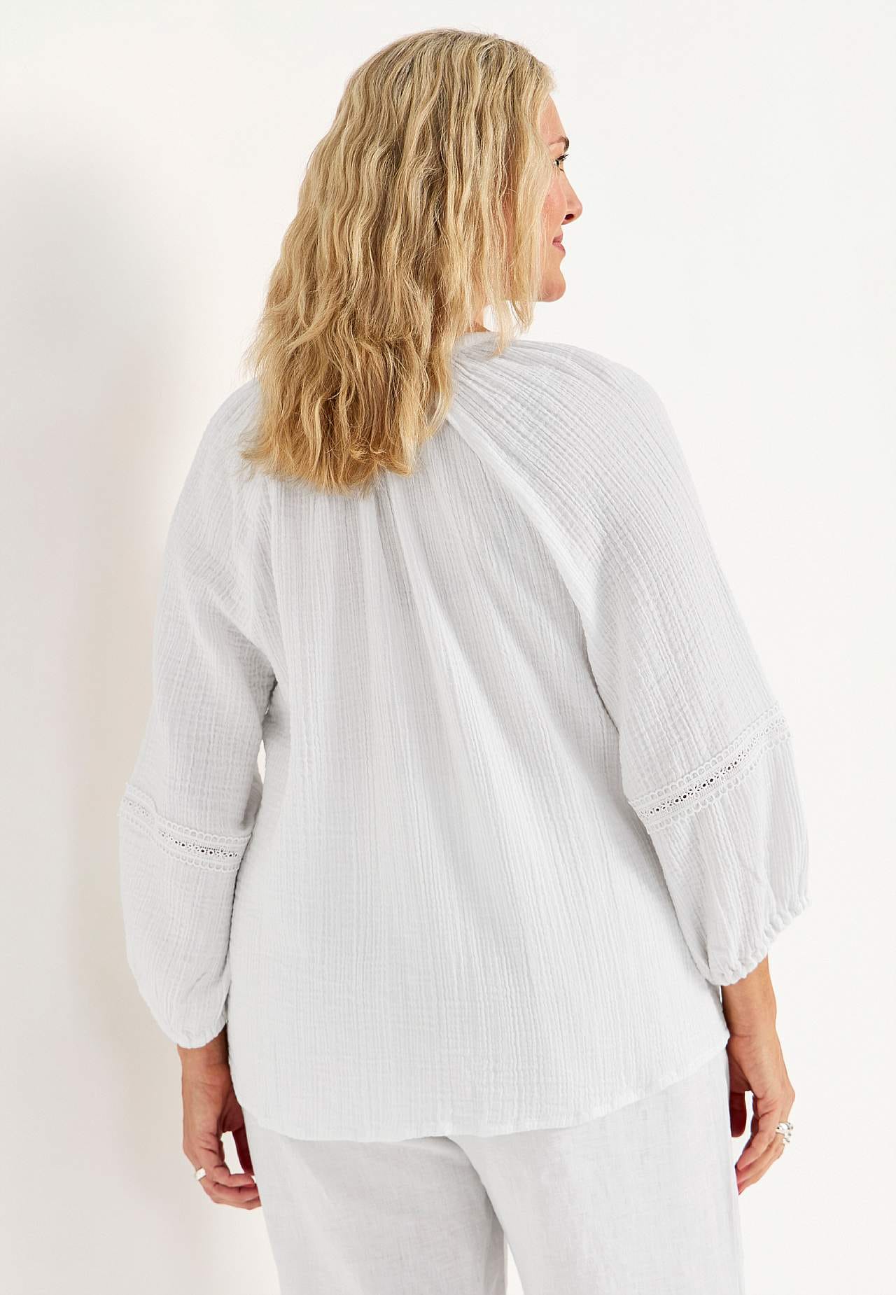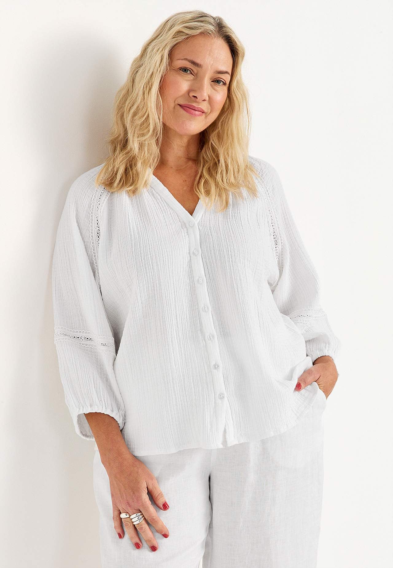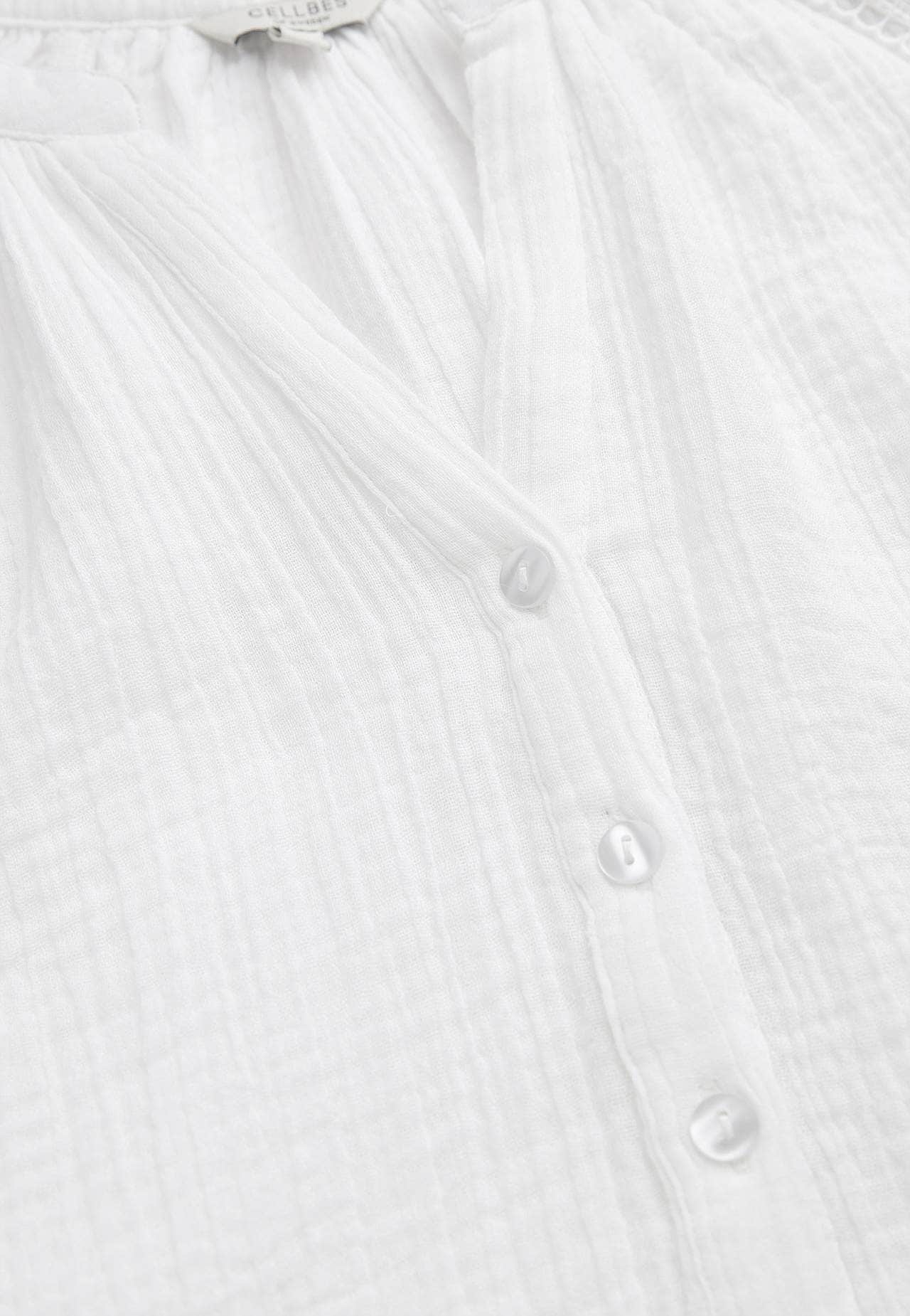 Vzdušná blůza s hezkými krajkovými olemováními na rukávech. Tkaný materiál z půvadného bavlněného mušelínu se strukturou. Volný střih. Kulatý krk s malým střihem výstřihu do V. Knoflíky na zapínání vpředu. Široké raglánové rukávy s 3/4 délkou, nafouknutím a gumou na manžetách. Jemně zdobená krajková lemovka podél raglánovéh... Přečtěte si více