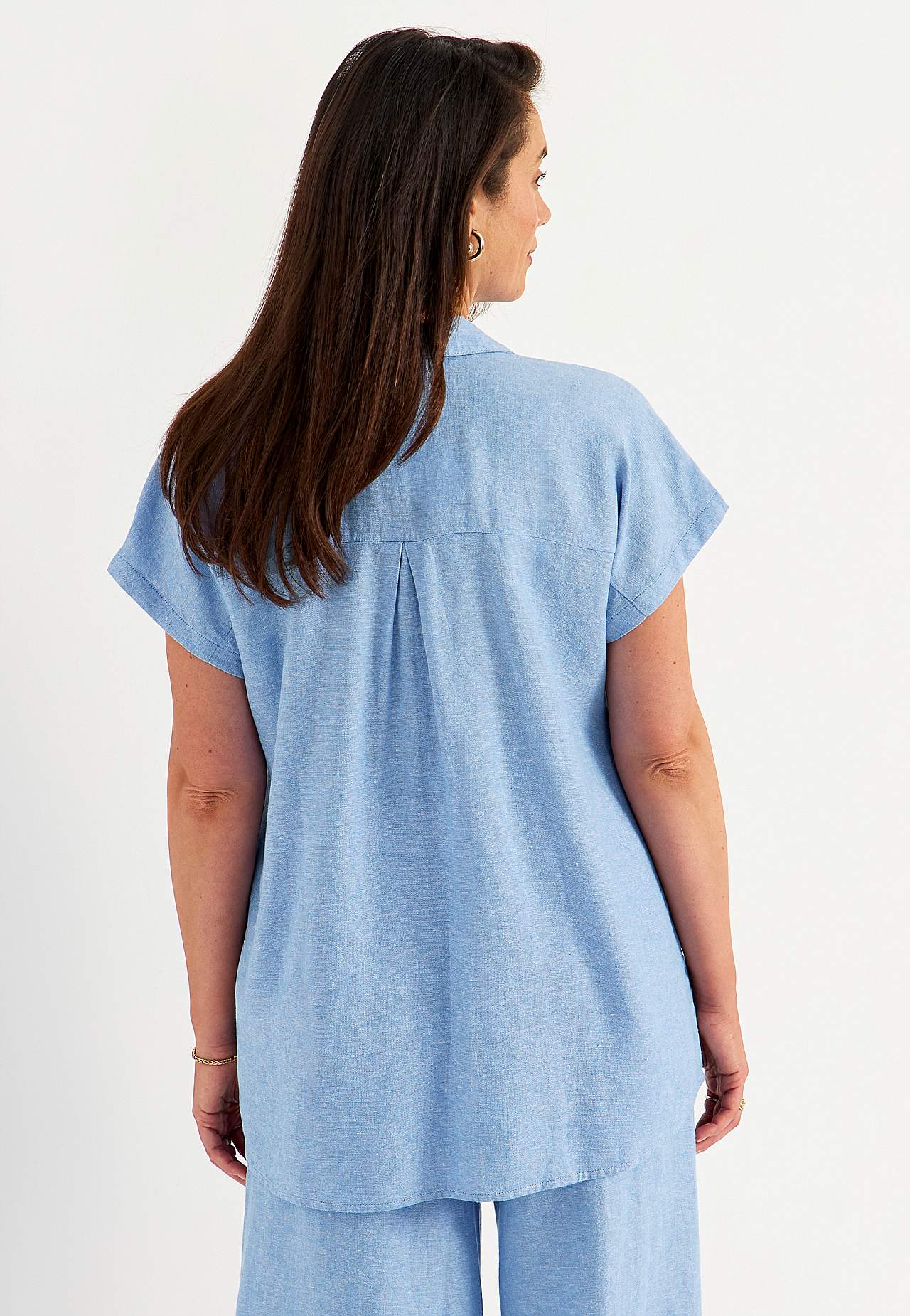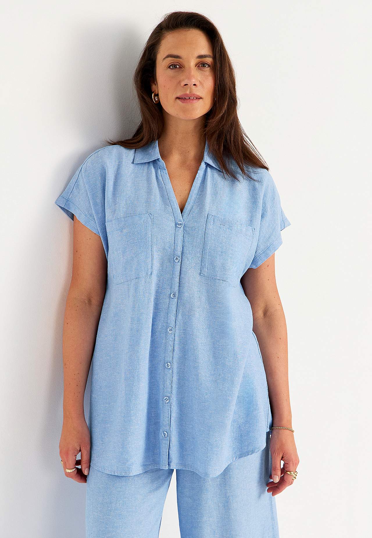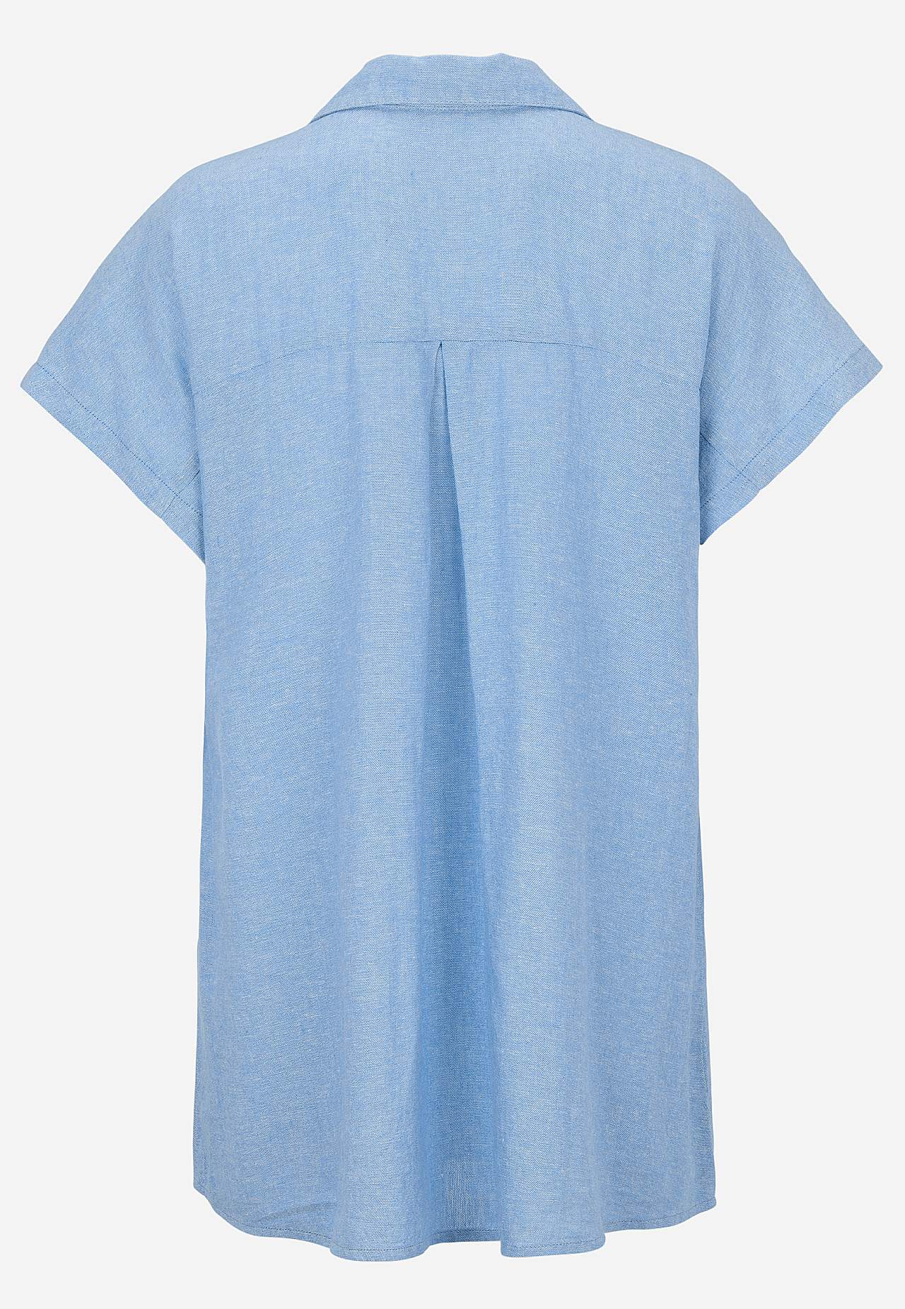 Tkaná dlouhá košile z vzdušné směsi lnu a viskózy. Měkký a mírně těžší materiál s přírodní strukturou. Ležérní střih. Náprsní kapsy. Sedlo vzadu s dekorativním plisé. Zaoblený lem. Vzadu sedlo. Délka se odvíjí od velikosti, cca 77-84 cm od ramene.