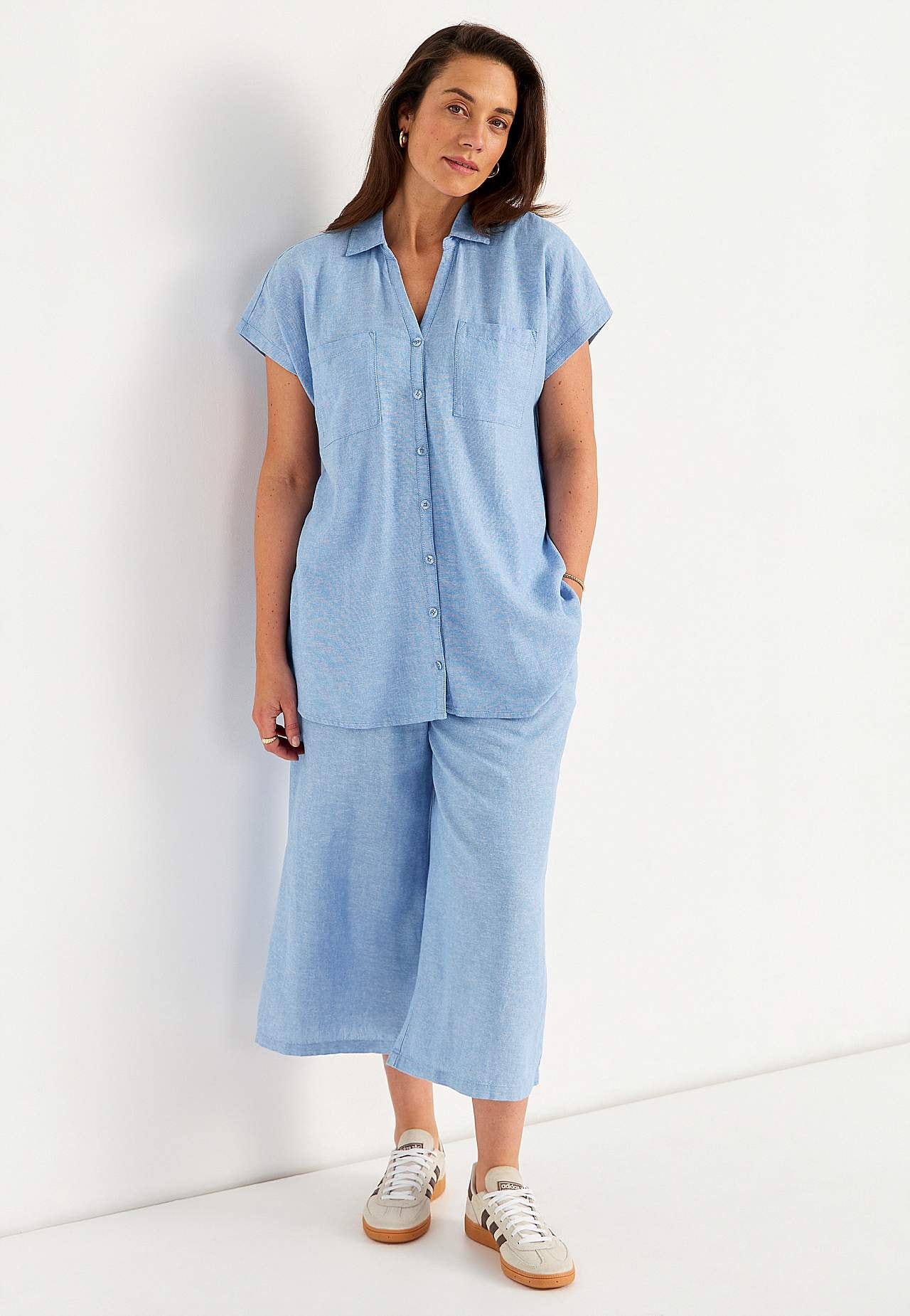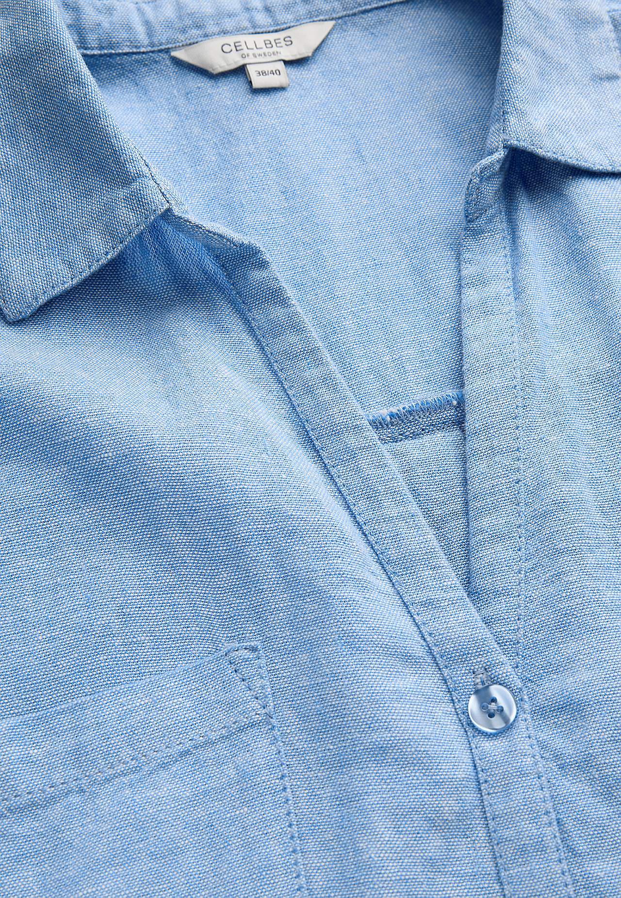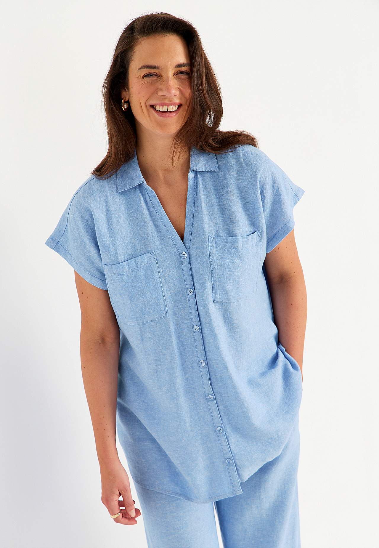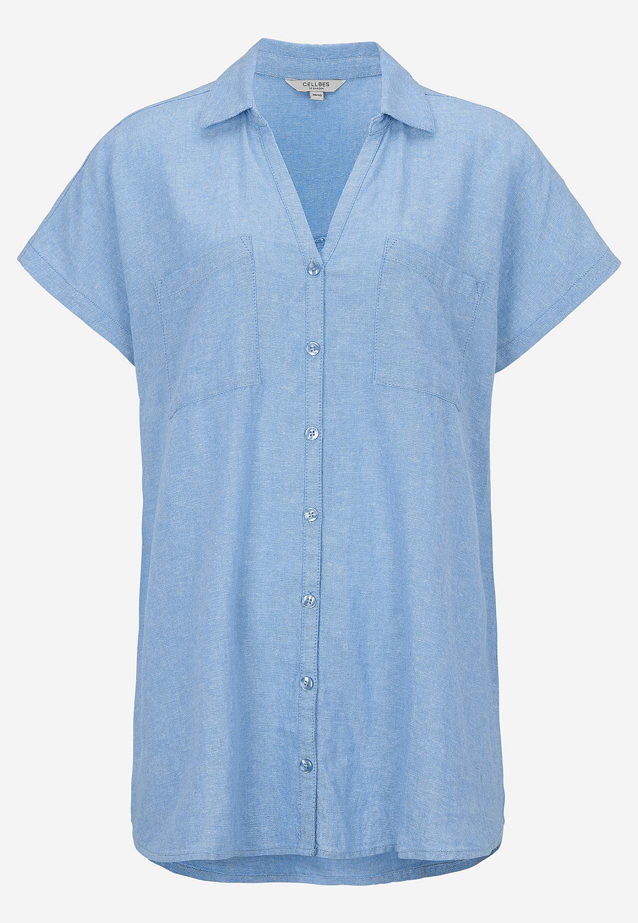 Tkaná dlouhá košile z vzdušné směsi lnu a viskózy. Měkký a mírně těžší materiál s přírodní strukturou. Ležérní střih. Náprsní kapsy. Sedlo vzadu s dekorativním plisé. Zaoblený lem. Vzadu sedlo. Délka se odvíjí od velikosti, cca 77-84 cm od ramene.