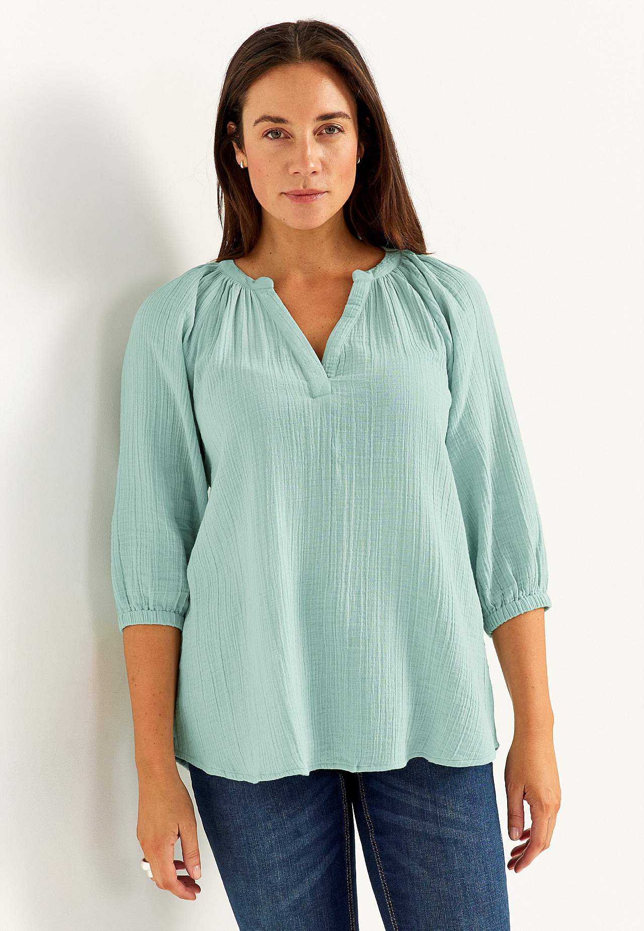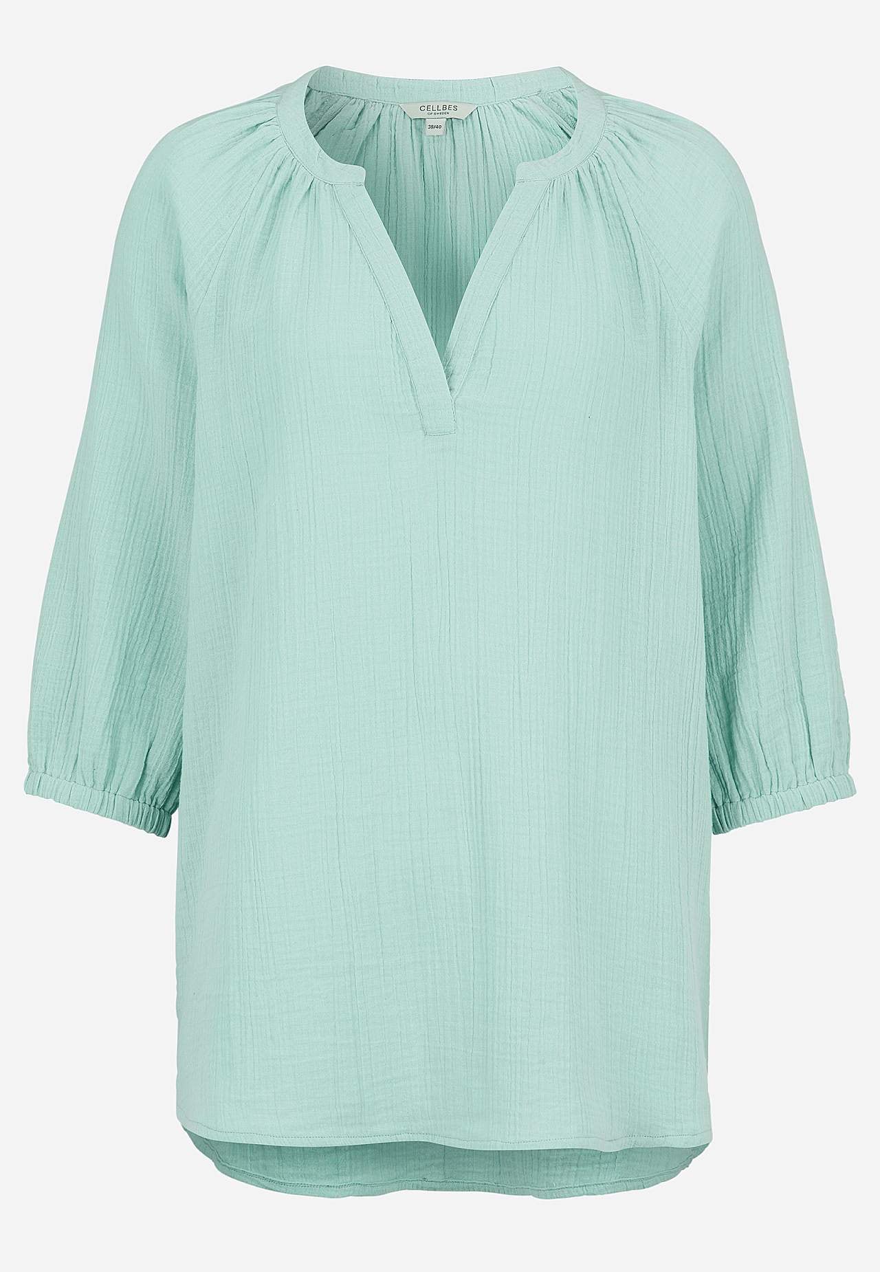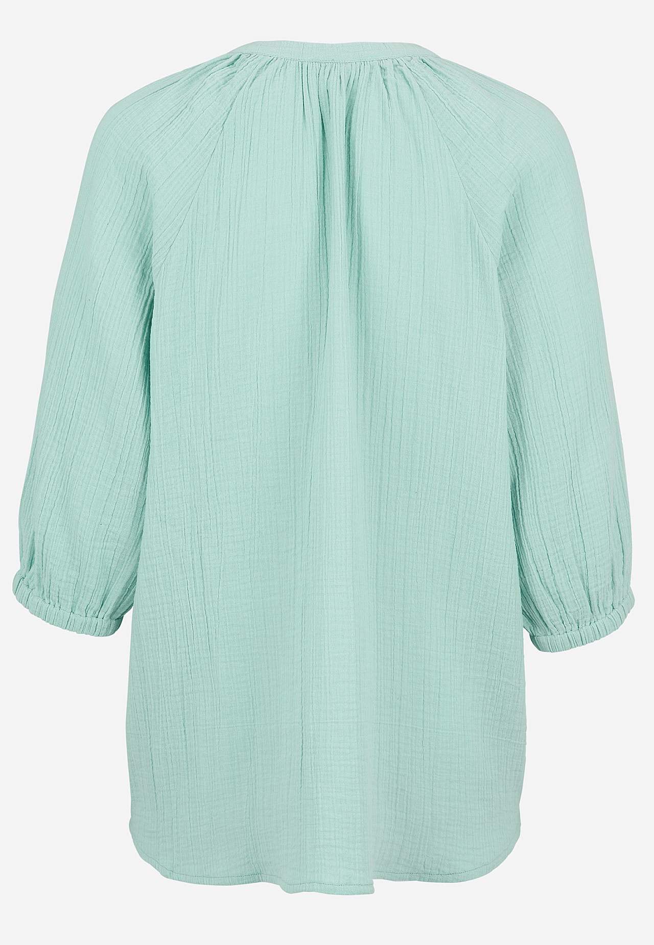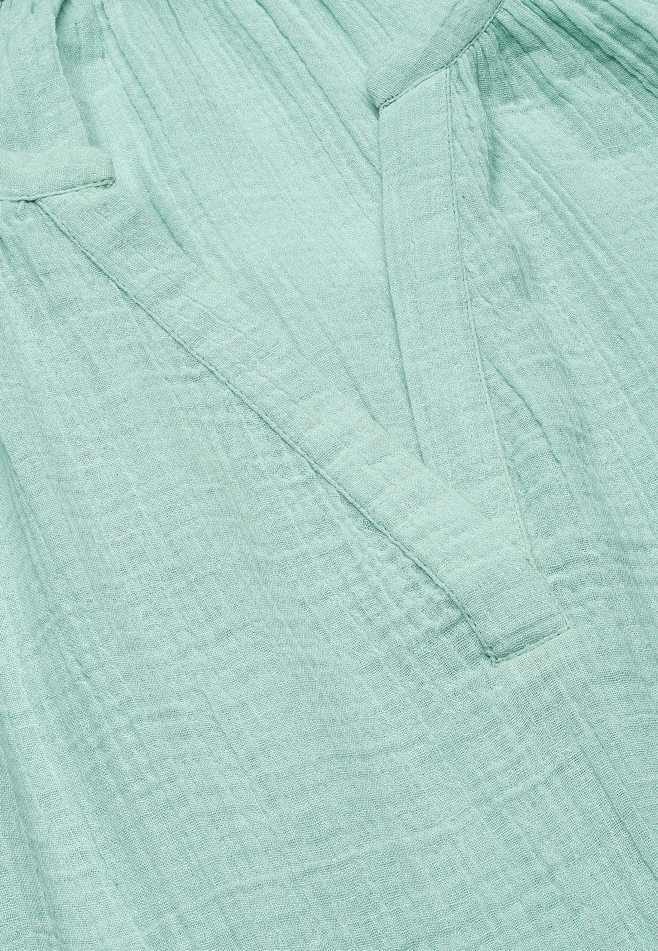Tunika z půvadného bavlněného mušelínu s přírodní strukturou. Tkaný a měkký materiál s chladicím a vzdušným dotykem. Jemně tvarovaný do A a volný střih. Překrývající se krk se střihem výstřihu do V. Zaoblený a mírně prodloužený v zadní části lem. Vzadu sedlo. Délka se odvíjí od velikosti, cca 73-80 cm od ramene.