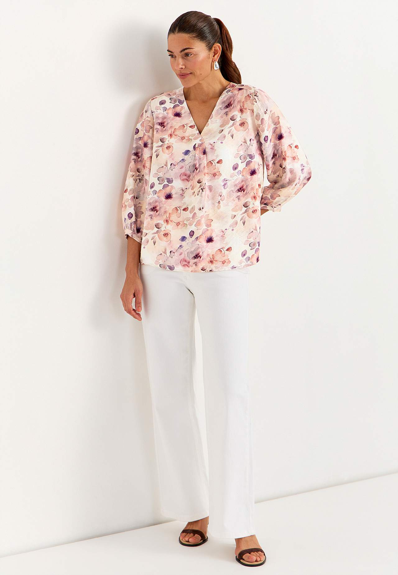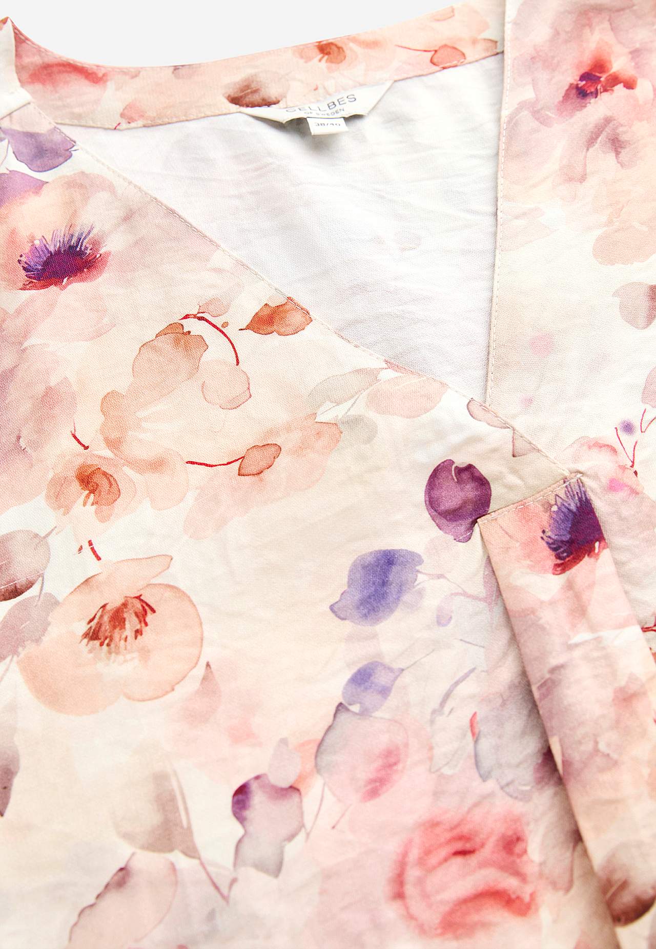 Elegantní party blůza z chladicího směsi viskózy s hezkým řasením. Materiál s mírnou strukturou. Stylová k džínům i sukním. Klasický střih. Krk s překrývajícím se střihem výstřihu do V a hezký plisé vpředu. Jemně zakulacený lem. Délka zad se odvíjí od velikosti, cca 63-71 cm.