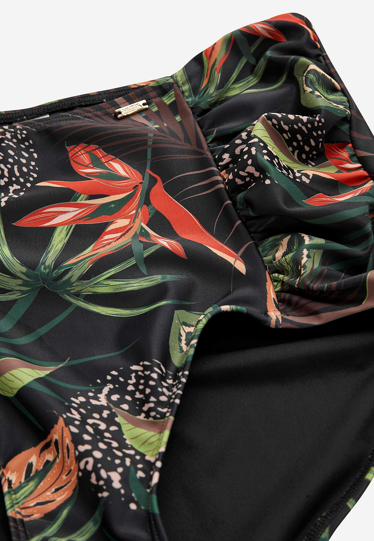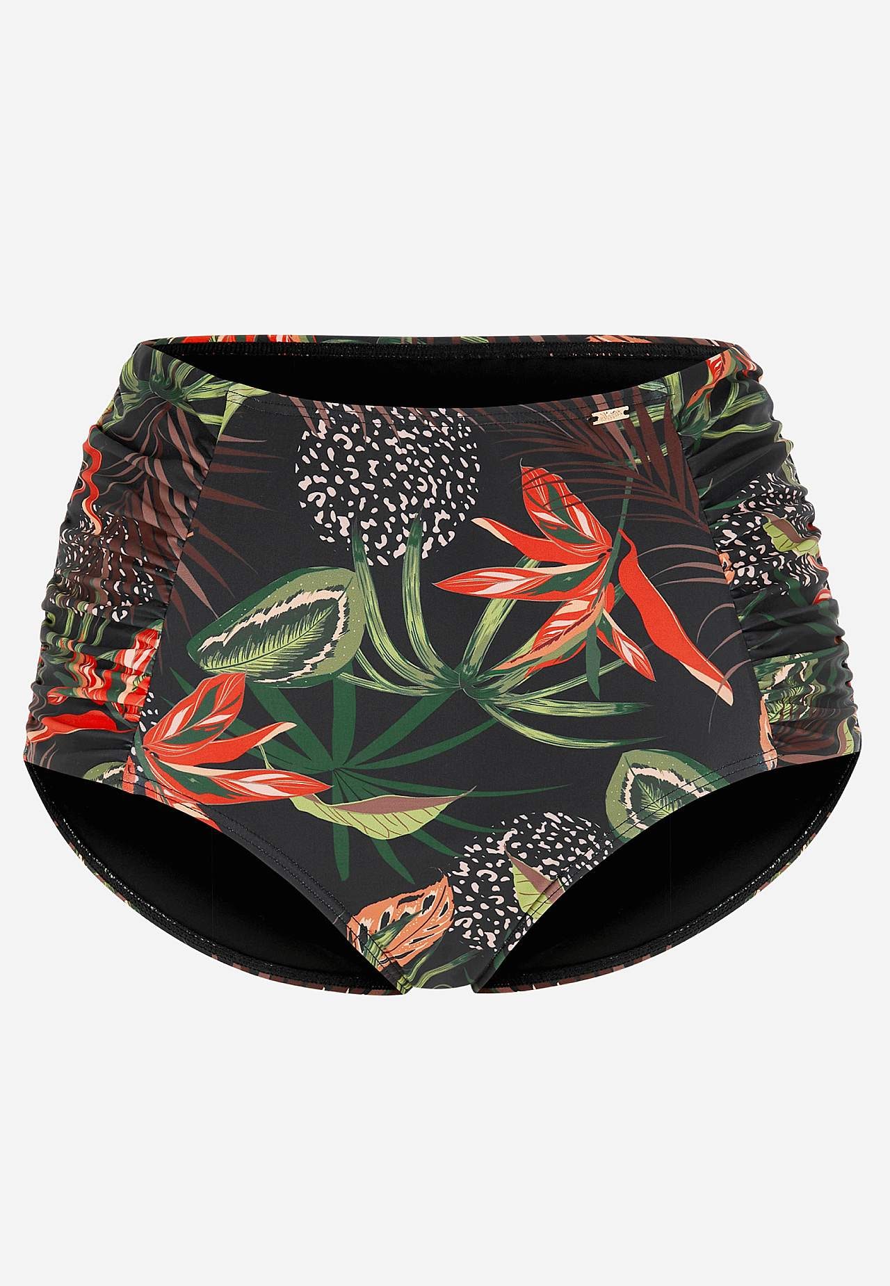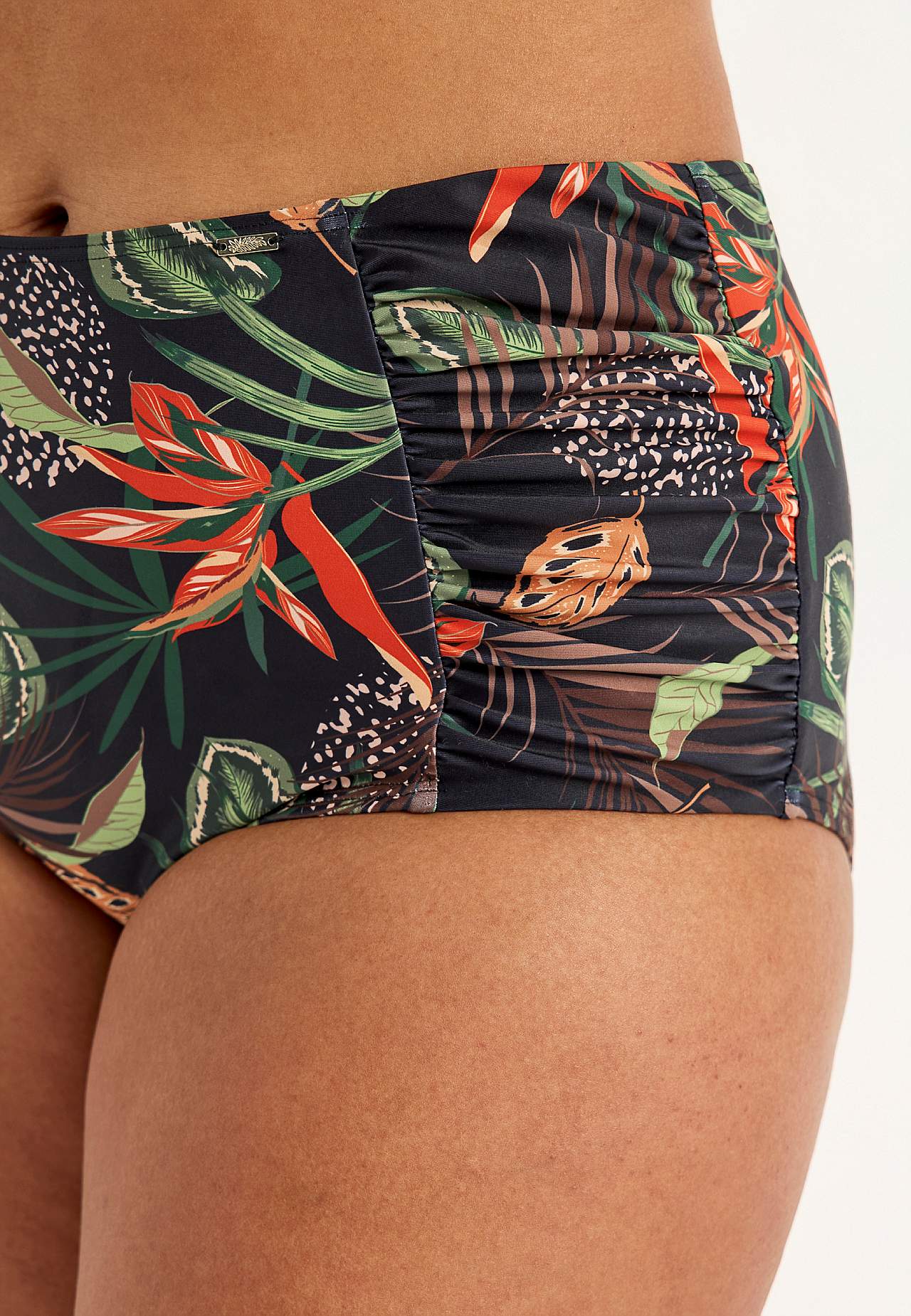 Spodní díl bikin z recyklovaného polyesteru. Vysoký pas. Krásný vzor v přední i zadní části. Dekorativní řasení na stranách. Plně podšitý vnitřek.