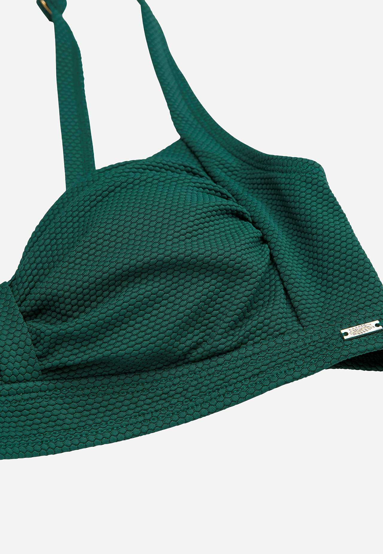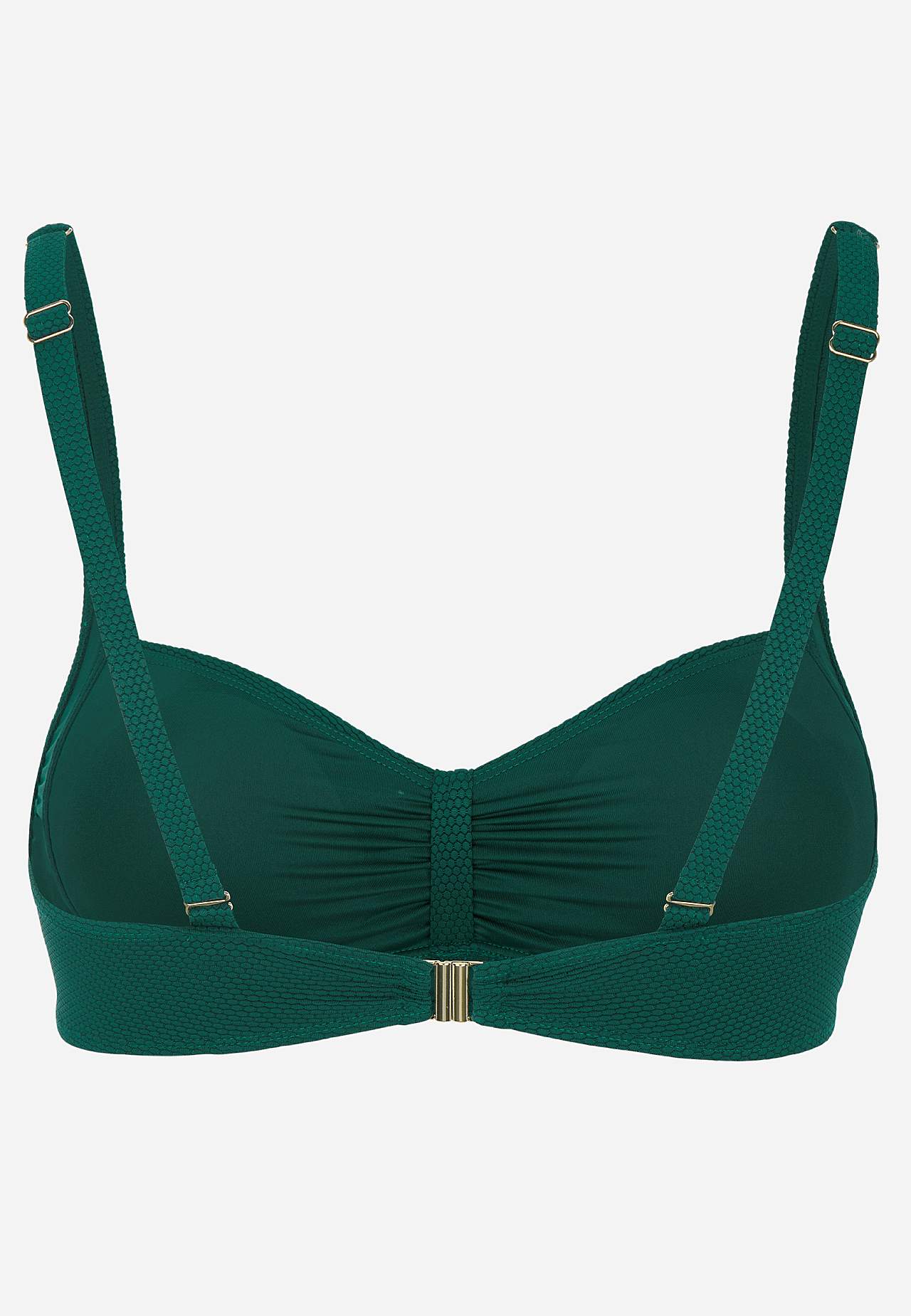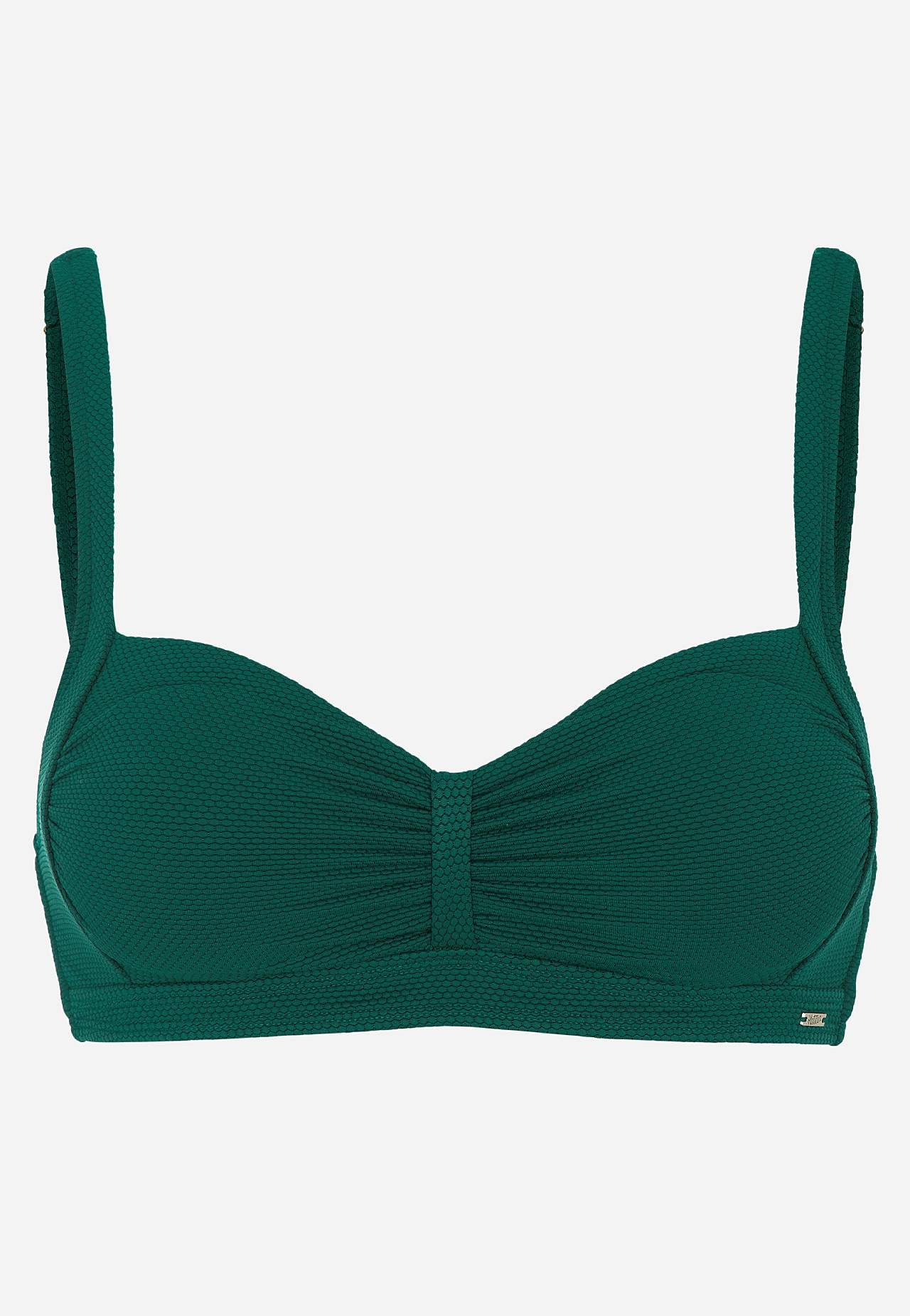 Strukturálně vzorovaný vrchní díl plavek s nabíráním přes prsa. Měkký a bezdrátový model s podpěrnými tyčkami na stranách. Materiál z recyklovaného polyesteru. Košíček se snímatelnou vycpávkou. Nastavitelné ramenní popruhy. Jednoduše zapínatelné kovové zapínání vzadu.