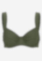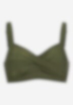Plavkové šaty s dekorativním detailem překroucení vpředu a jednolitou barvou. Šitá vyztužená podprsenka. Mírně širší ramínkový řemínek. Spodní část s překrývaným designem. Podšitý klínek. U velikosti 40 délka vzadu uprostřed cca 55 cm.