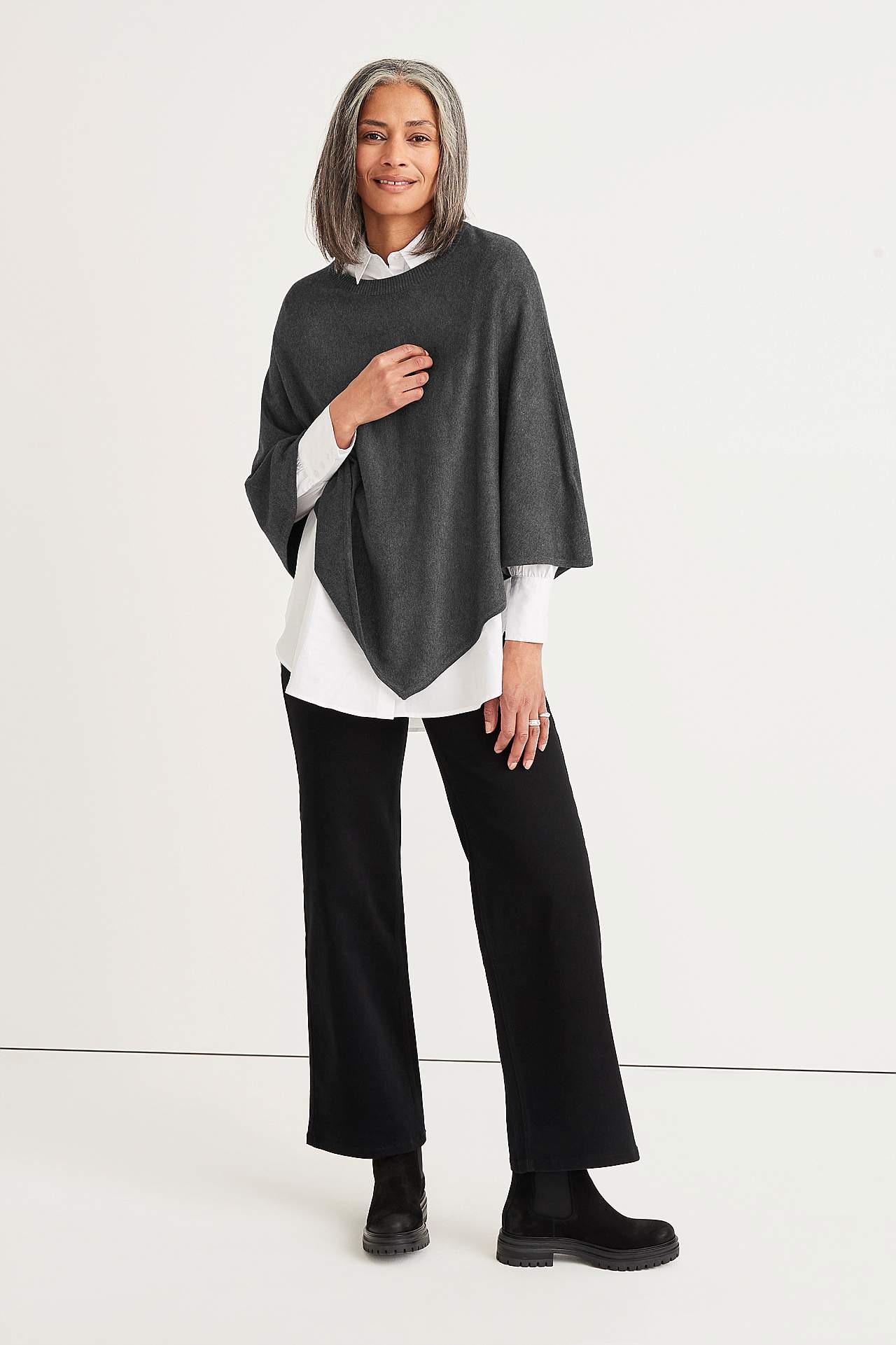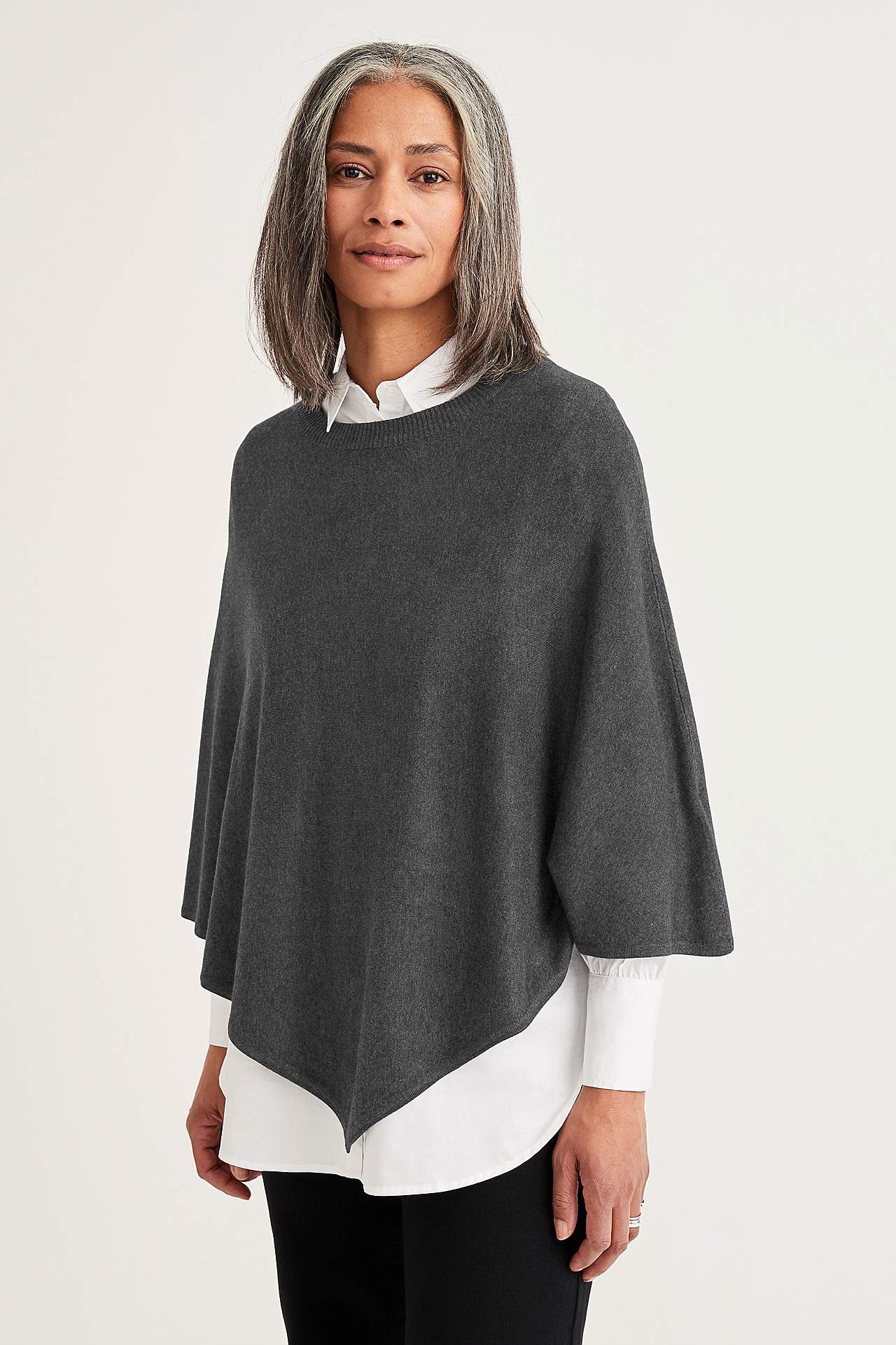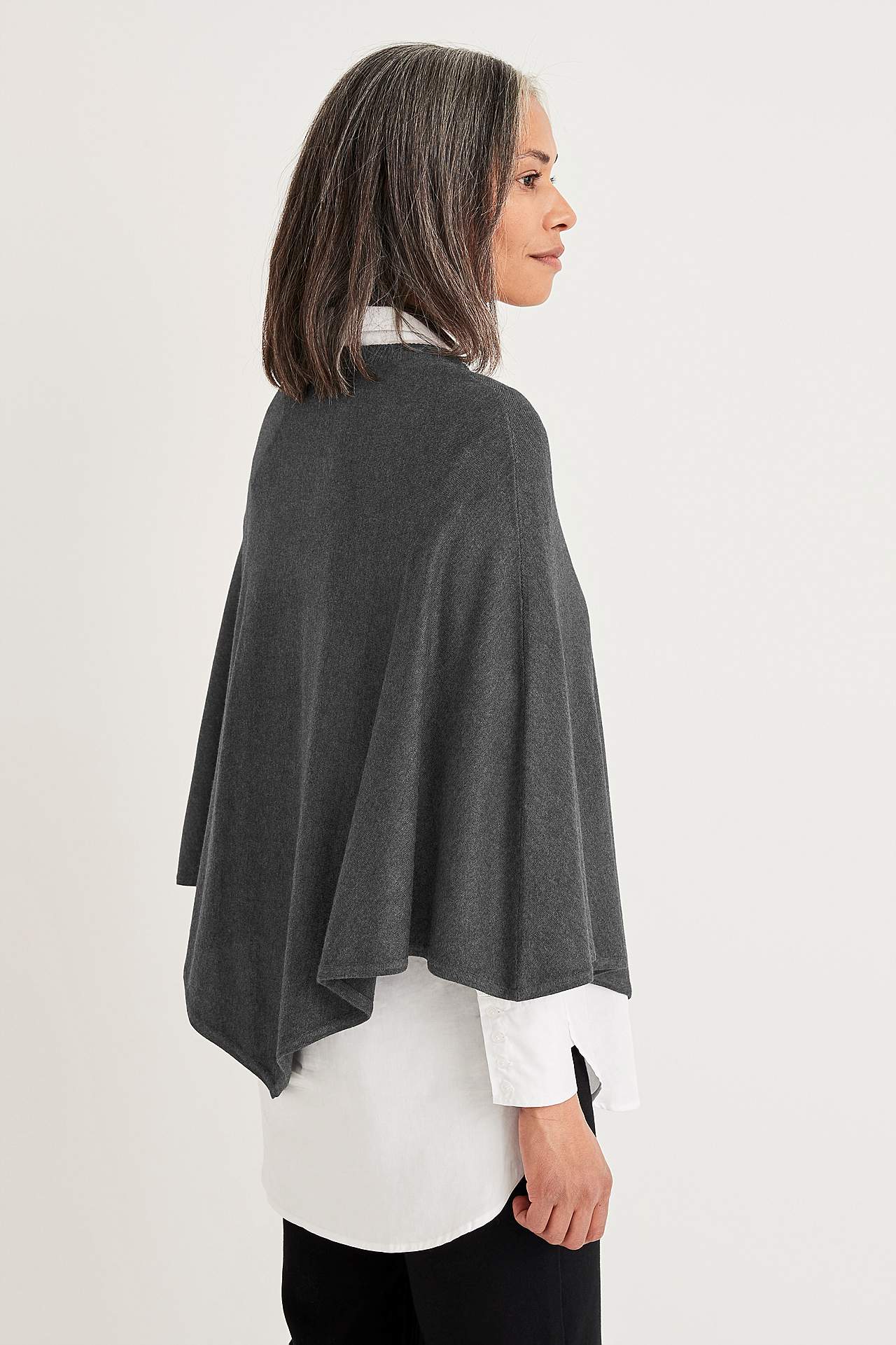 Jemně pletené pončo se zaobleným a žebrovaným krkem. U velikosti 36/44 délka vzadu uprostřed cca 72 cm.
