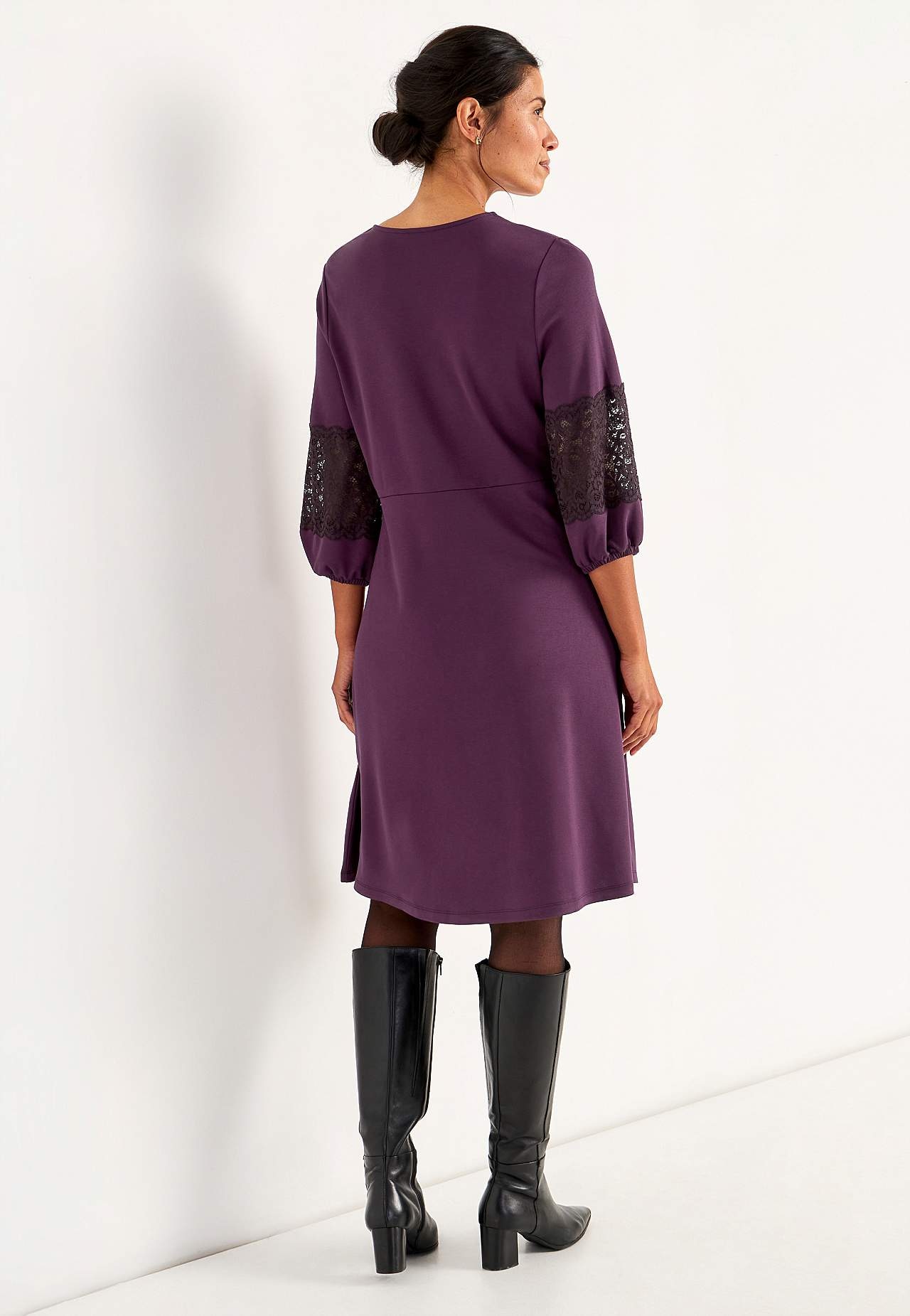 Šaty z měkkého a jemného viskózového žerzeje. Volný střih se šířkou vespodu. Střižený šev v pase. Výstřih do V. Rukávy s tříčtvrteční délkou s krajkovými detaily a gumou na manžetách. Lehce zaoblený lem. Délka zad se odvíjí od velikosti, cca 98 cm.