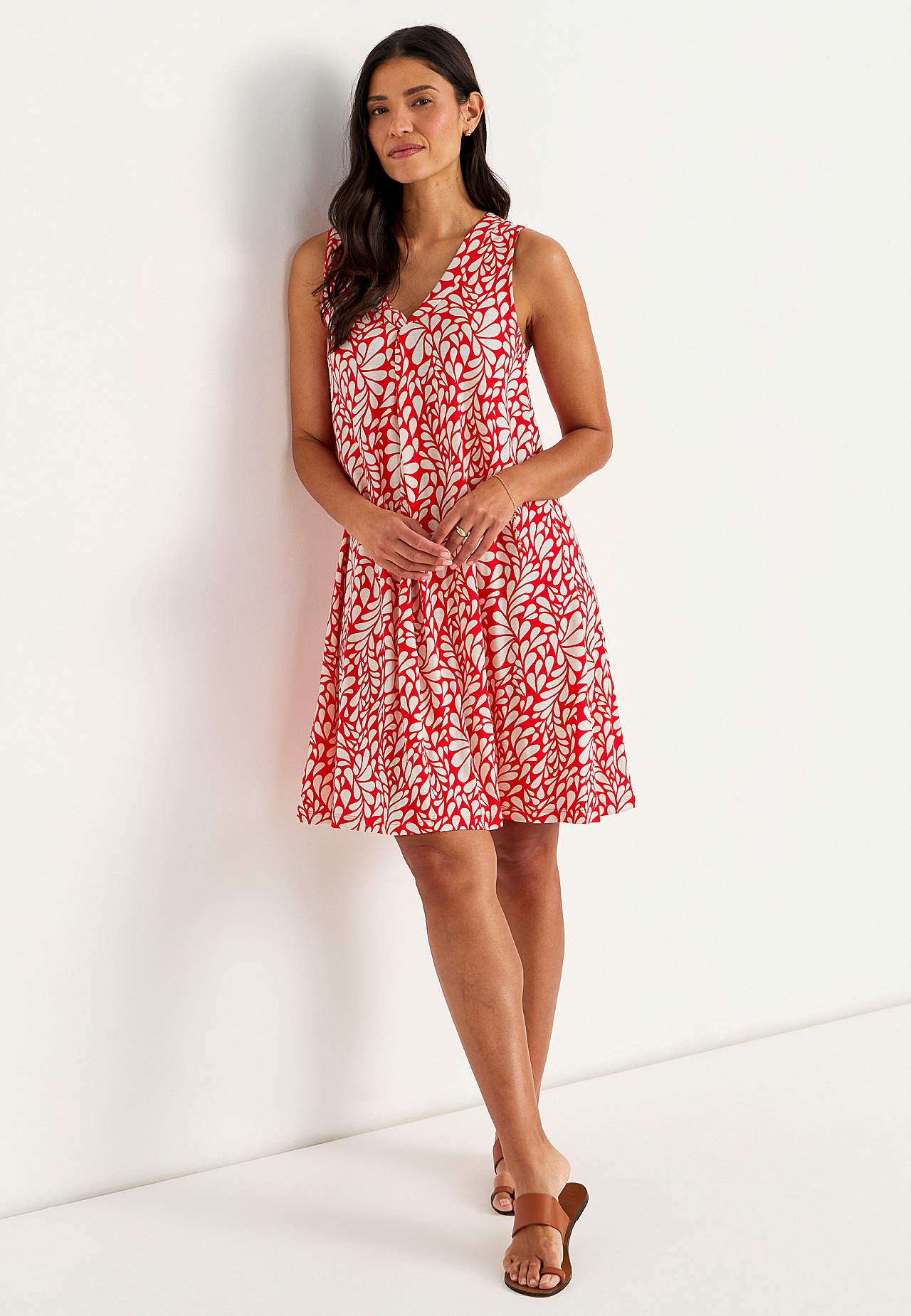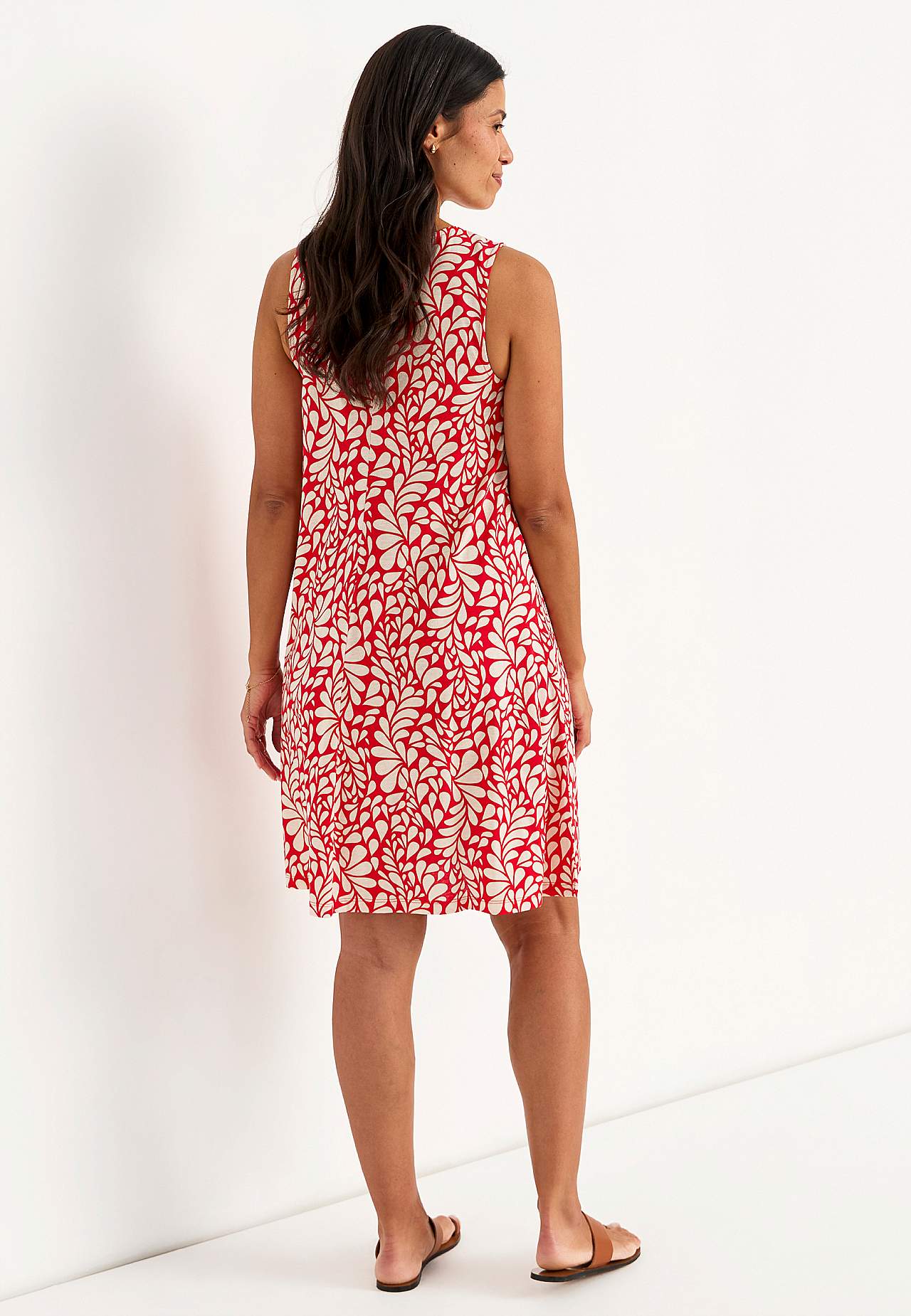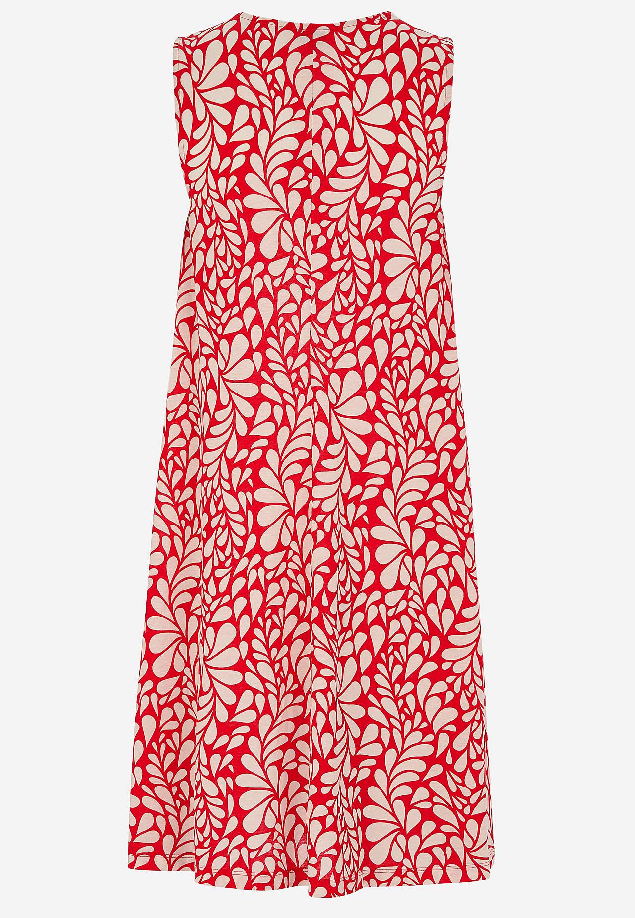 Žerzejové šaty bez rukávu. Vzdušný model z příjemně měkké směsi bavlny a viskózy. Volný střih mírně do A. Délka se odvíjí od velikosti, cca 95-106 cm vzadu od ramene.