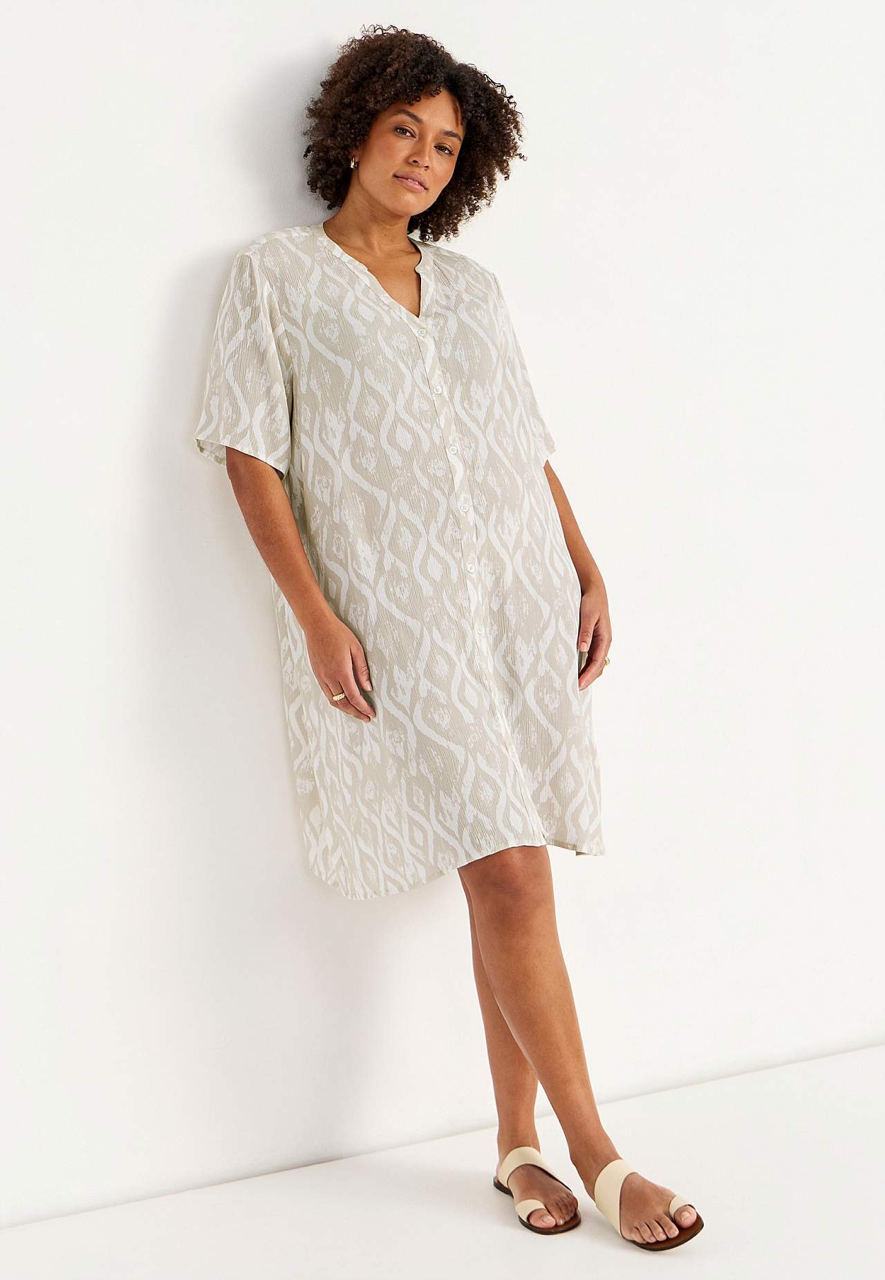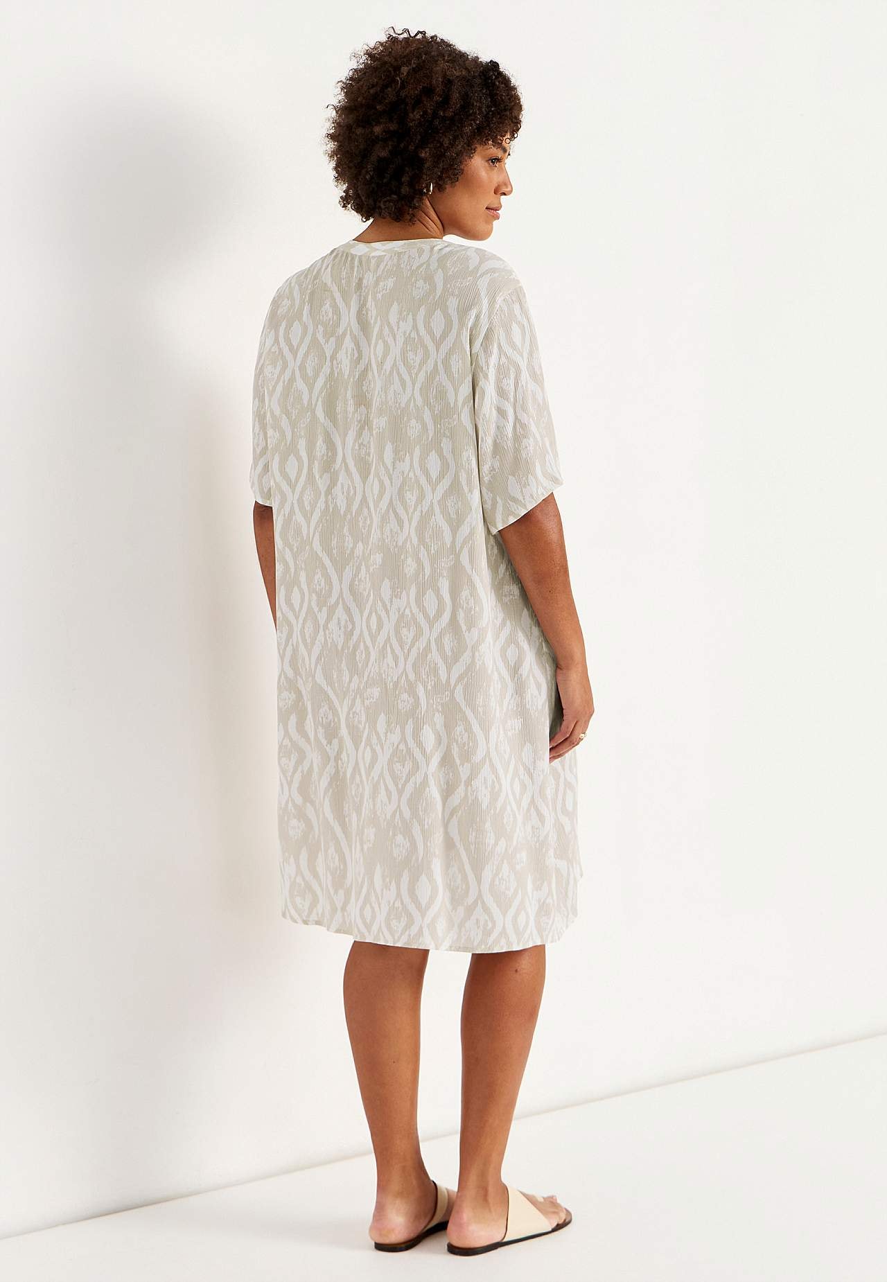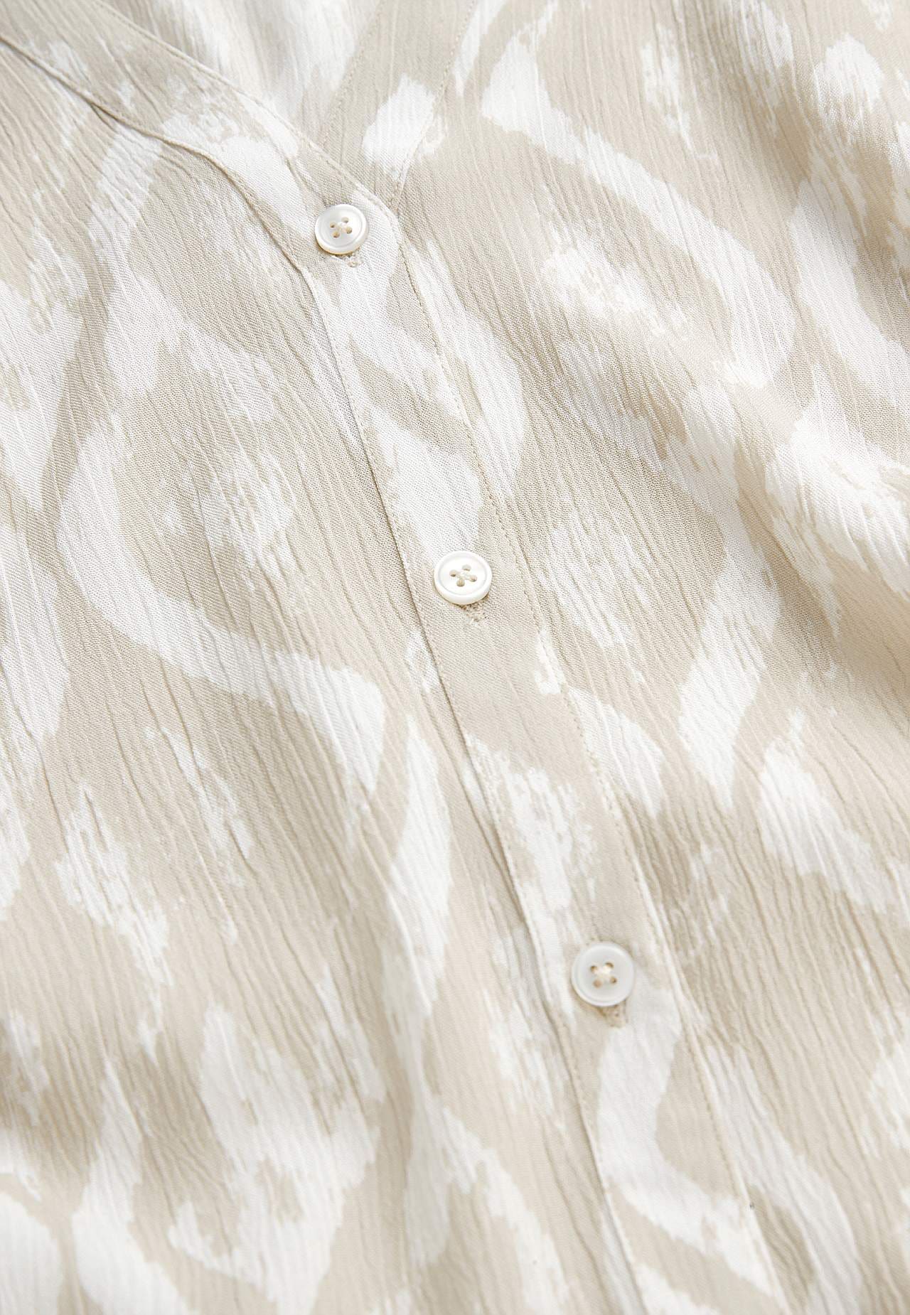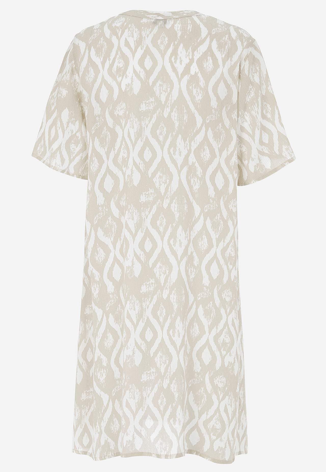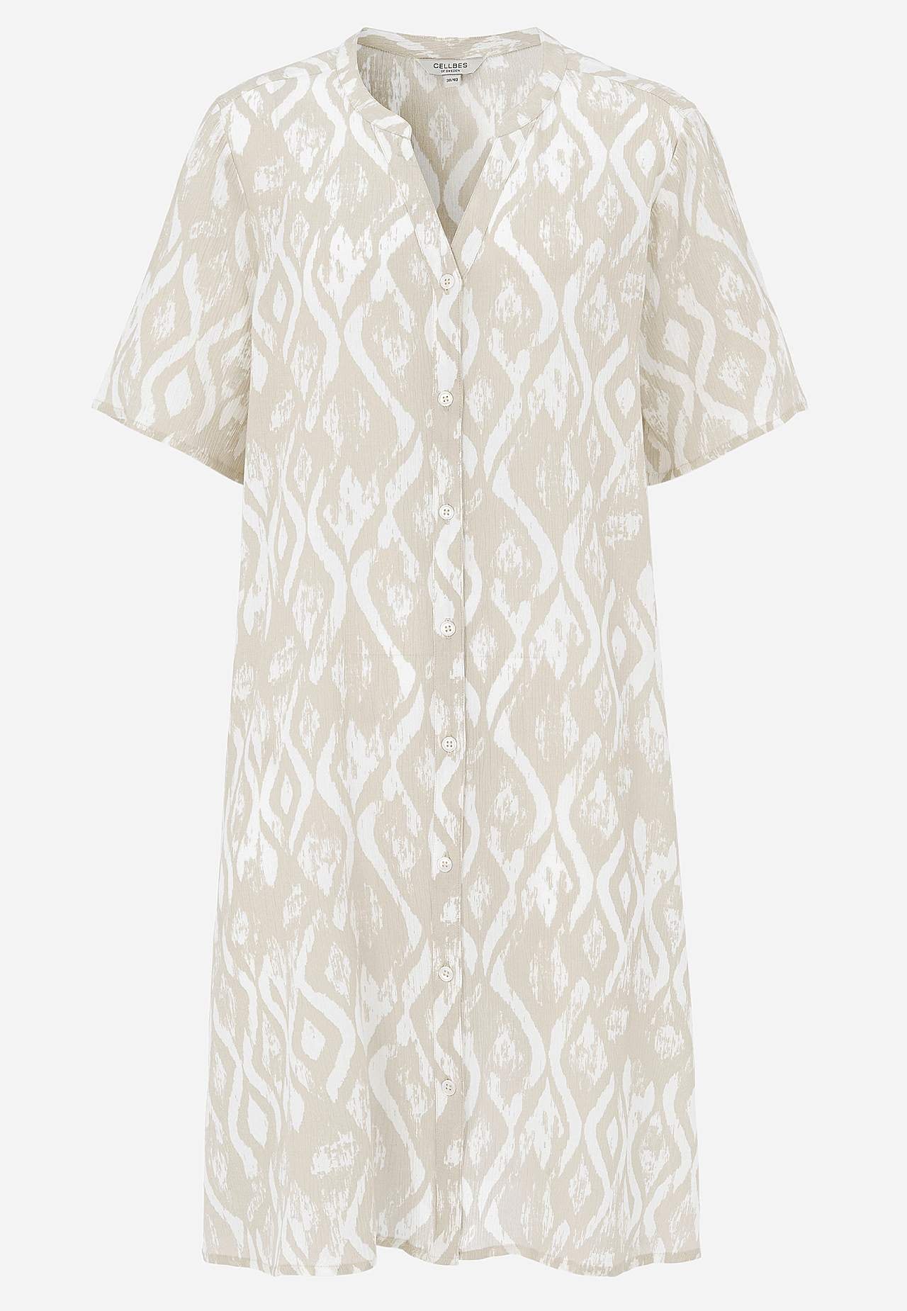 Vzdušný a chladicí materiál s matným povrchem a hezkou strukturou. Lehce volnější střih do A. Zapínání na knoflíky vpředu. Krátké rukávy. Délka zad se odvíjí od velikosti, cca 97-105 cm.