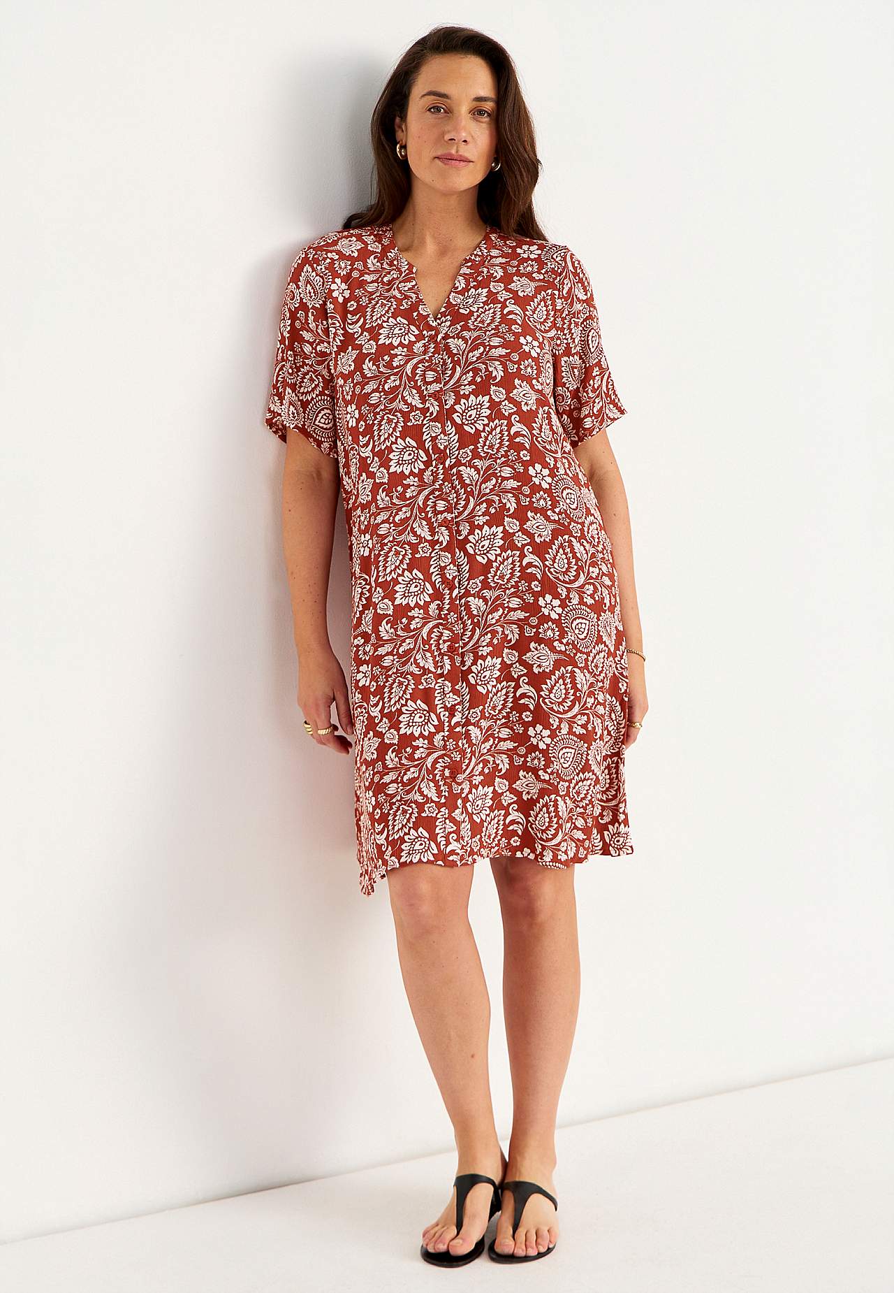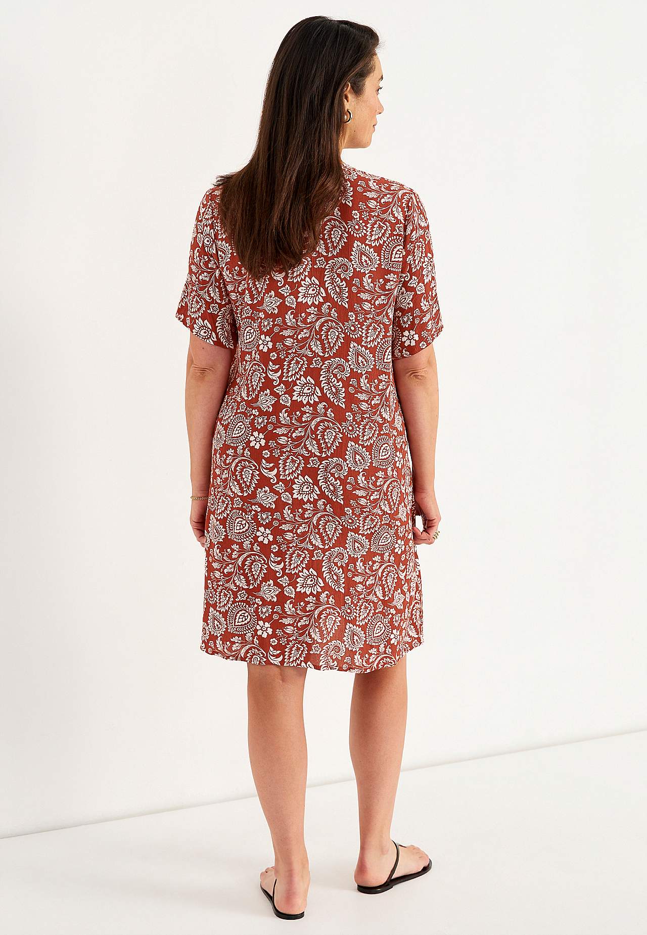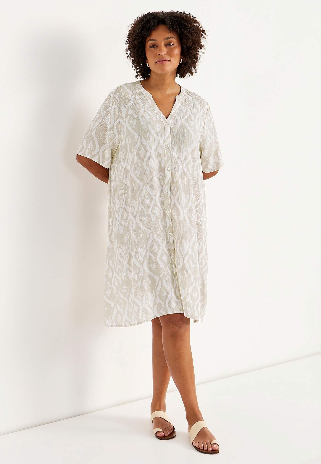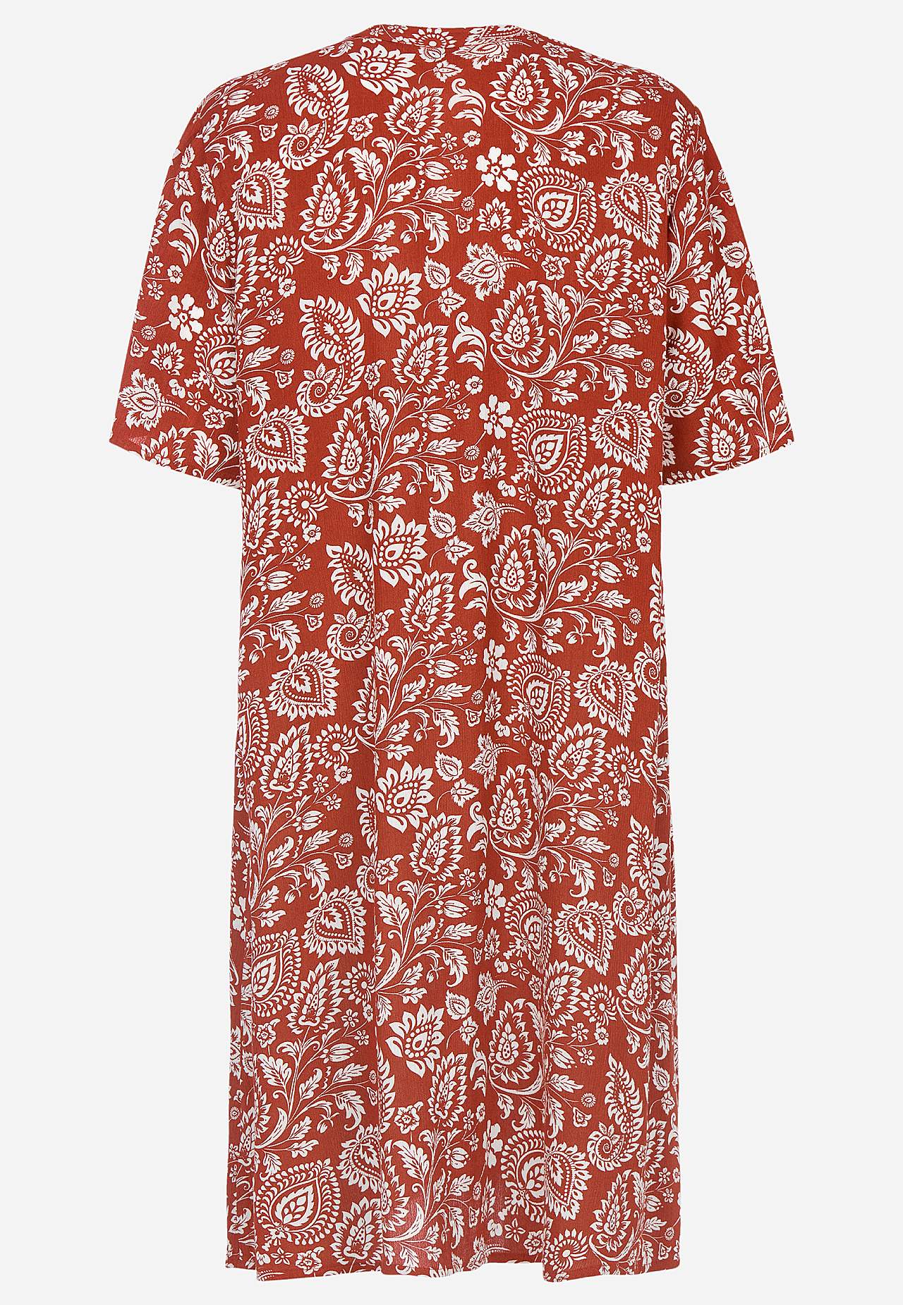 Vzdušný a chladicí materiál s matným povrchem a hezkou strukturou. Lehce volnější střih do A. Zapínání na knoflíky vpředu. Krátké rukávy. Délka zad se odvíjí od velikosti, cca 97-105 cm.