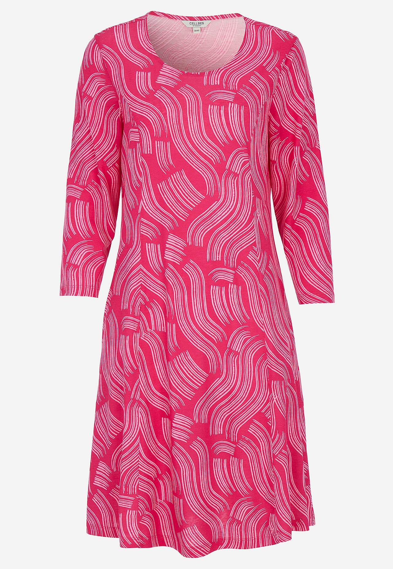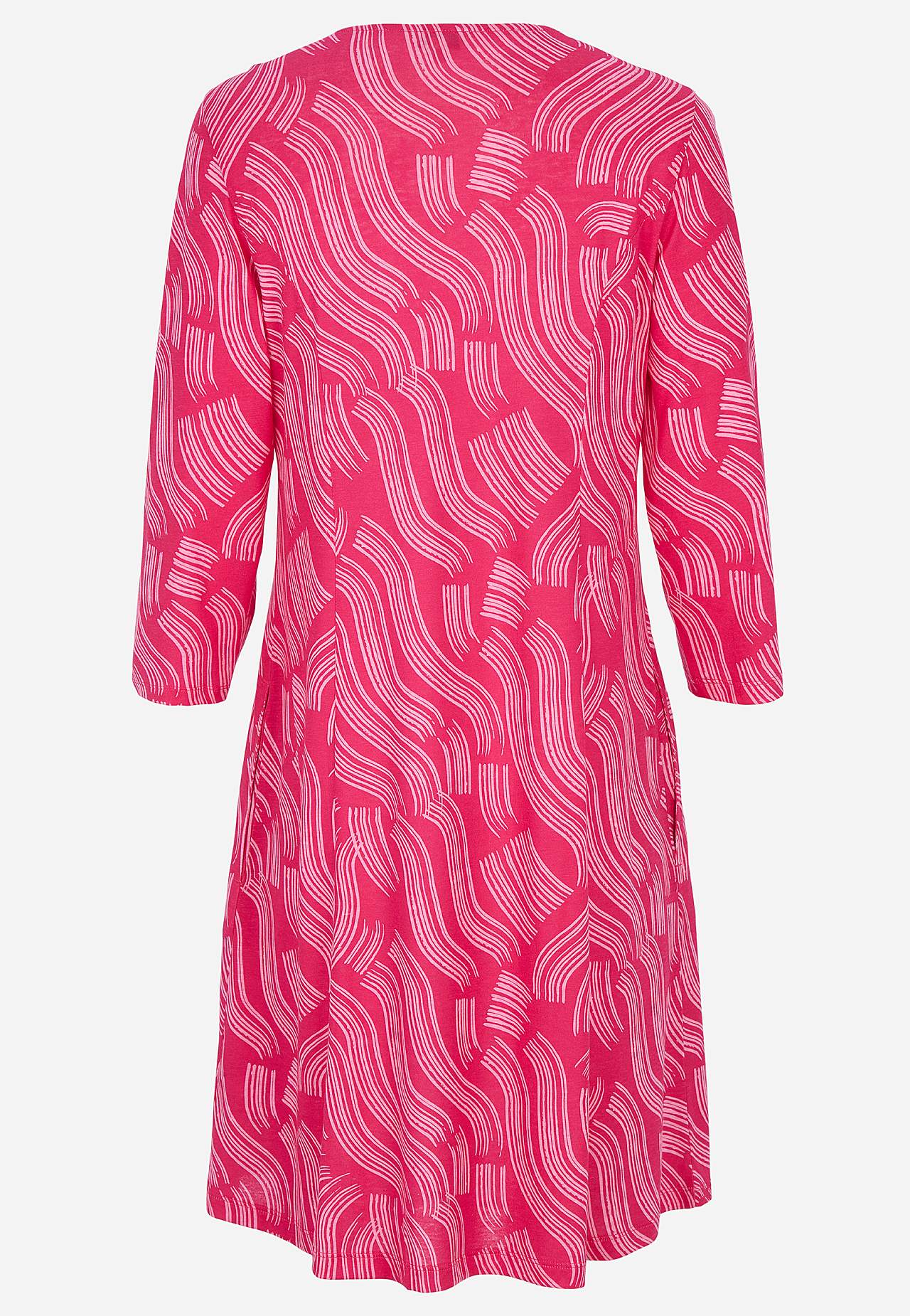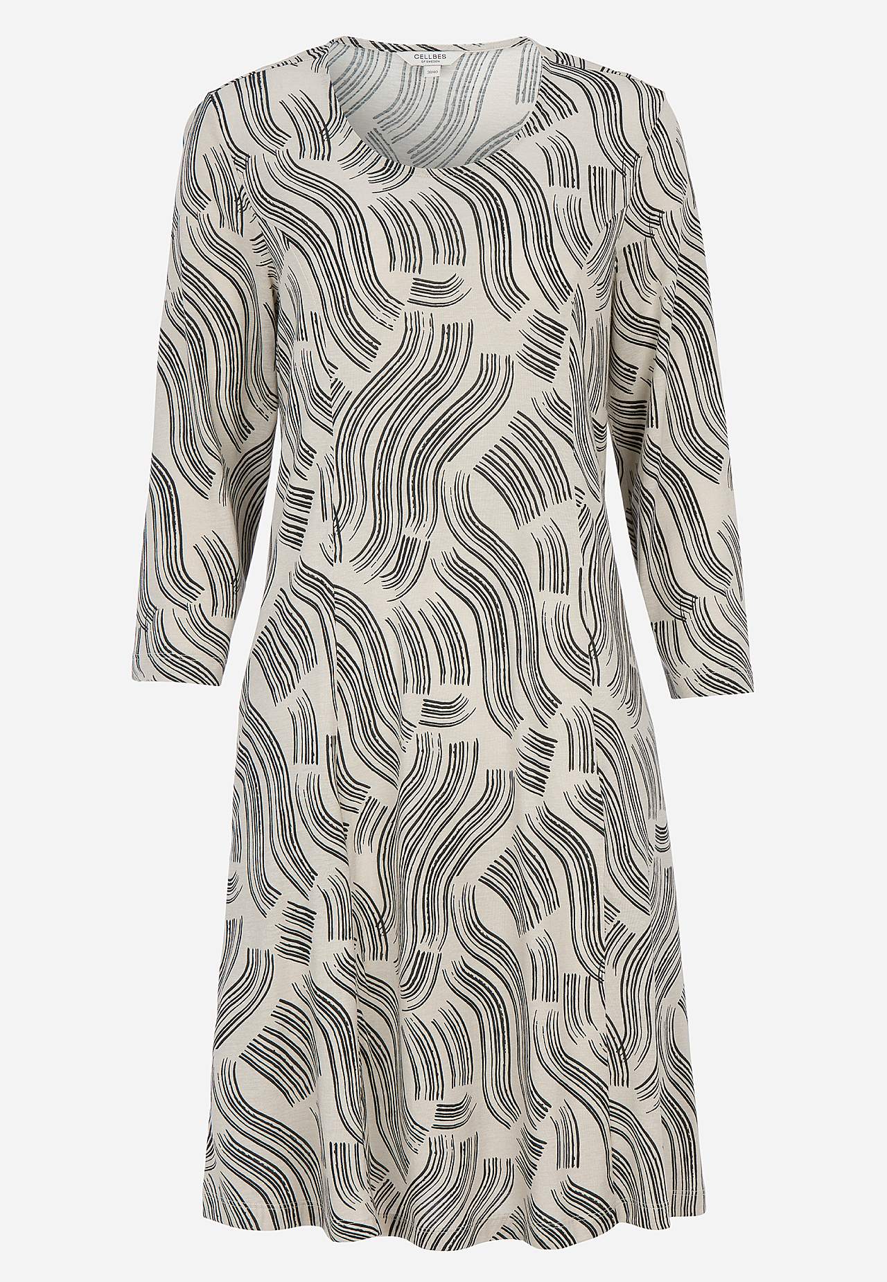 Měkké a pohodlné šaty ze směsi bavlny a viskózy. Těsný střih přes prsa. Zvonový model se švy na panelu v přední i zadní části. Zaoblený výstřih. Pohodlné postranní kapsy. Rovné rukávy s 3/4 délkou. Vzadu sedlo. Délka se odvíjí od velikosti, cca 96-108 cm od ramene.