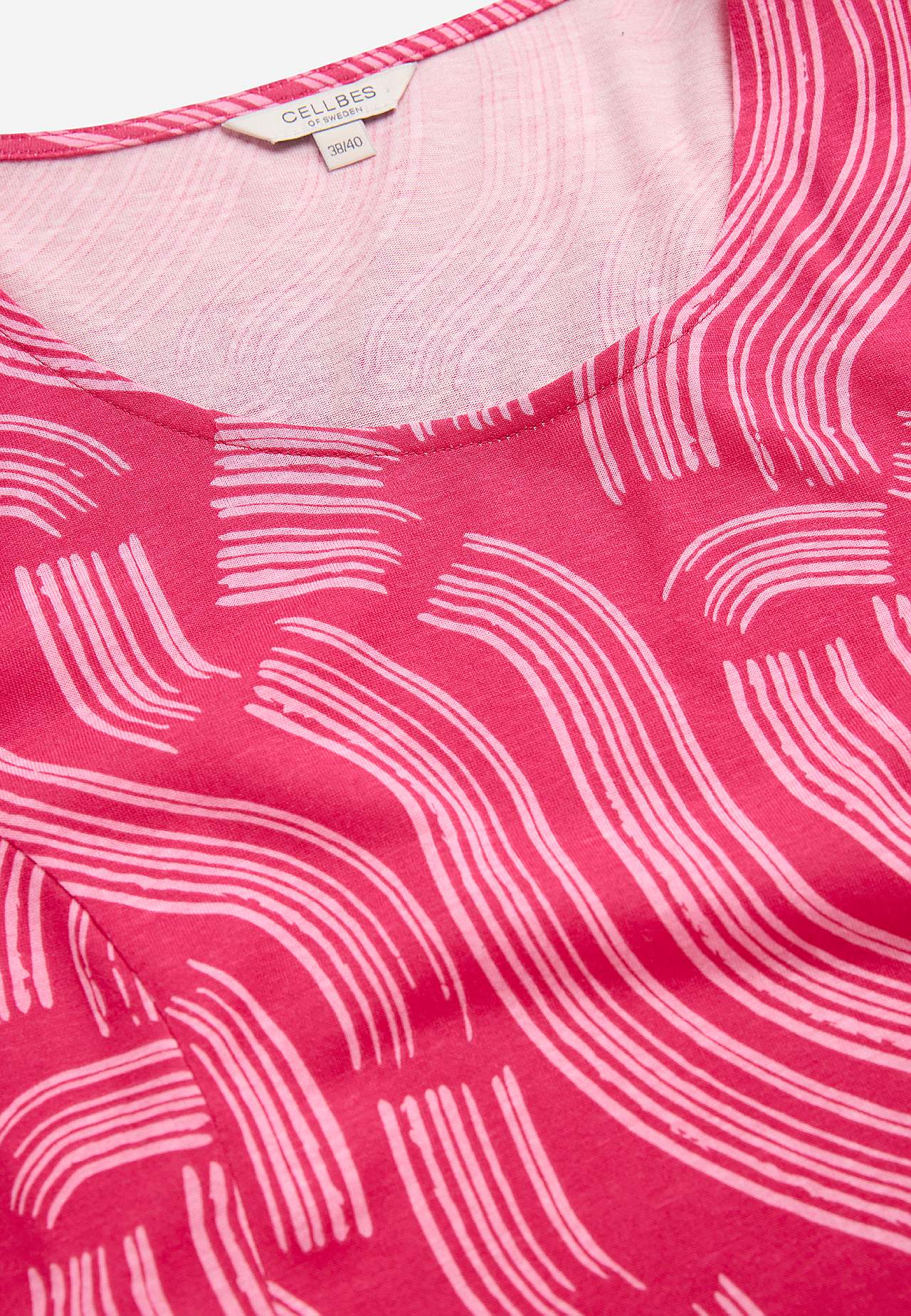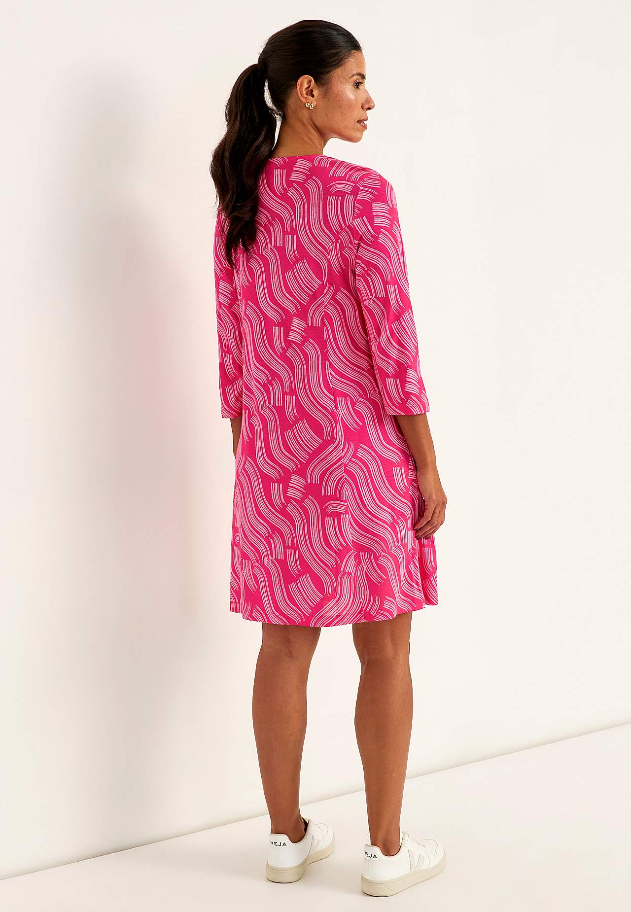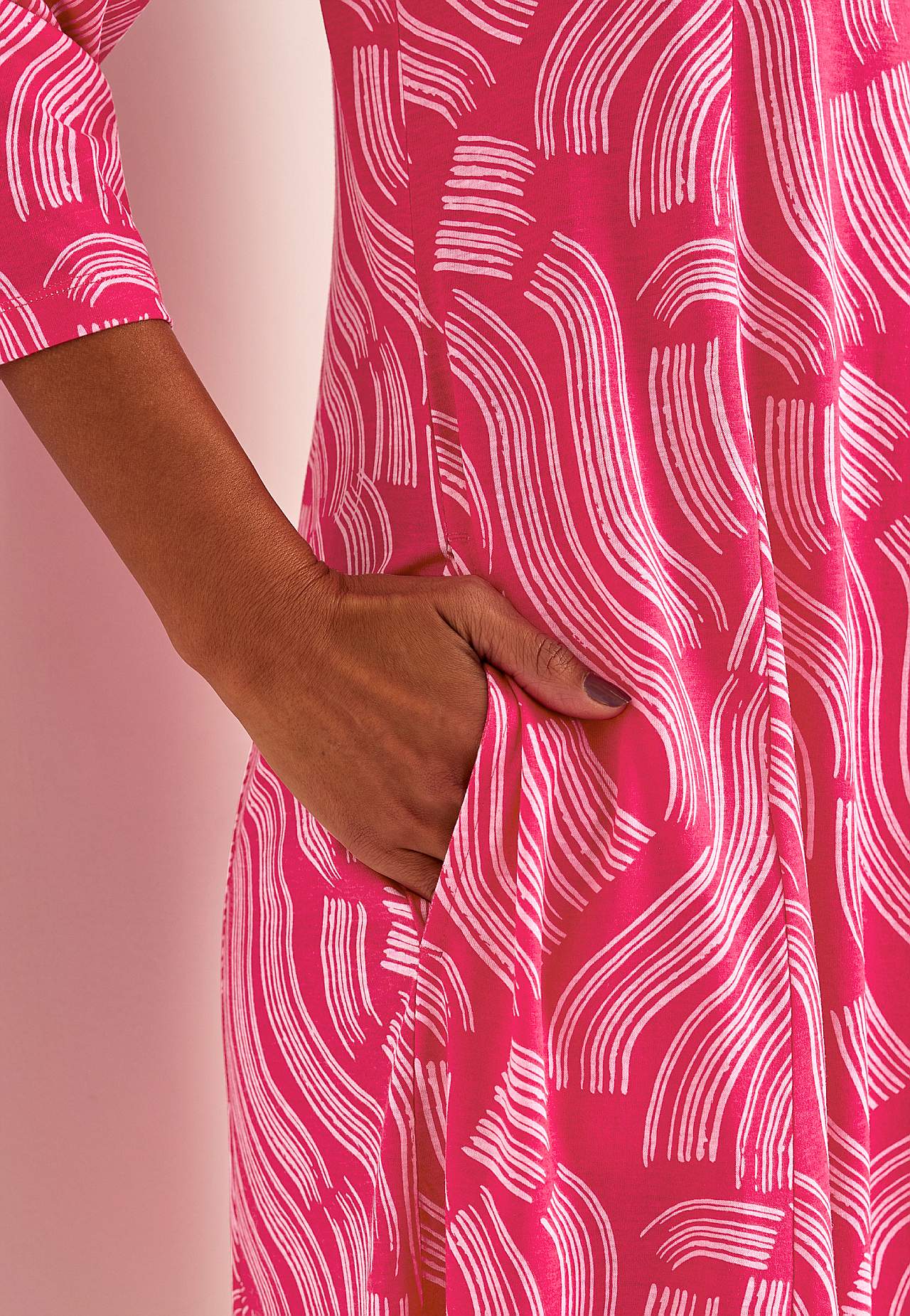 Měkké a pohodlné šaty ze směsi bavlny a viskózy. Těsný střih přes prsa. Zvonový model se švy na panelu v přední i zadní části. Zaoblený výstřih. Pohodlné postranní kapsy. Rovné rukávy s 3/4 délkou. Vzadu sedlo. Délka se odvíjí od velikosti, cca 96-108 cm od ramene.