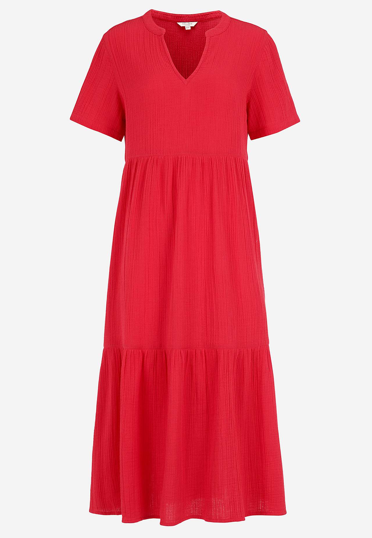 Volánové šaty z půvadného bavlněného mušelínu s přírodní strukturou. Tkaný a měkký materiál s vzdušným a chladicím dotykem. Volný střih se šířkou vespod. Kulatý krk s malým střihem výstřihu do V. Krátké rukávy. Šev v pase. Volán vespod. Rovný lem. Délka zad se odvíjí od velikosti, cca 125 cm.