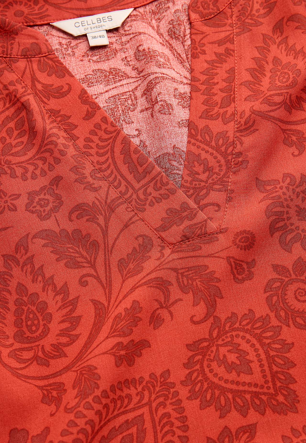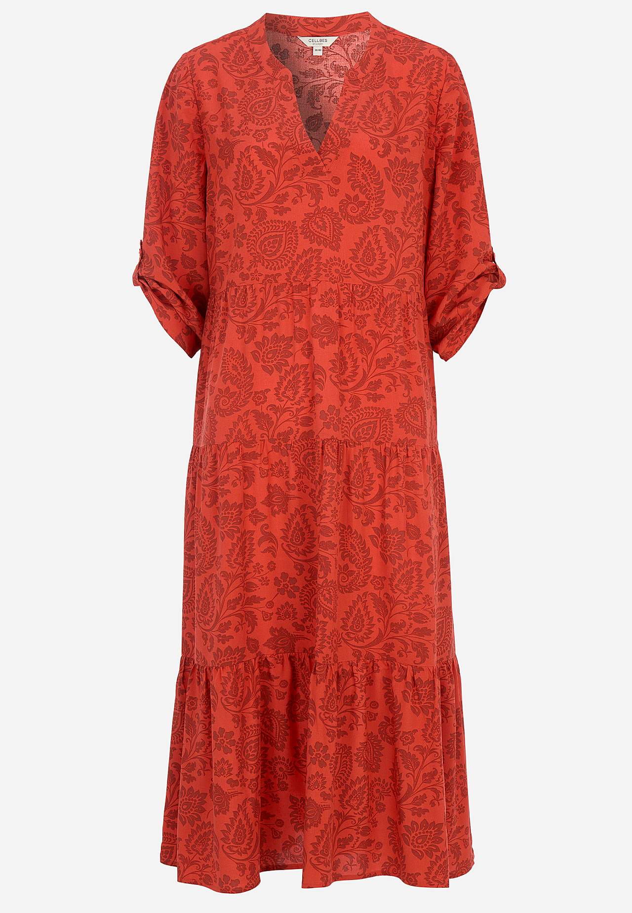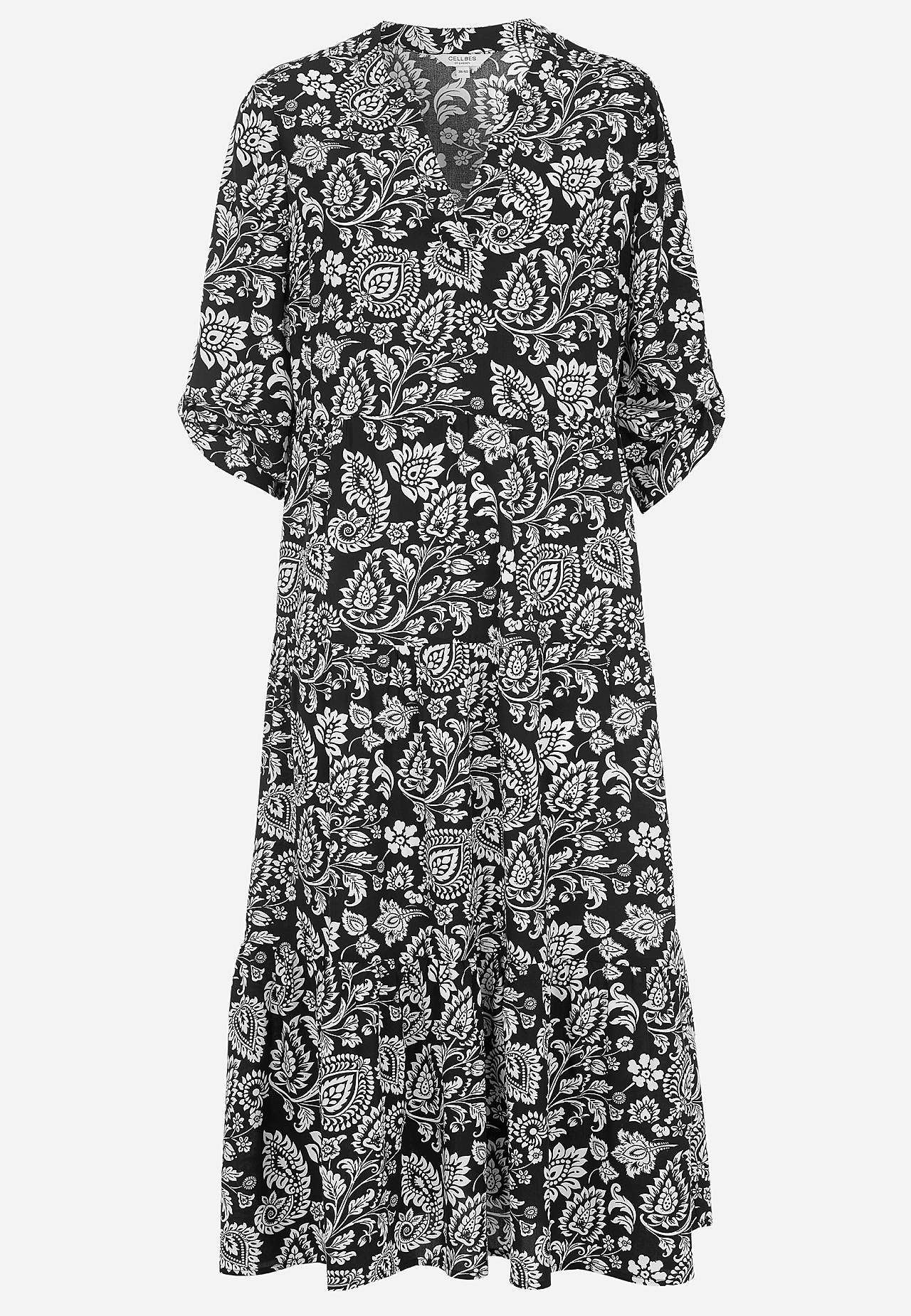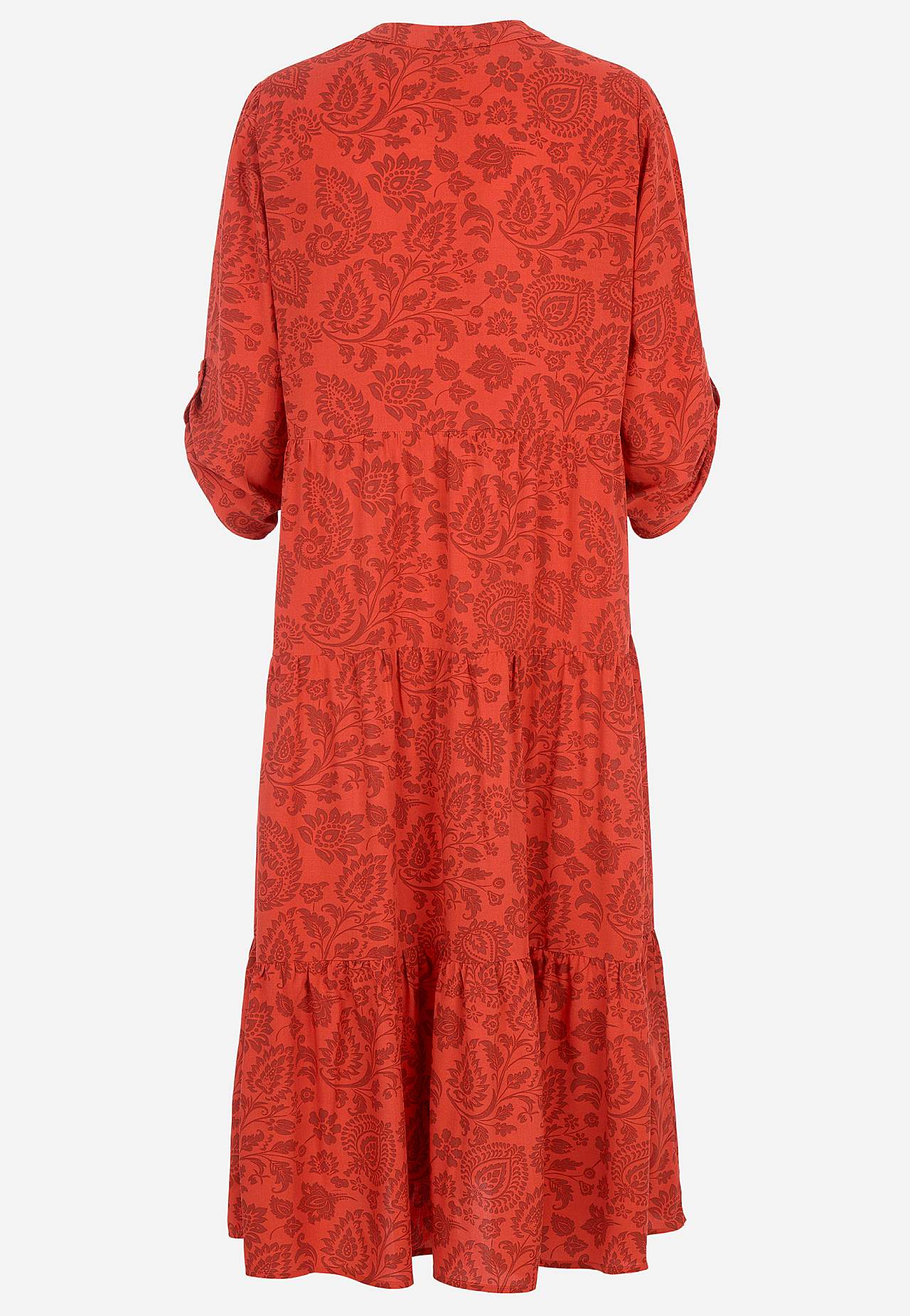 Tkané šaty z chladicí viskózy s volány. Volný střih do A. Měkká a nenatahovací kvalita s hezkým řasením. Kulatý výstřih s překrývajícím se střihem výstřihu do V. Jemně zakulacený lem. Vzadu sedlo. Délka se odvíjí od velikosti, cca 121-124 cm od ramene.