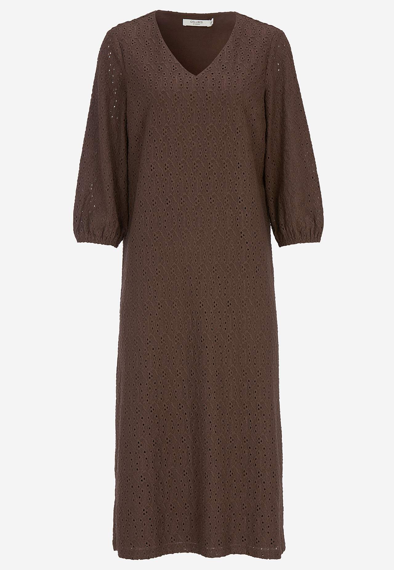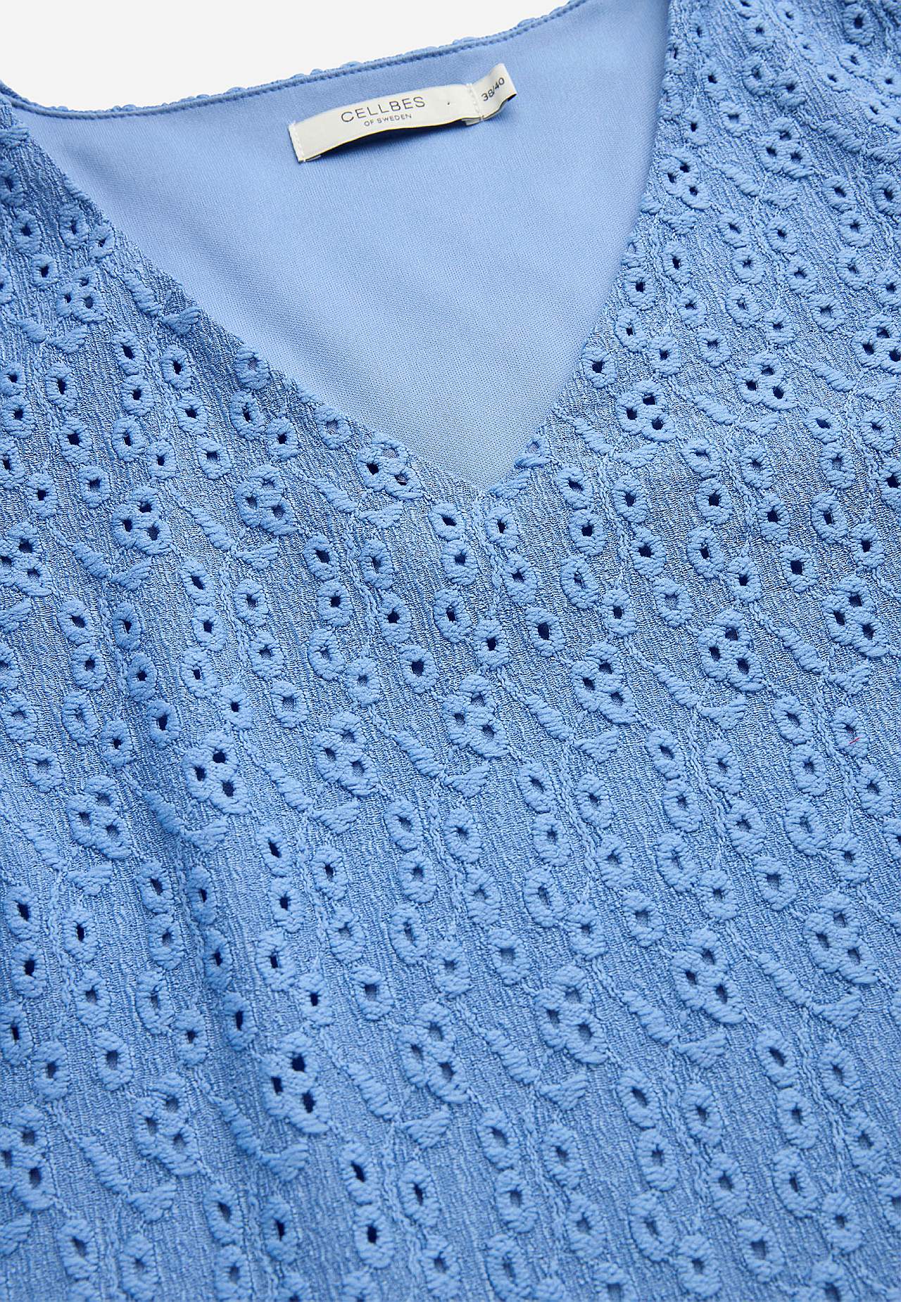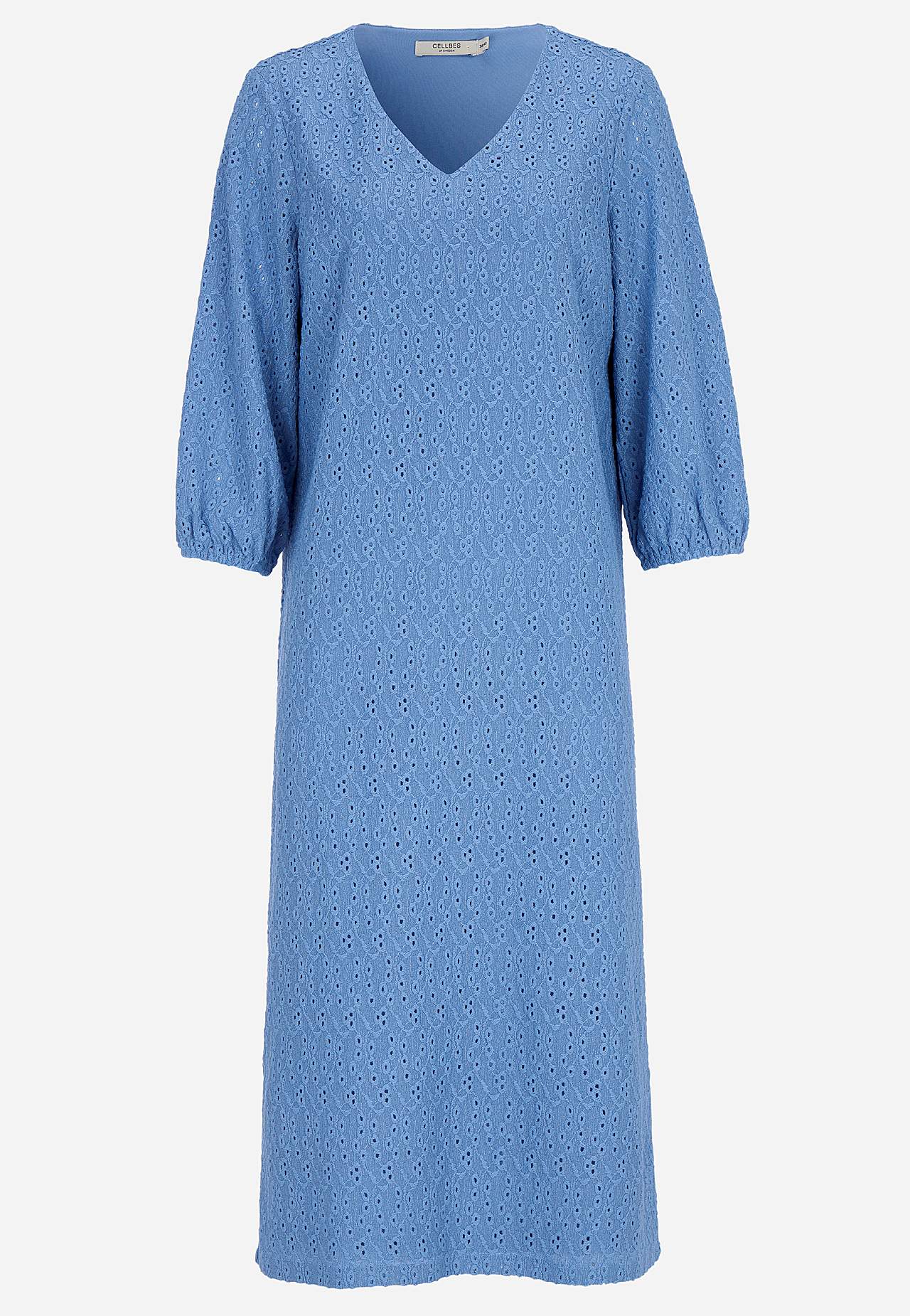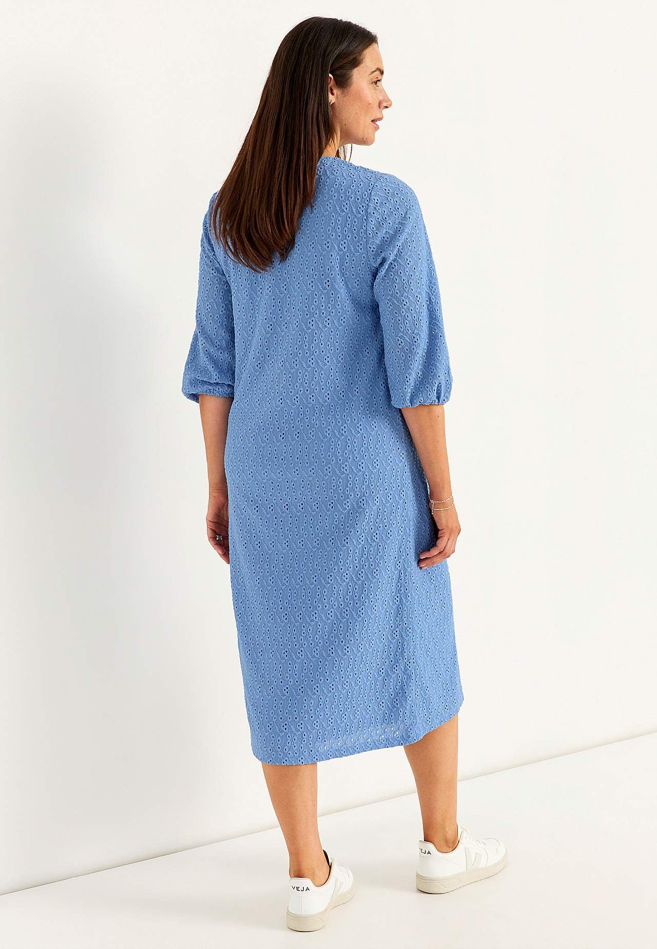 Strukturálně vzorované a podšití šaty s anglickou krajkou. Pohodlný a roztažitelný materiál. Střih mírně do A. Krk s výstřihem ve tvaru V. Střed košíčku. Tříčtvrteční rukávy bez podšívky s gumou na manžetách. Rovný lem. Délka zad se odvíjí od velikosti, cca 120 cm.