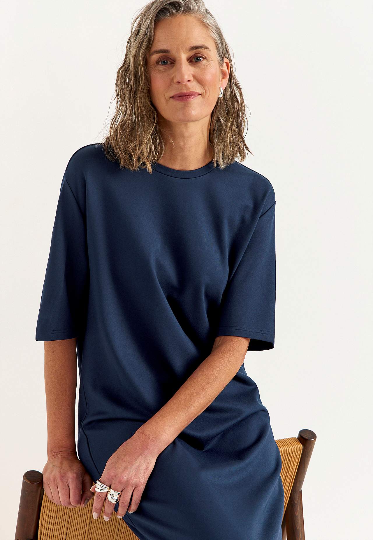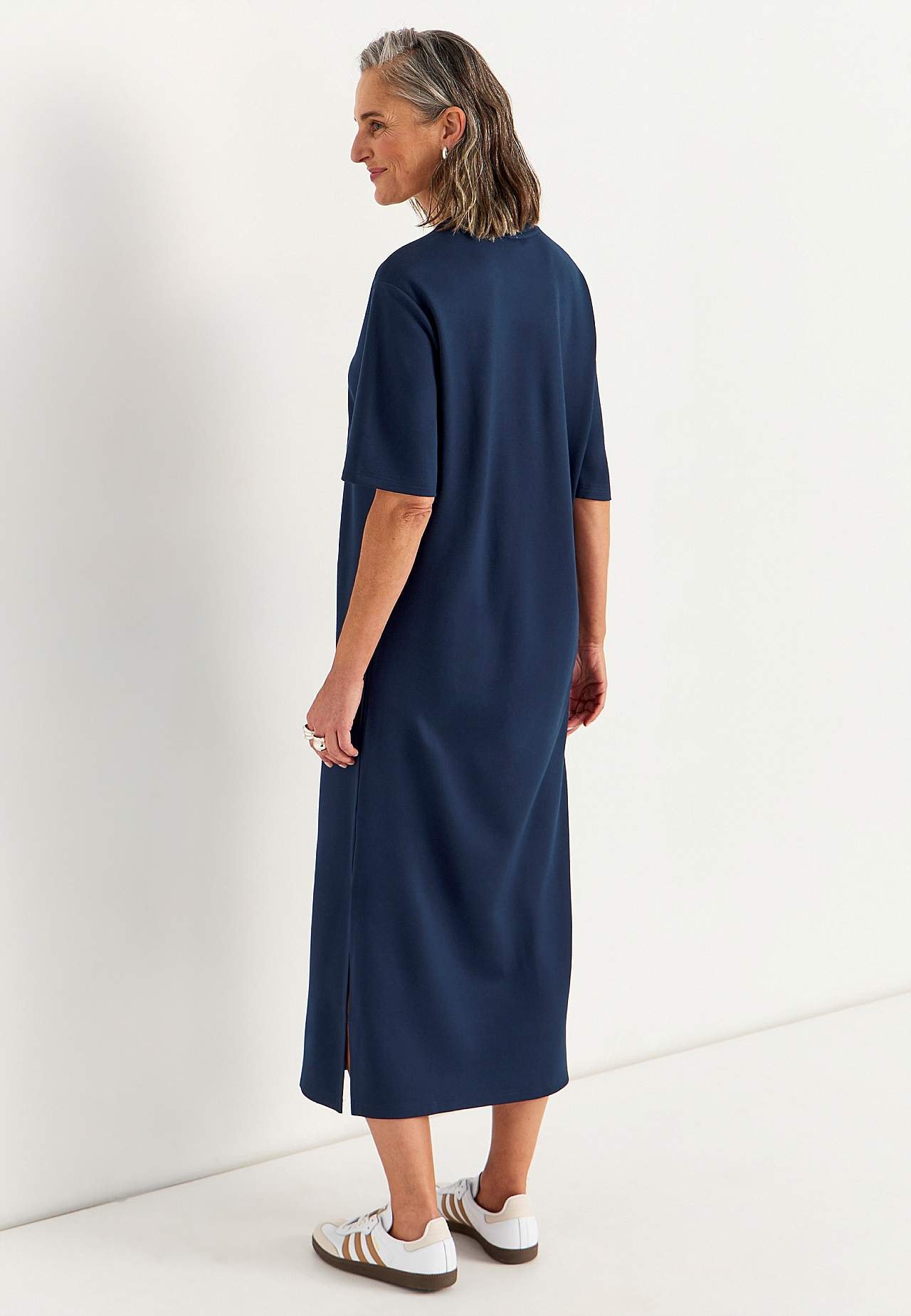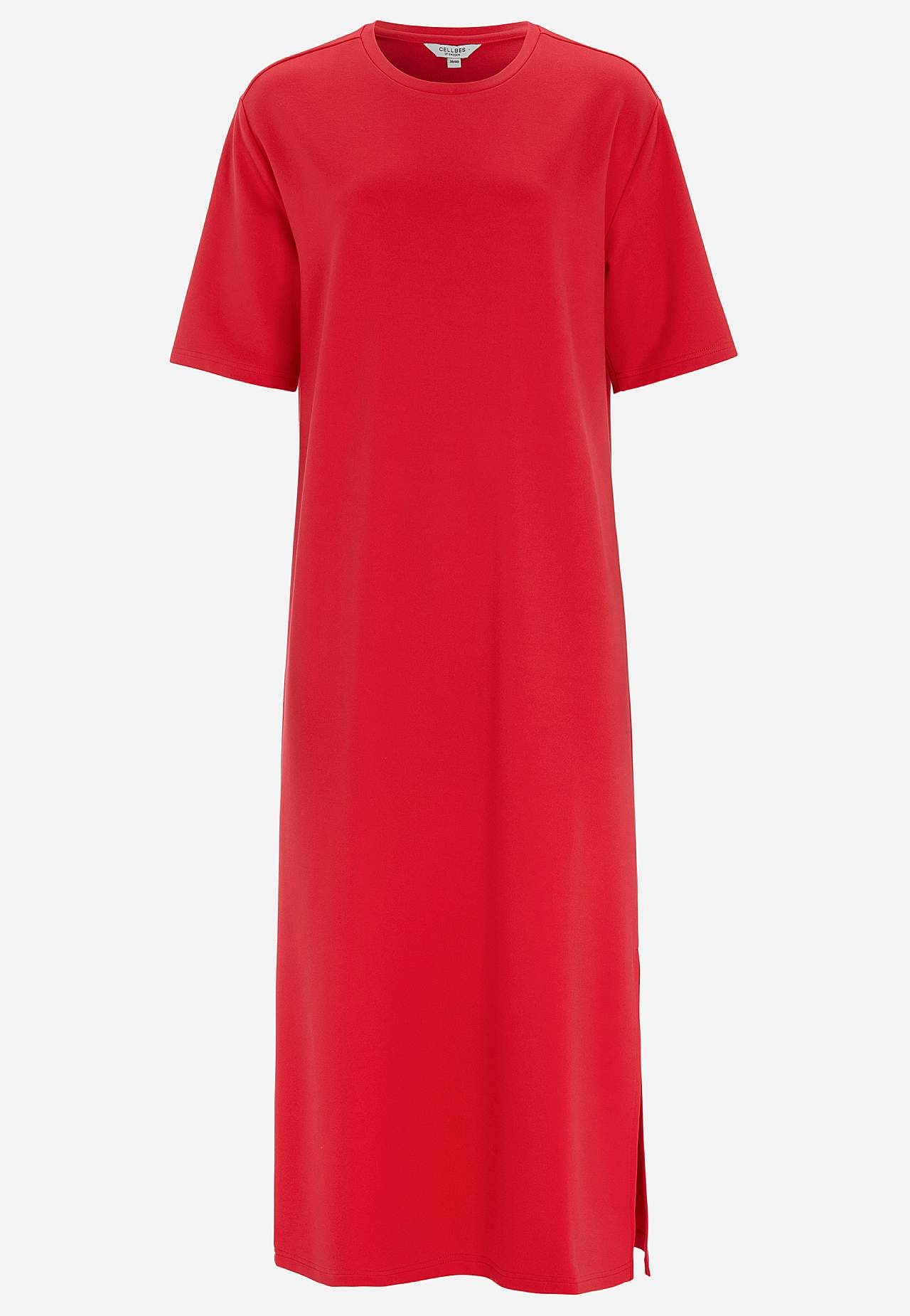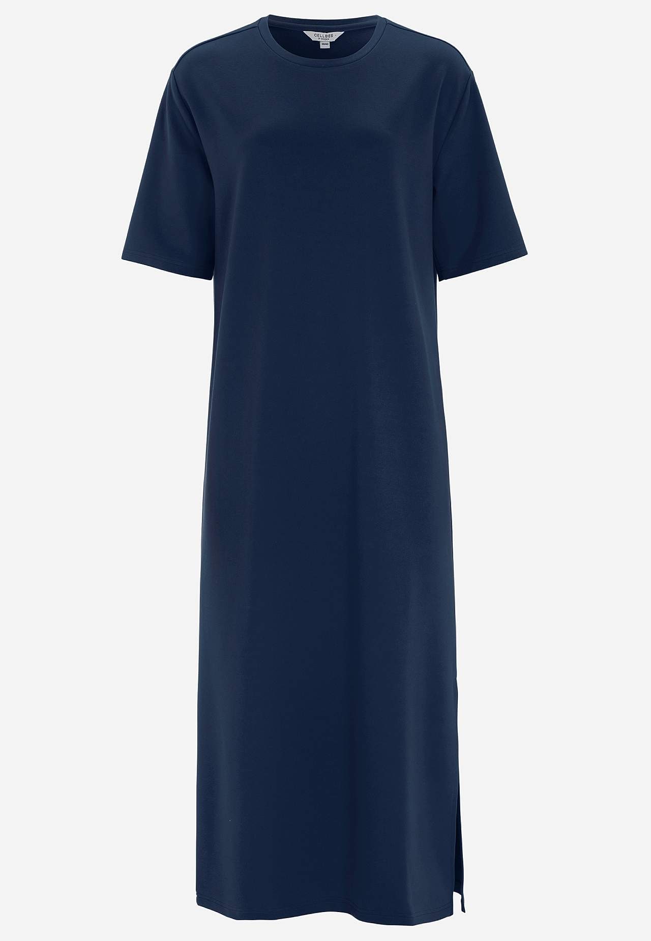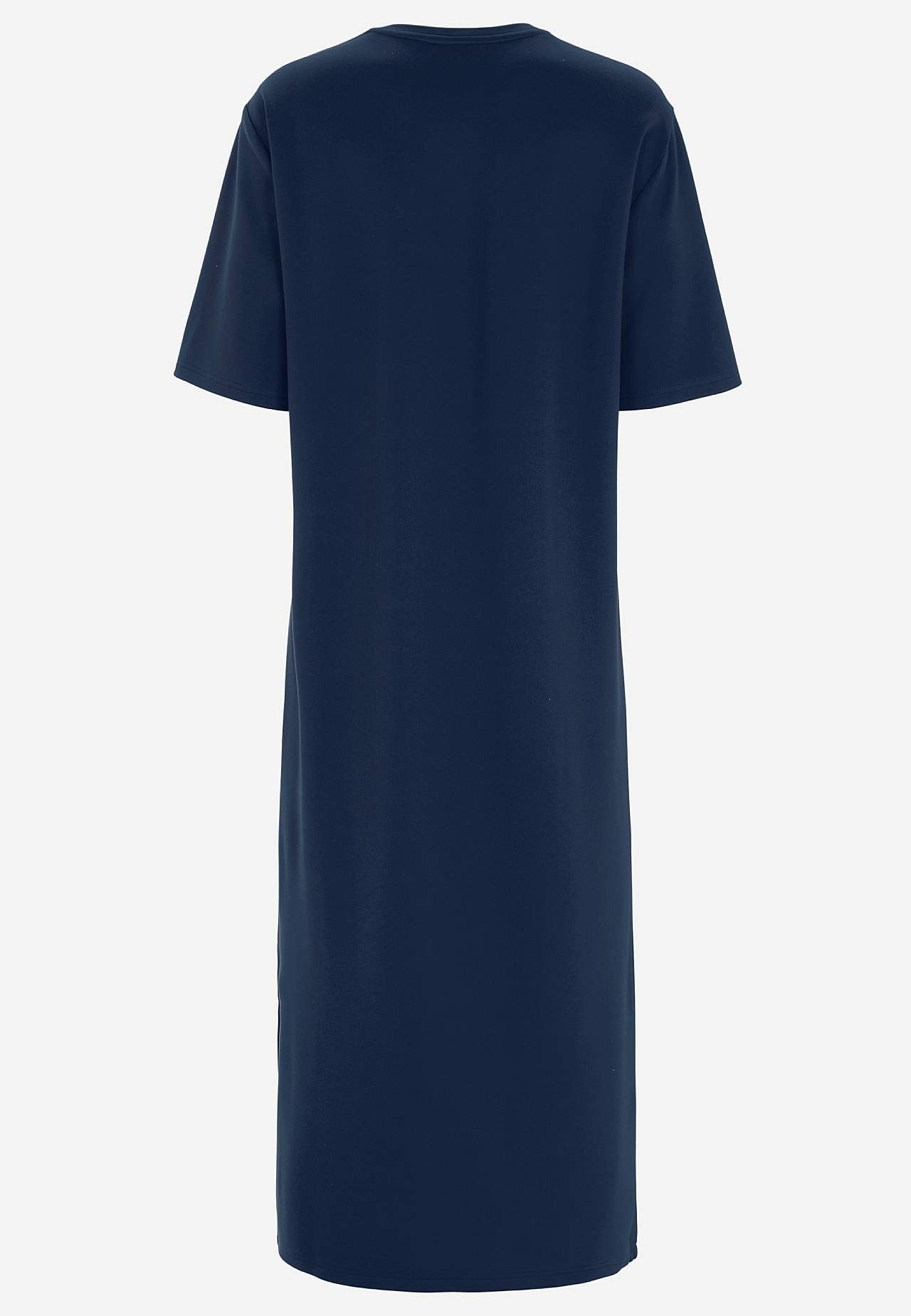 Měkké šaty z hutního žerzeje se strečem. Rovný a volný střih. Kulatý krk. Spadlé rameno. Krátké rukávy. Rovný lem s vysokým rozparkem na straně. Délka od ramene cca. 121 cm ve všech velikostech.