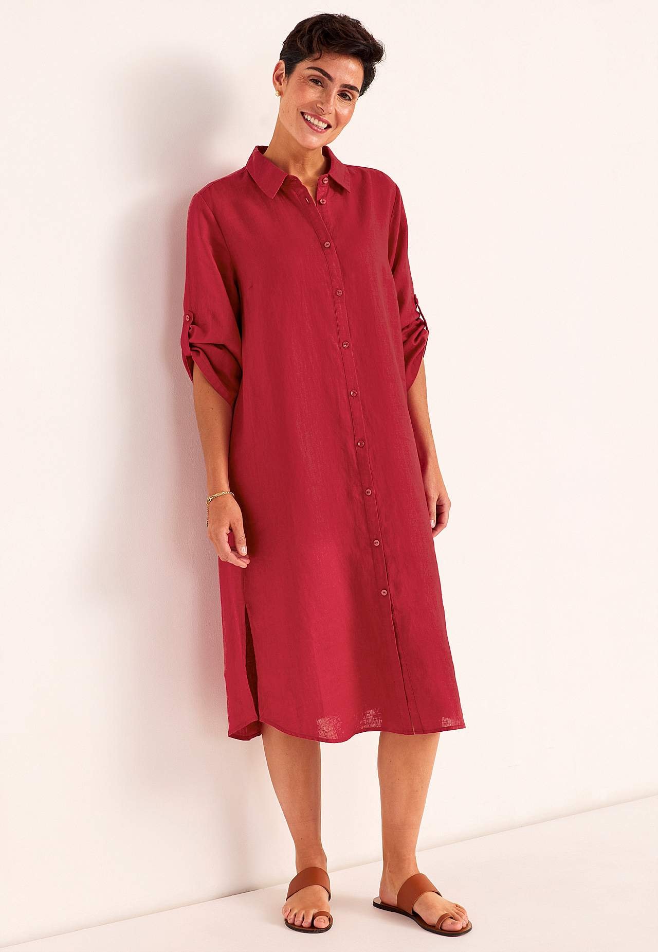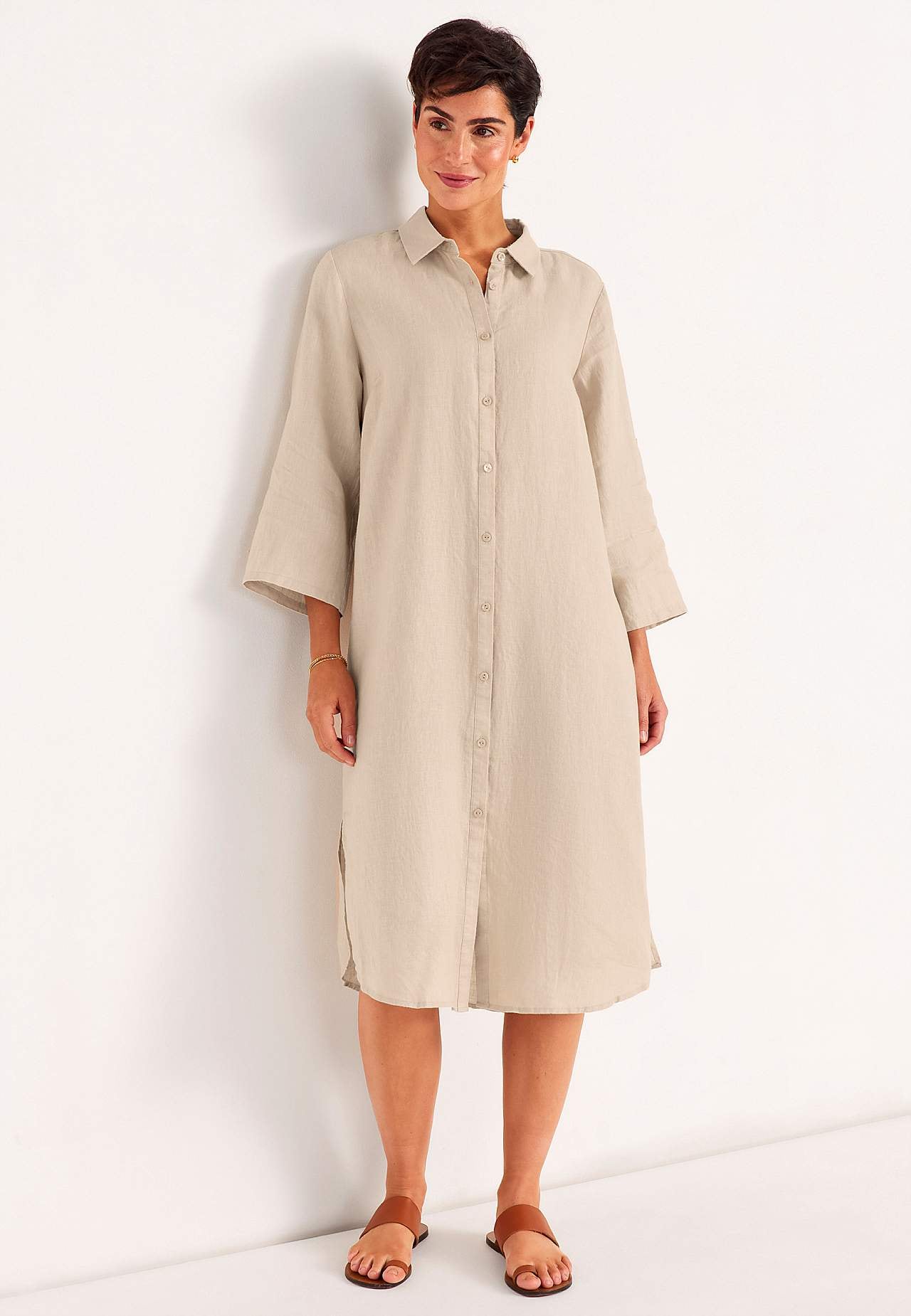 Košilové šaty z lnu 100%. Vzdušný materiál. Volný a rovně střižený střih. Knoflíková lišta odshora dolů. Rolovatelný dlouhý rukáv s detailem s knoflíky. Záševky na prsou pro nejlepší pocit z nošení. Skutečný favorit na každodenní nošení. Vzadu sedlo. Délka se odvíjí od velikosti, cca 116-124 cm od ramene.