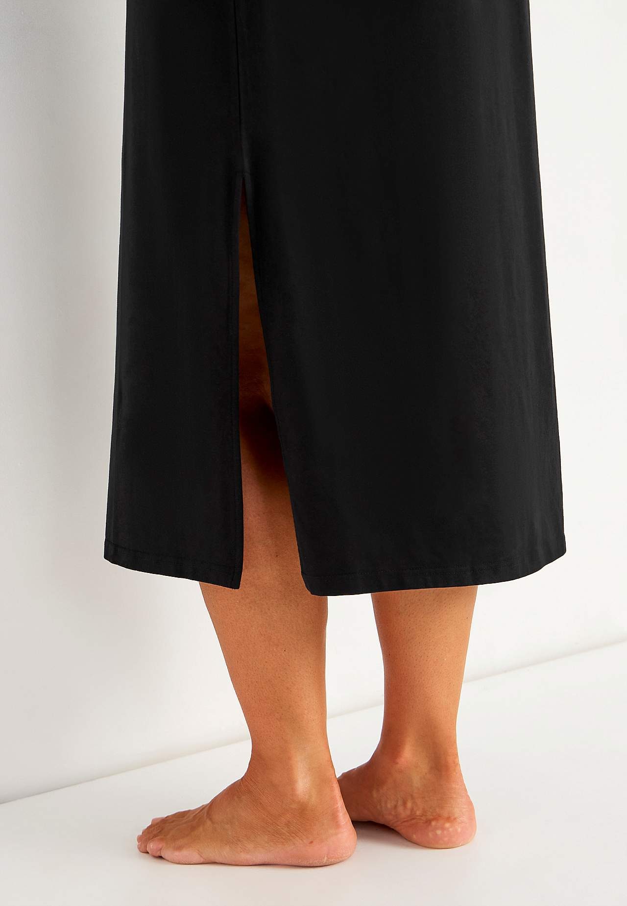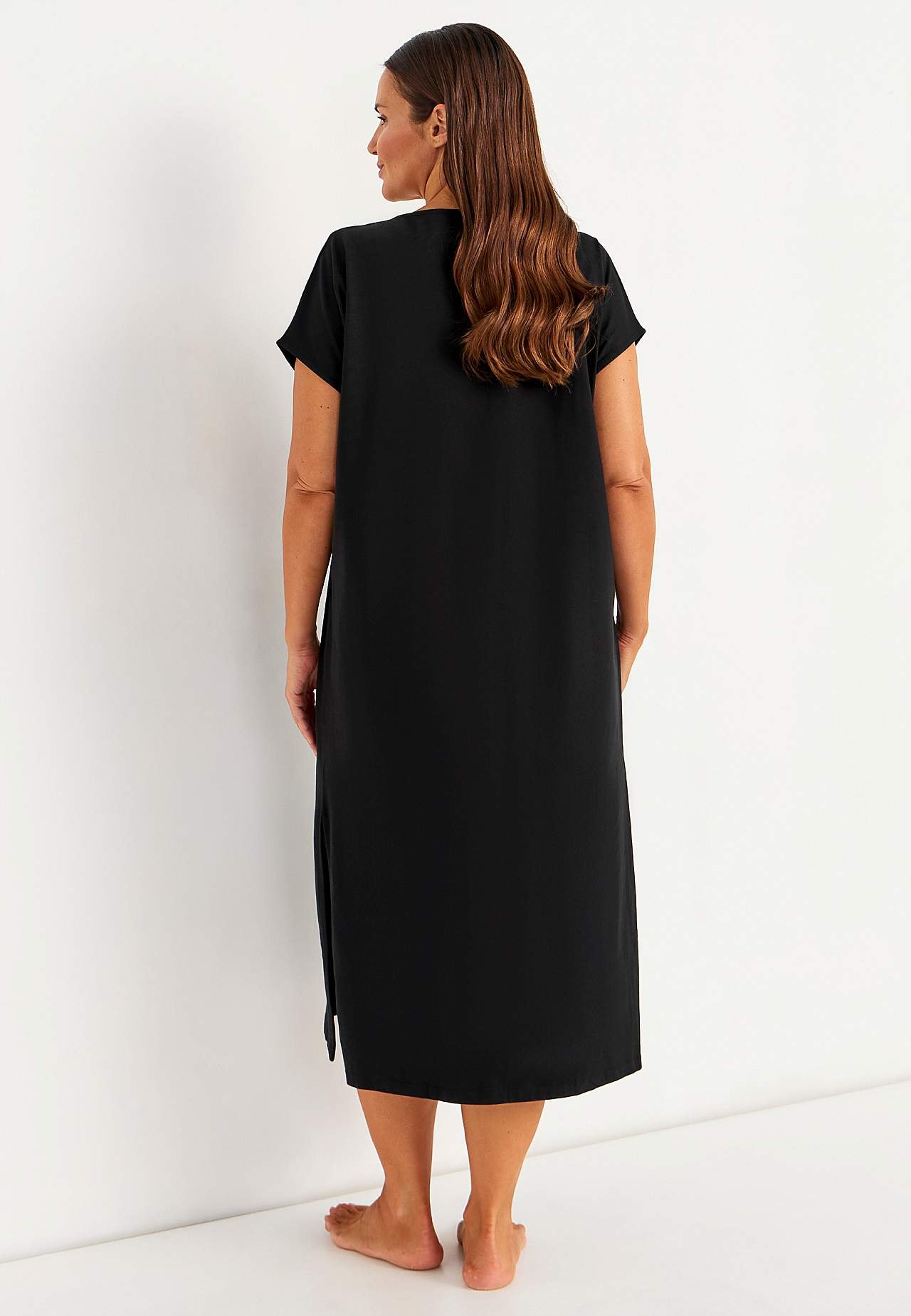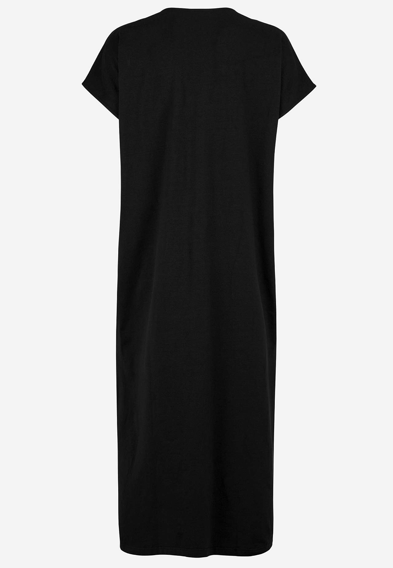 Měkké a roztažitelné plážové šaty z organické bavlny. Klasický kaftanový model. Volný střih. Rovný lem s vysokým rozparkem na stranách. Délka zad se odvíjí od velikosti, cca 128 cm.