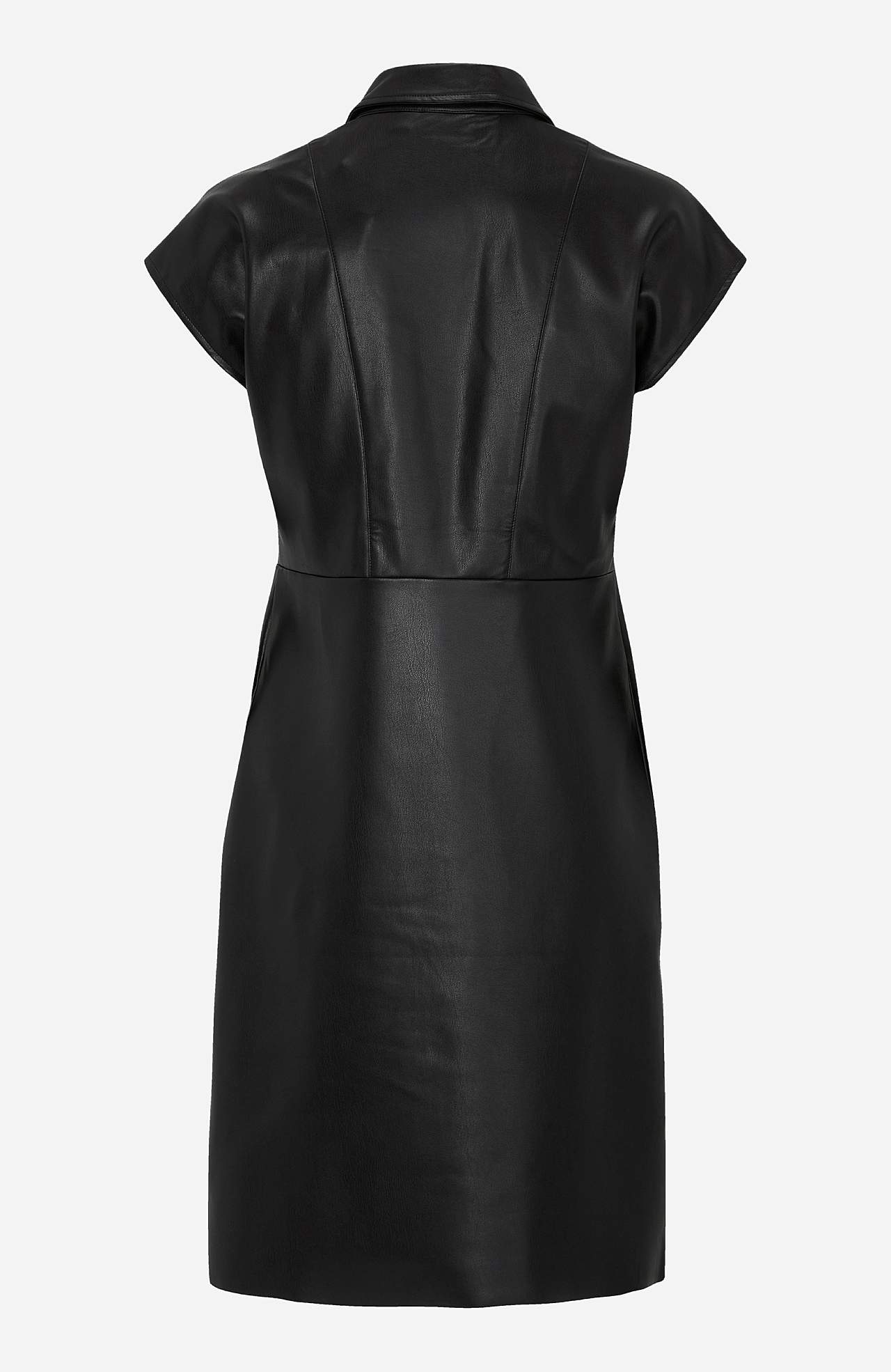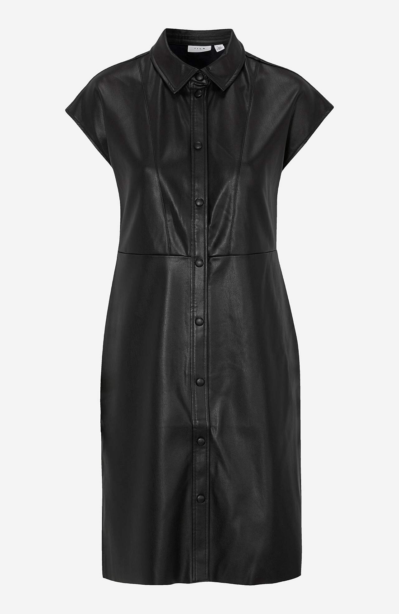 Šaty značky Vila. Šaty Odine. Šaty z roztažitelného umělé kůže. Krátké rukávy. Košilový límec. Potažené patentky. Kapsy na straně. Neopracovaný lem. Délka od ramen přibližně 97 cm ve velikosti 36.