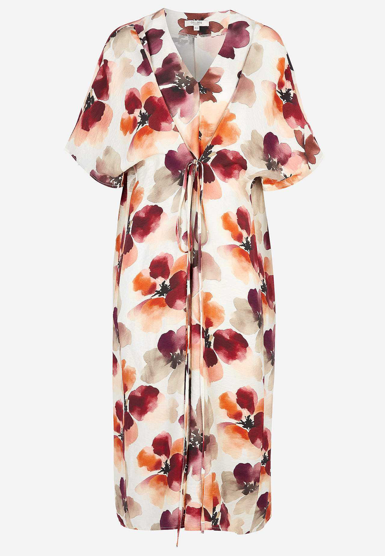 Rovné a uvolněné kimono šaty z úžasně vzdušné viskózy. Ideální na letní party. Materiál s lehce lesklou texturovanou vazbou. Široký a rovný střih. Krk s výstřihem ve tvaru V. Krátké a široké rukávy. Šité šňůrkové provázky v pase lze zavázat vpředu nebo vzadu. Rovný lem. Délka od ramene cca. 131 cm ve všech velikostech.