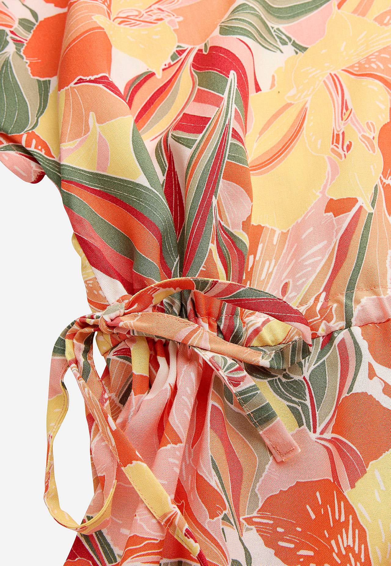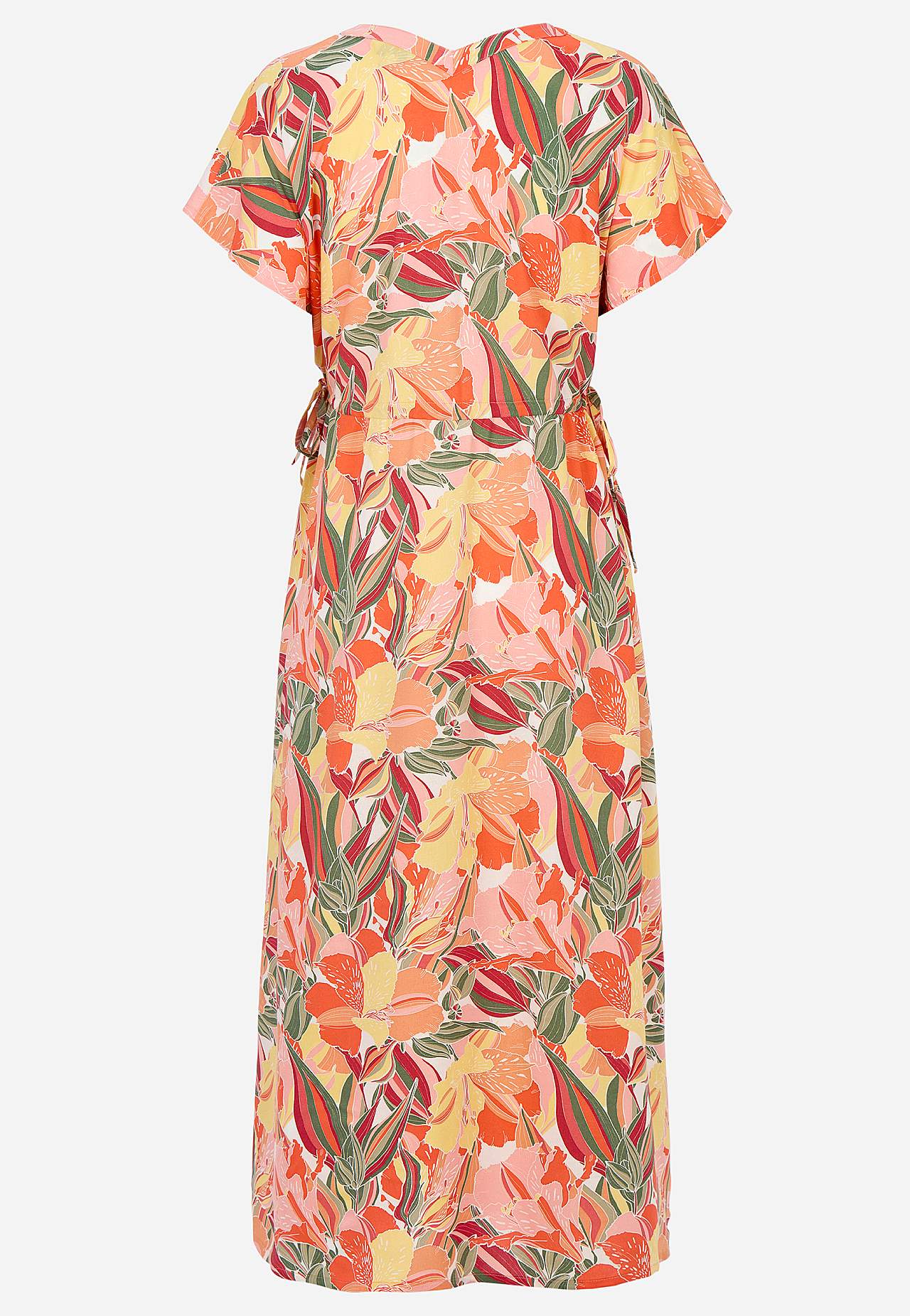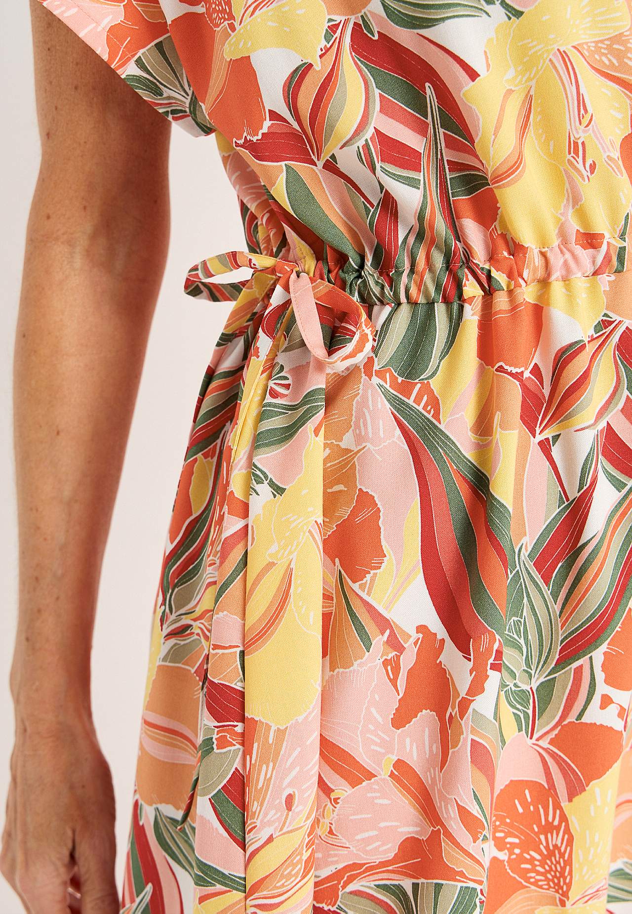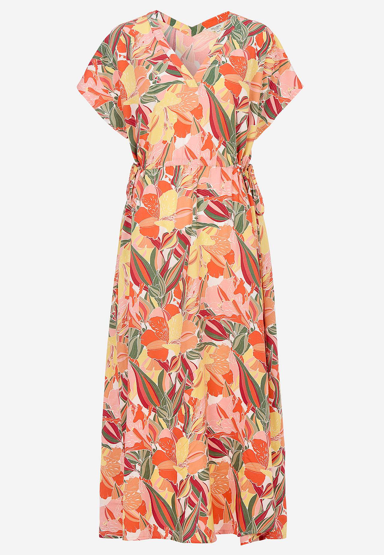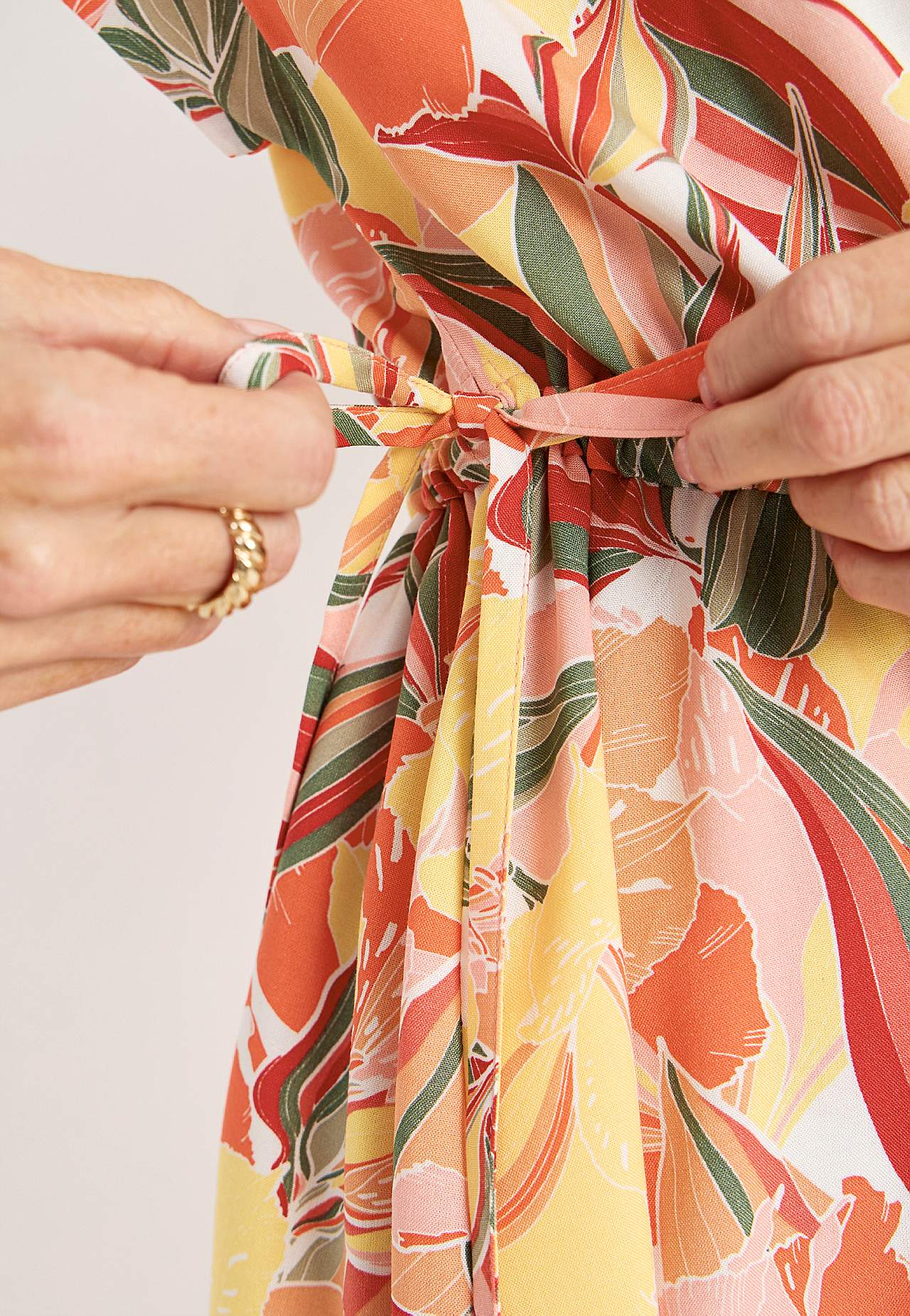 Vzdušný a chladicí materiál s matným povrchem. Ležérní a volný střih. Široké čepečkové rukávy. Skryté šňůrky na zavazování v pase. Snadno se upravuje a zavazuje na obou stranách. Vyberte si sami, volný nebo těsnější střih. Jemně zakulacený lem. Délka zad se odvíjí od velikosti, cca 128 cm.