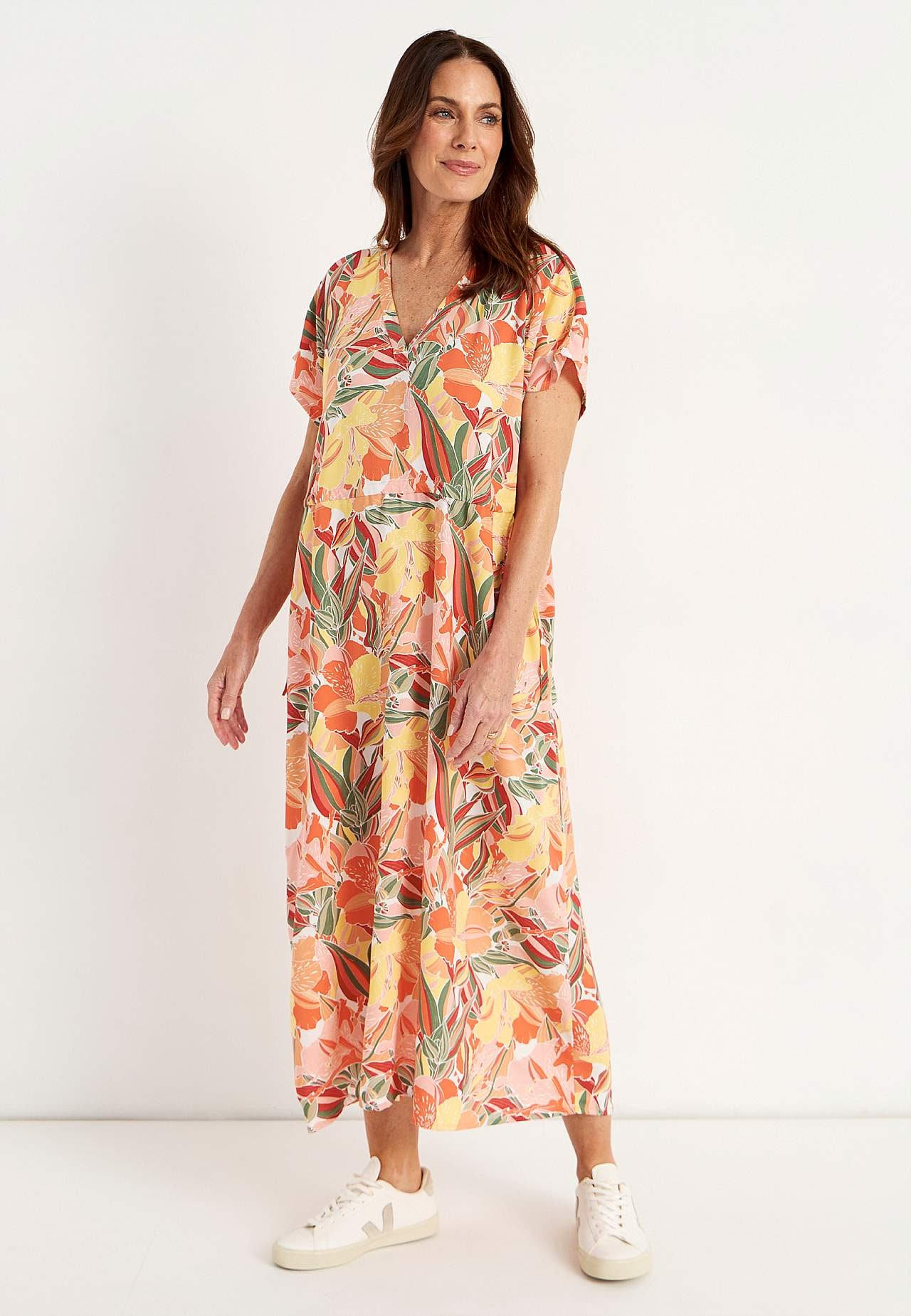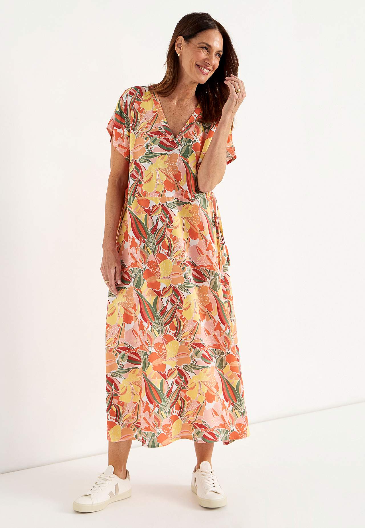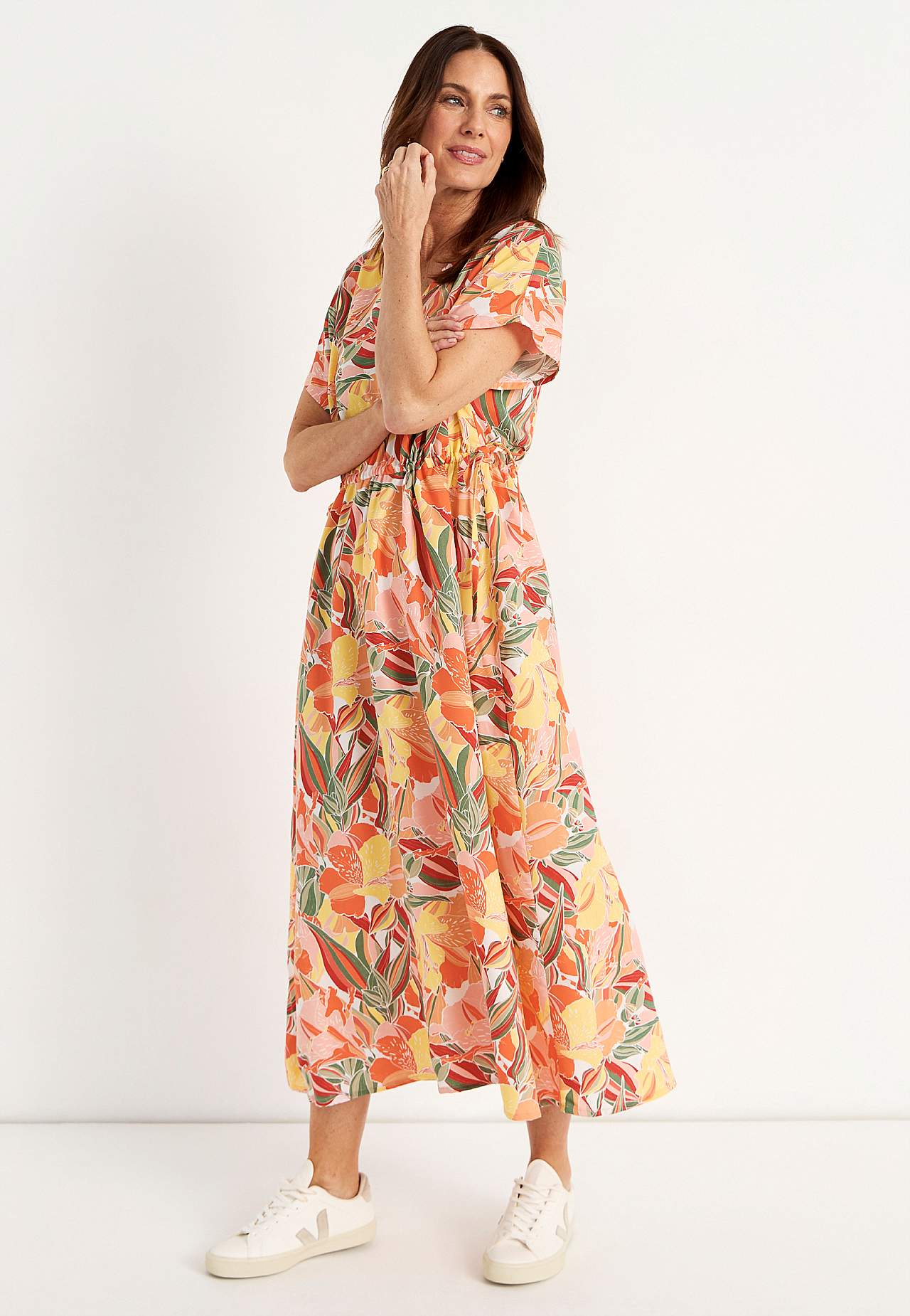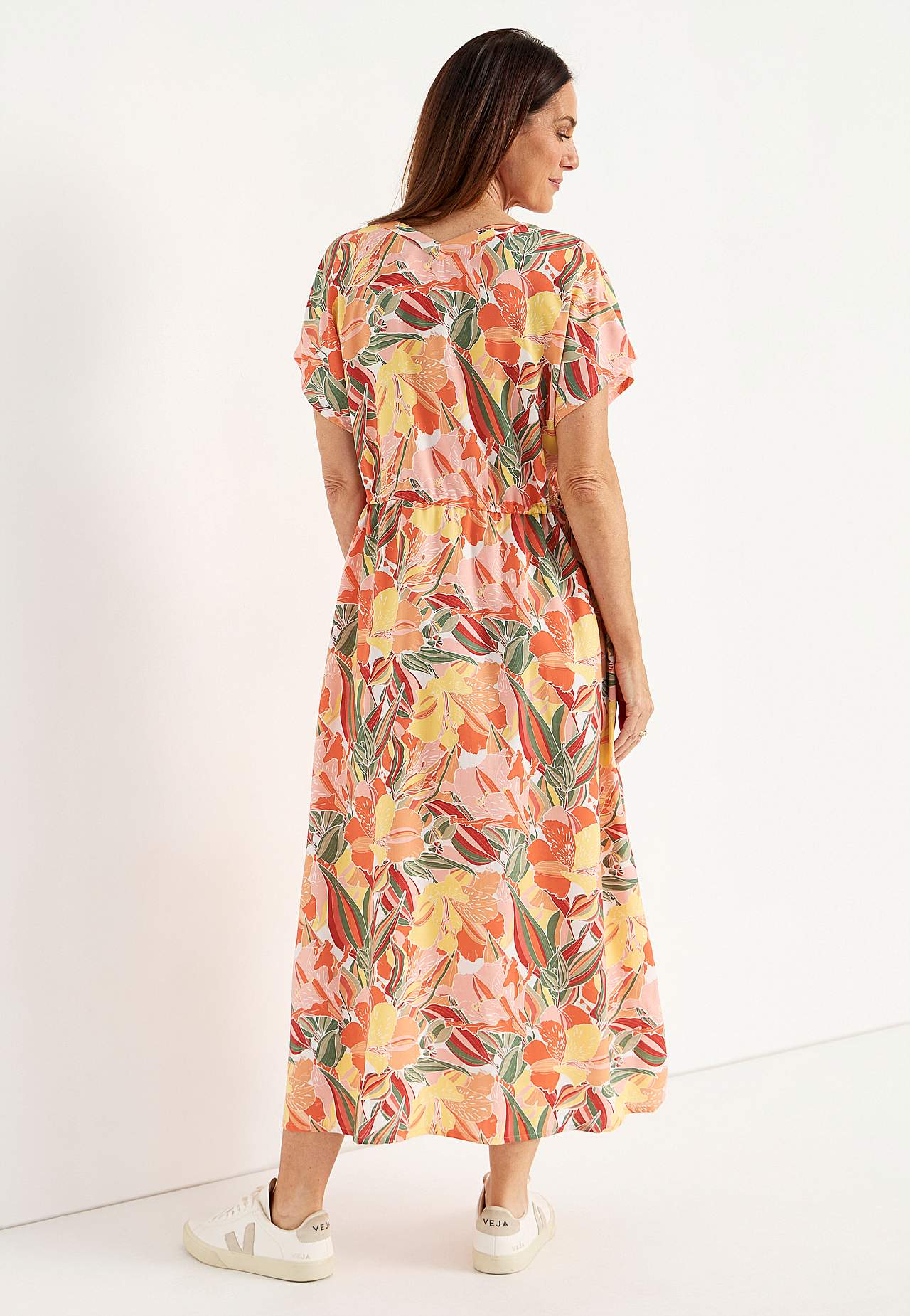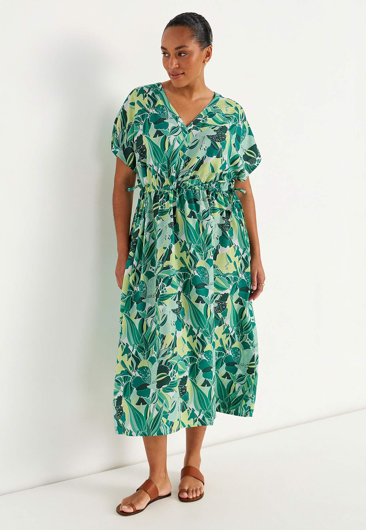 Vzdušný a chladicí materiál s matným povrchem. Ležérní a volný střih. Široké čepečkové rukávy. Skryté šňůrky na zavazování v pase. Snadno se upravuje a zavazuje na obou stranách. Vyberte si sami, volný nebo těsnější střih. Jemně zakulacený lem. Délka zad se odvíjí od velikosti, cca 128 cm.