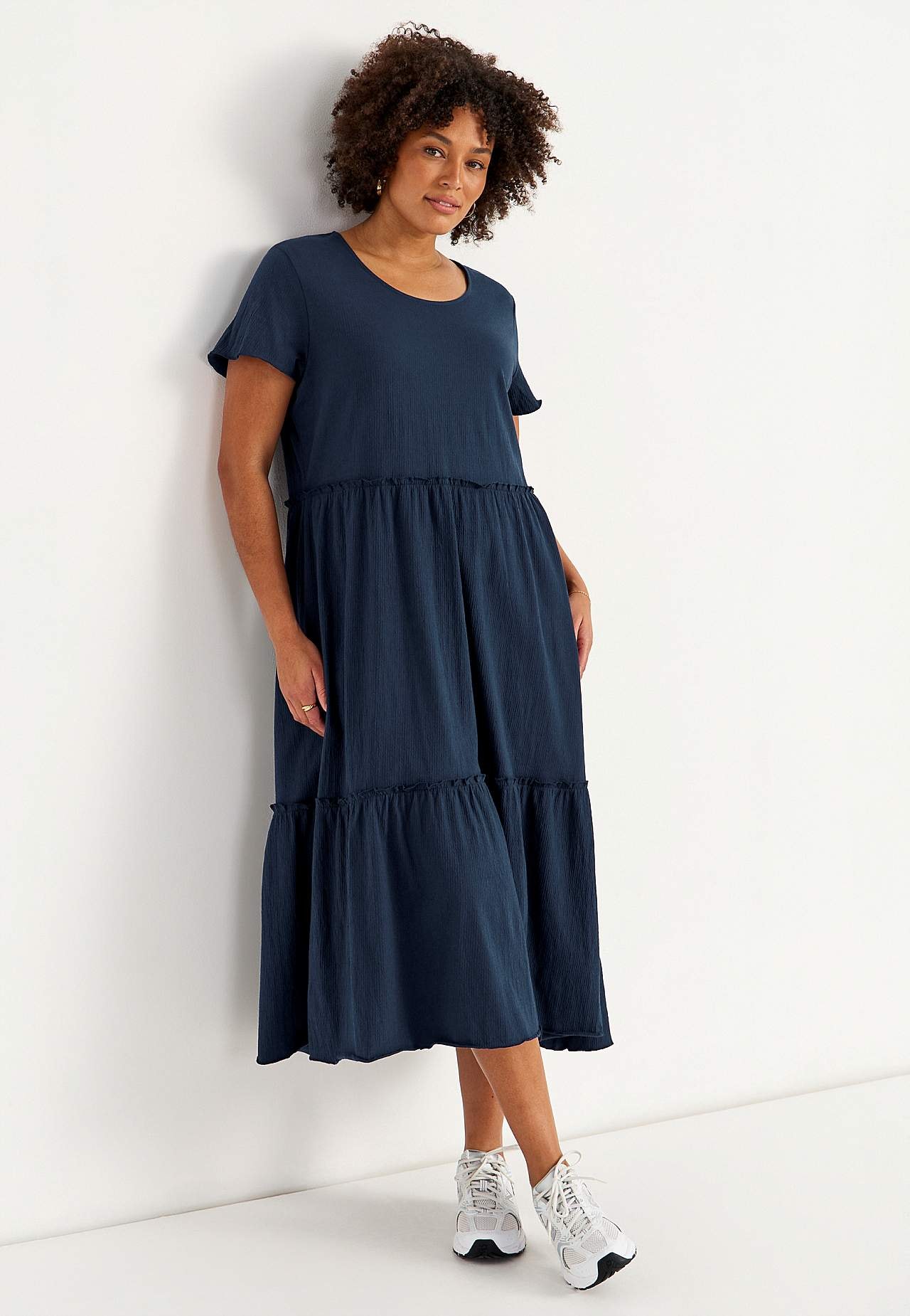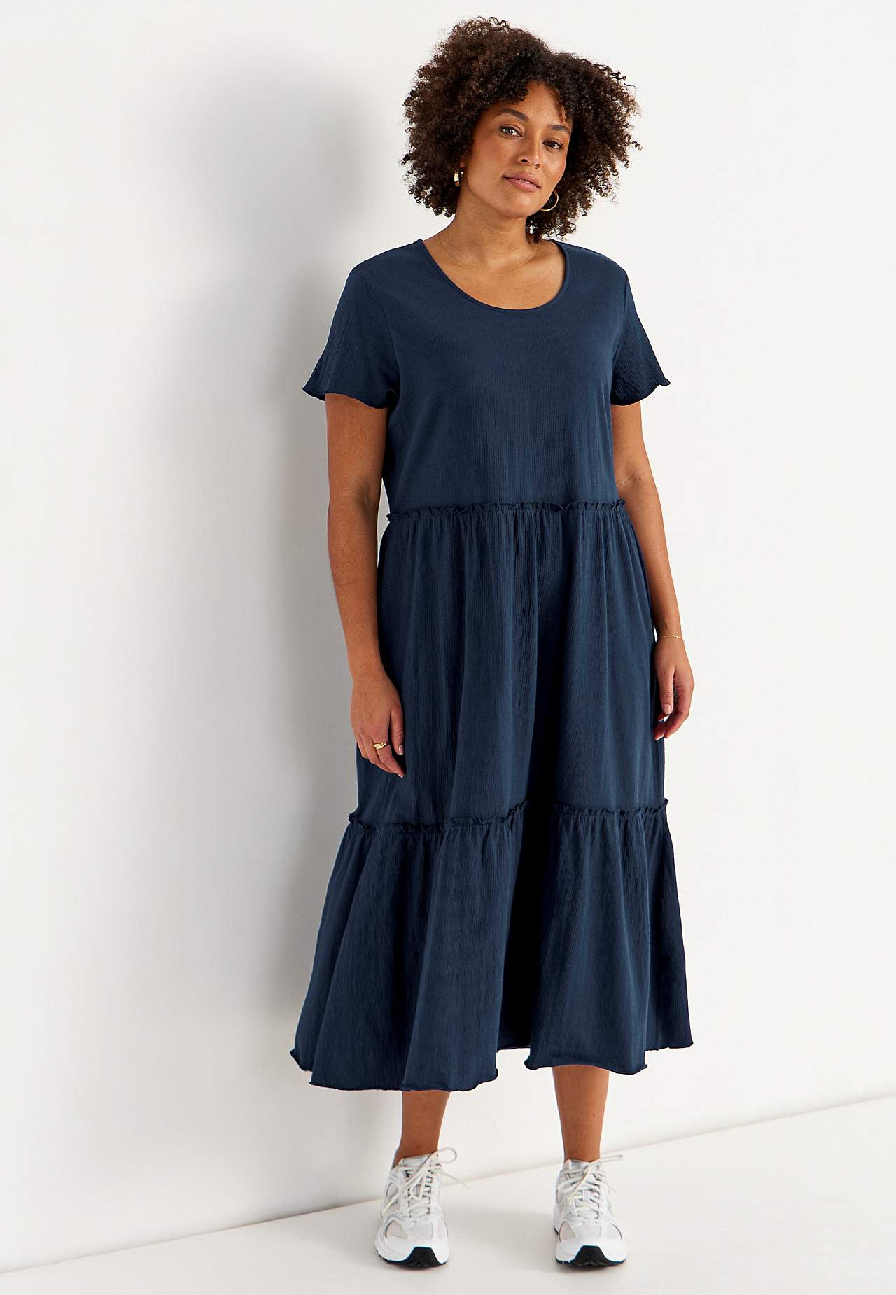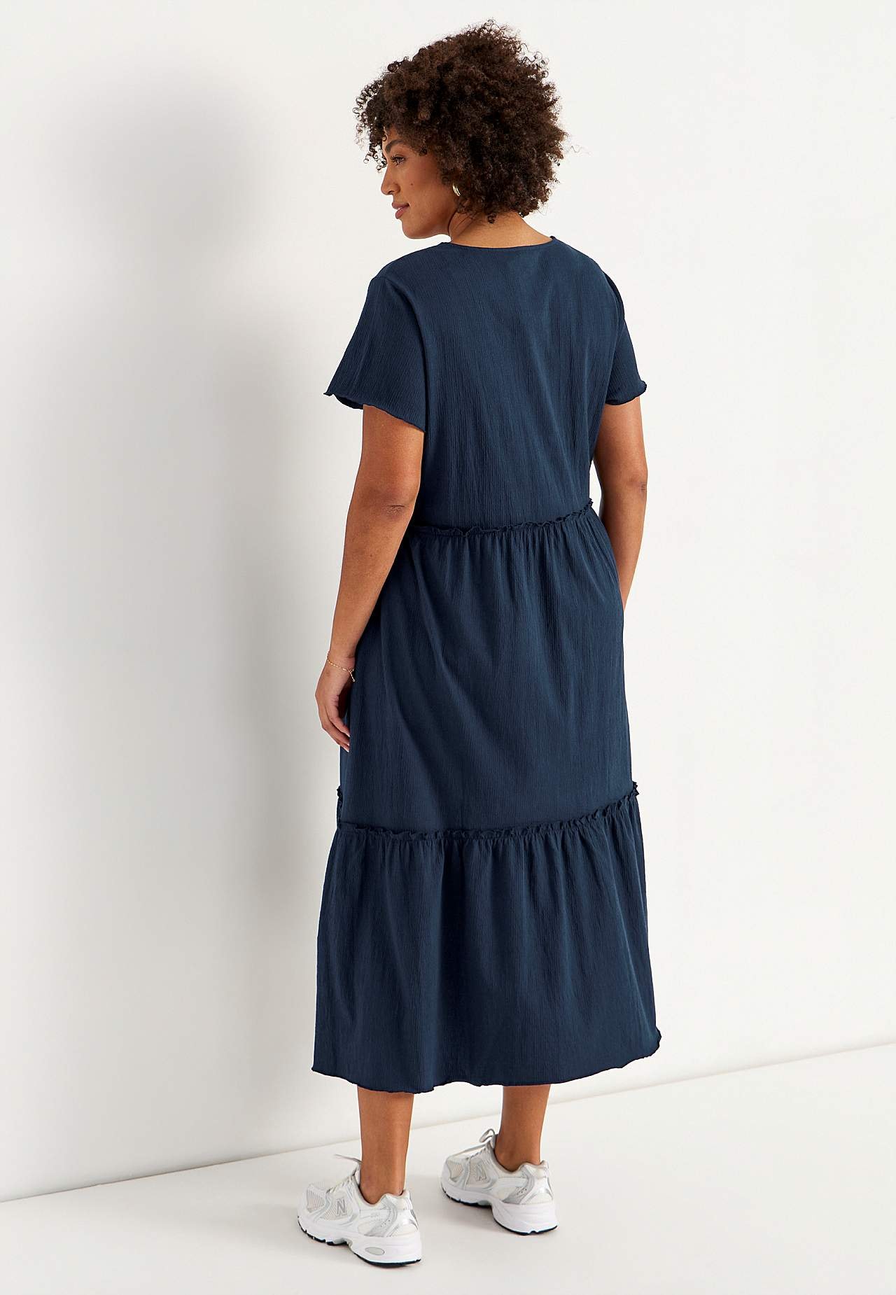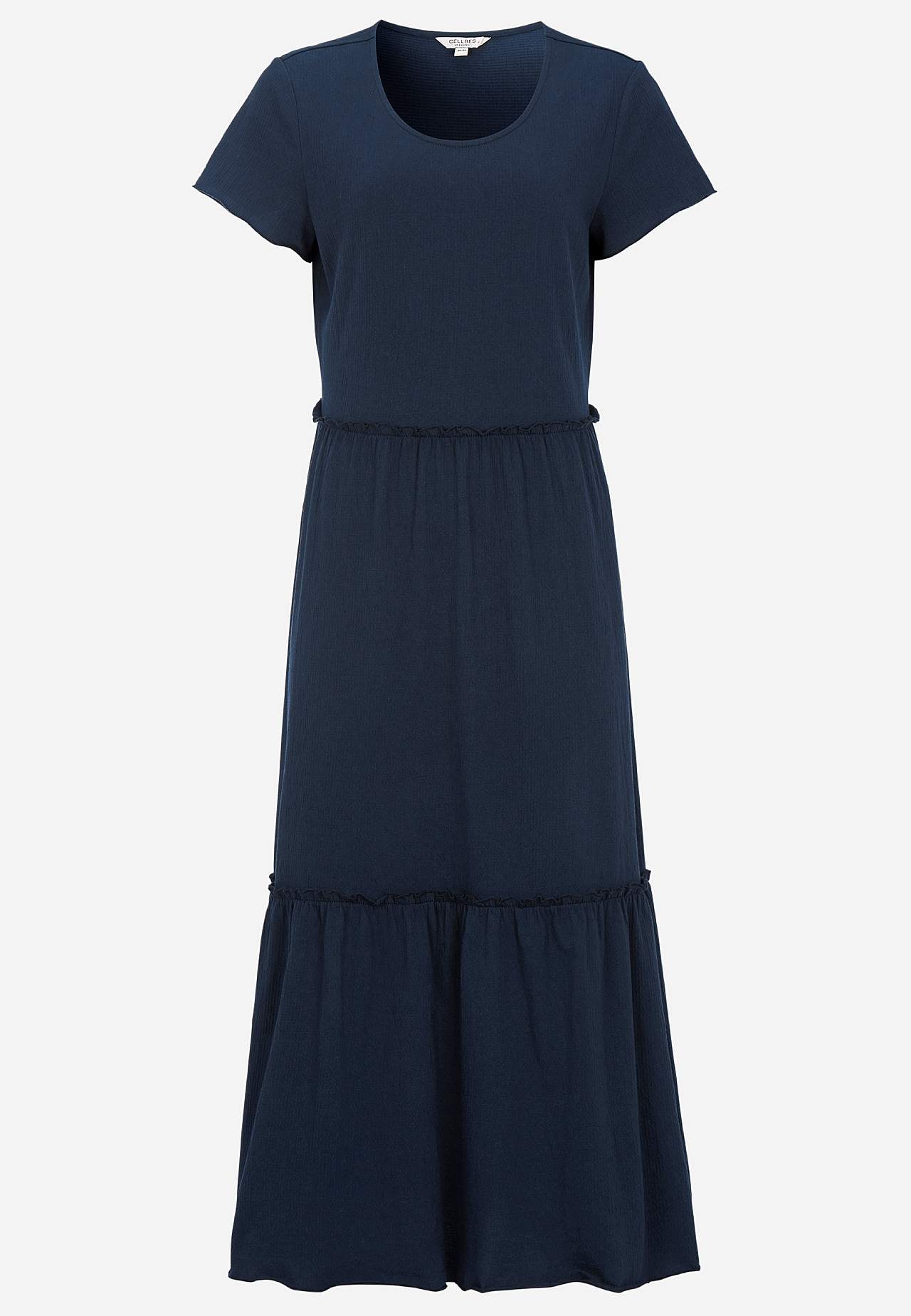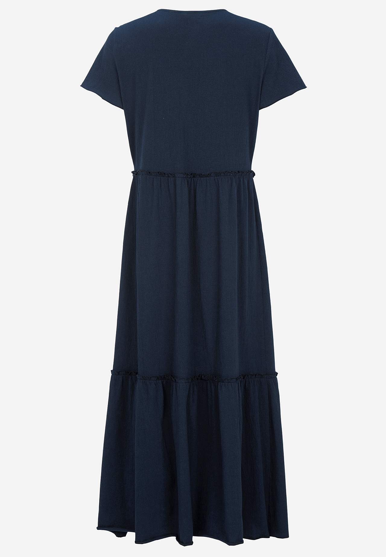 Roztažitelné a měkké volánové šaty s vlnitou strukturou. Ležérní střih do A. Sukňová část s půvabnou šířkou. Obnitkovaný, vlnitý a tenký šev vespod, na okraji volánu a na manžetách. Zaoblený krk. Krátké čepečkové rukávy. Jemně zakulacený lem. Zadní délka je u všech velikostí přibližně 128 cm.