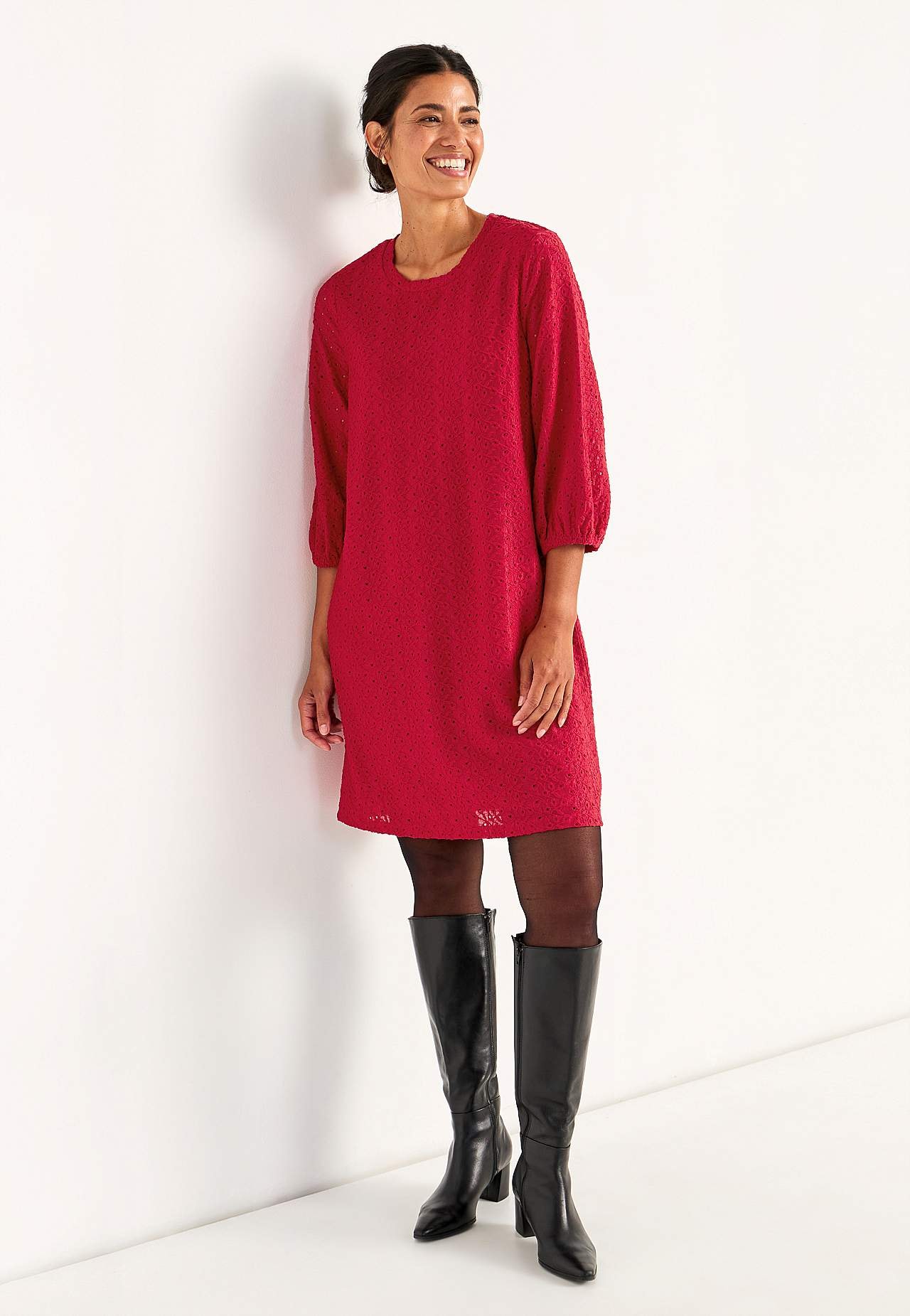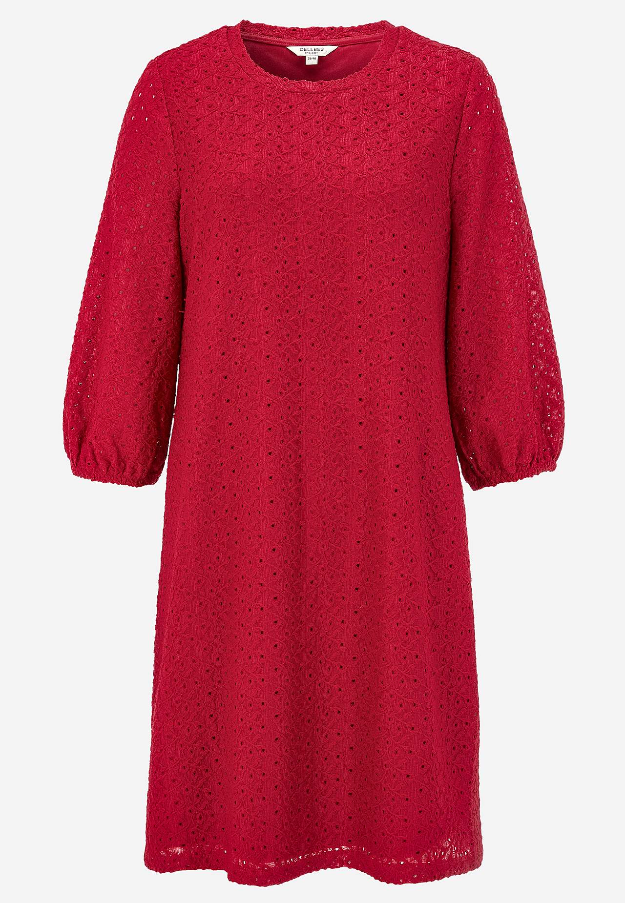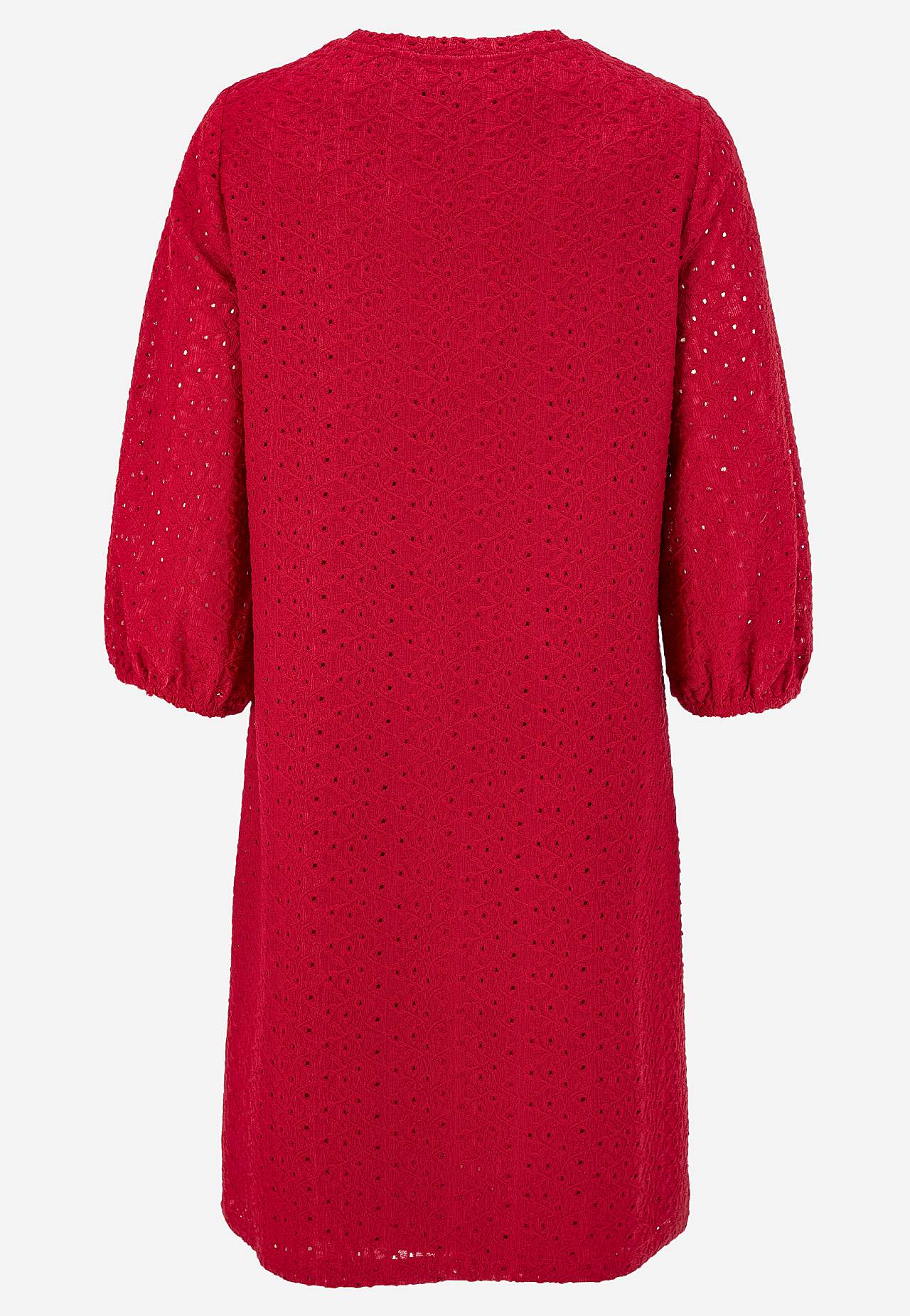 Krásné šaty s propracovaným vzorem. Střih mírně do A. Kulatý výstřih. Balonový rukáv s elastickou manžetou a 3/4 délkou. Šitá košilka z roztažitelné kvality. Rovný lem. Vzadu sedlo. Délka se odvíjí od velikosti, cca 95-107 cm od ramene.