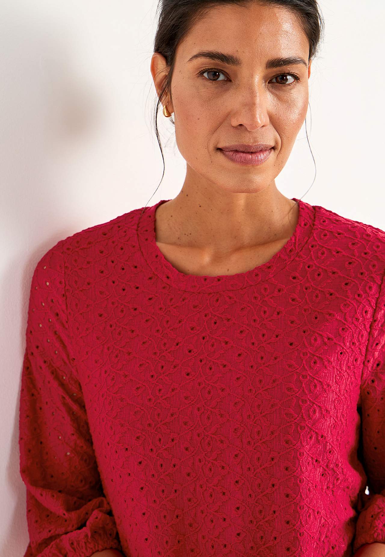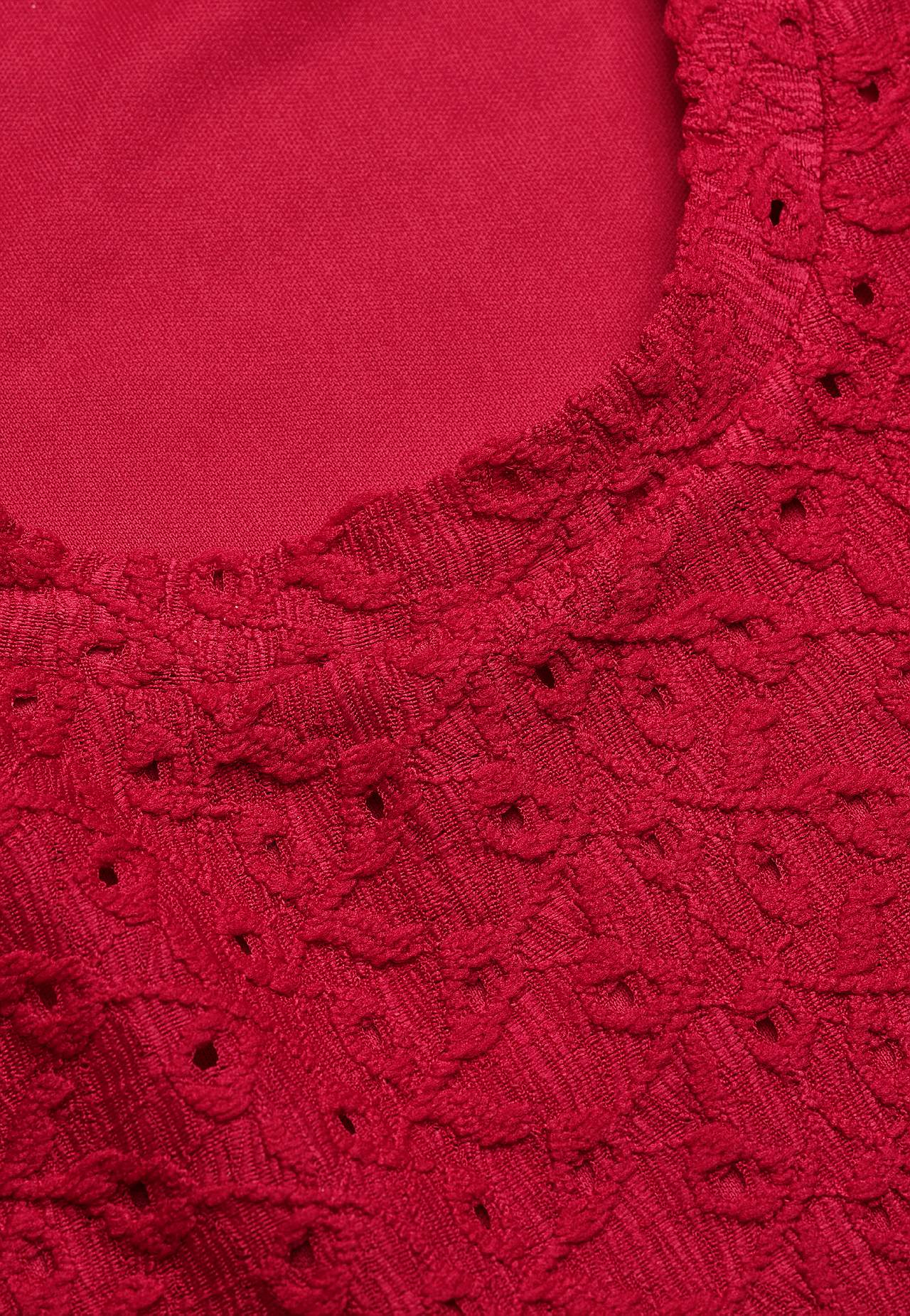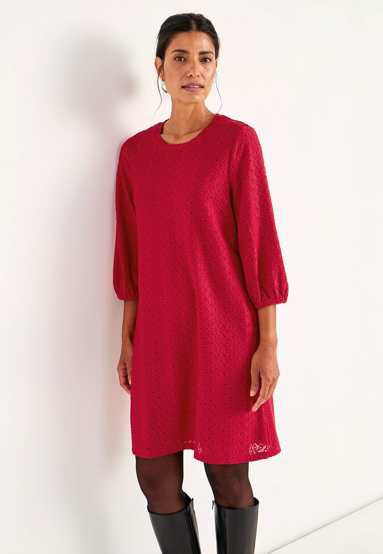 Krásné šaty s propracovaným vzorem. Střih mírně do A. Kulatý výstřih. Balonový rukáv s elastickou manžetou a 3/4 délkou. Šitá košilka z roztažitelné kvality. Rovný lem. Vzadu sedlo. Délka se odvíjí od velikosti, cca 95-107 cm od ramene.