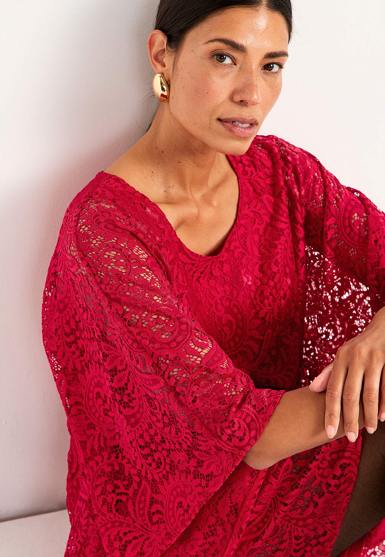 Vzdušný kaftanový model se strečem. Roztažitelná podšívka ze žerzeje s upnutým střihem. Model s kulatým krkem. Široké a poloviční rukávy bez podšívky. Délka zad se odvíjí od velikosti, cca 94-106 cm.