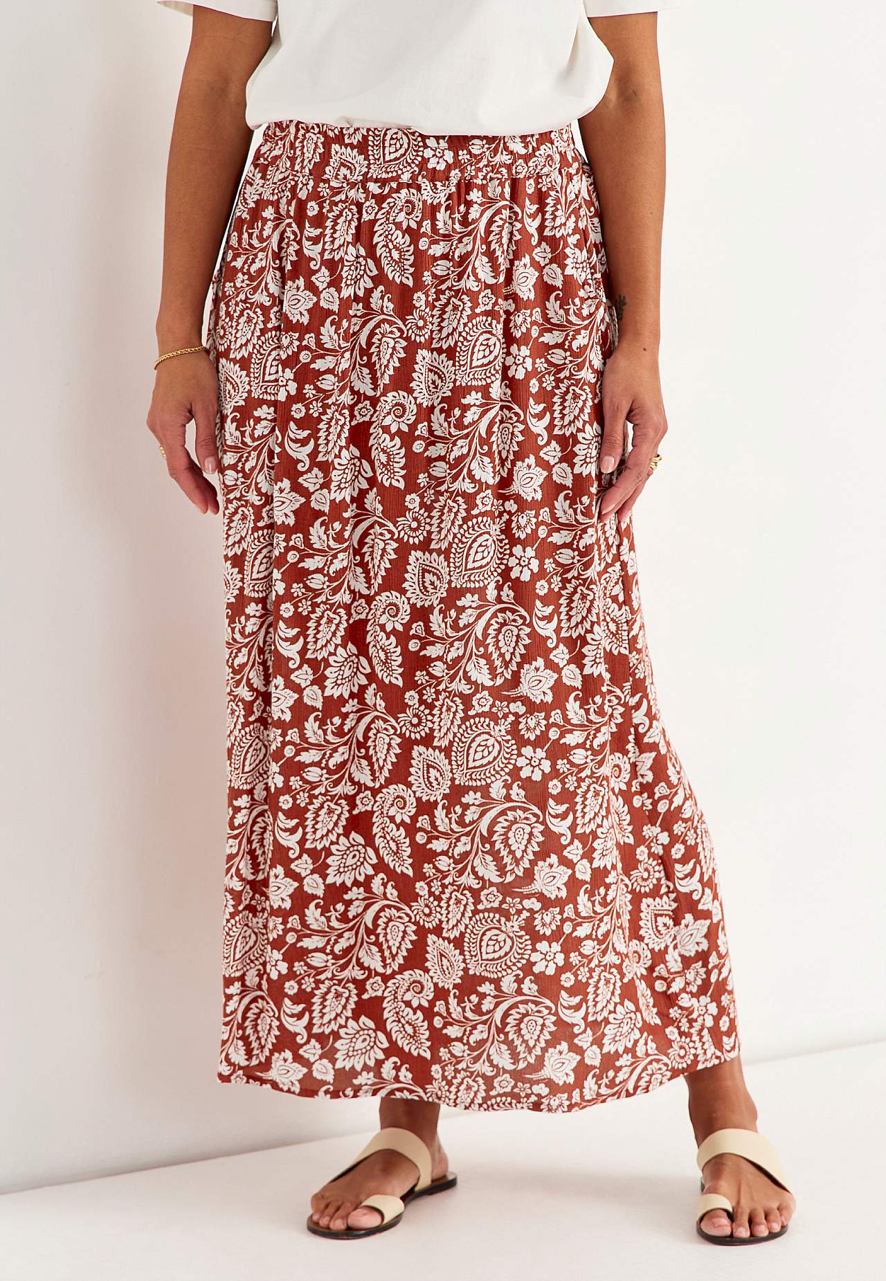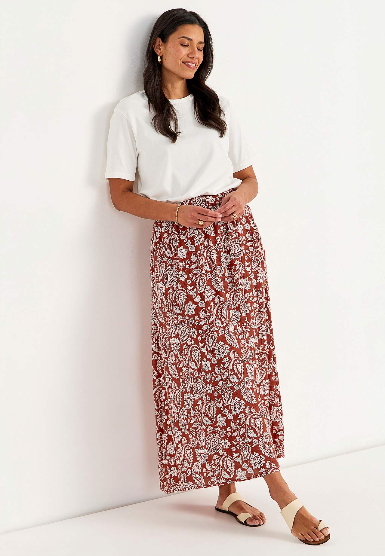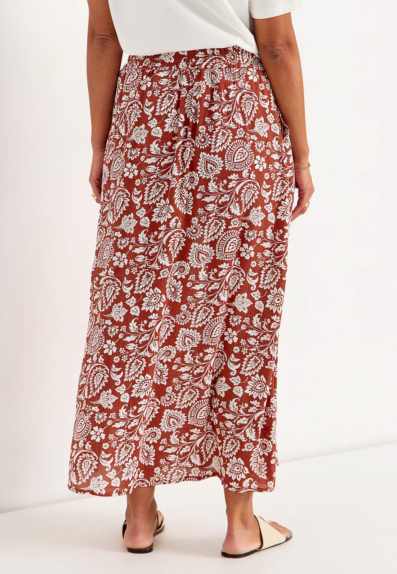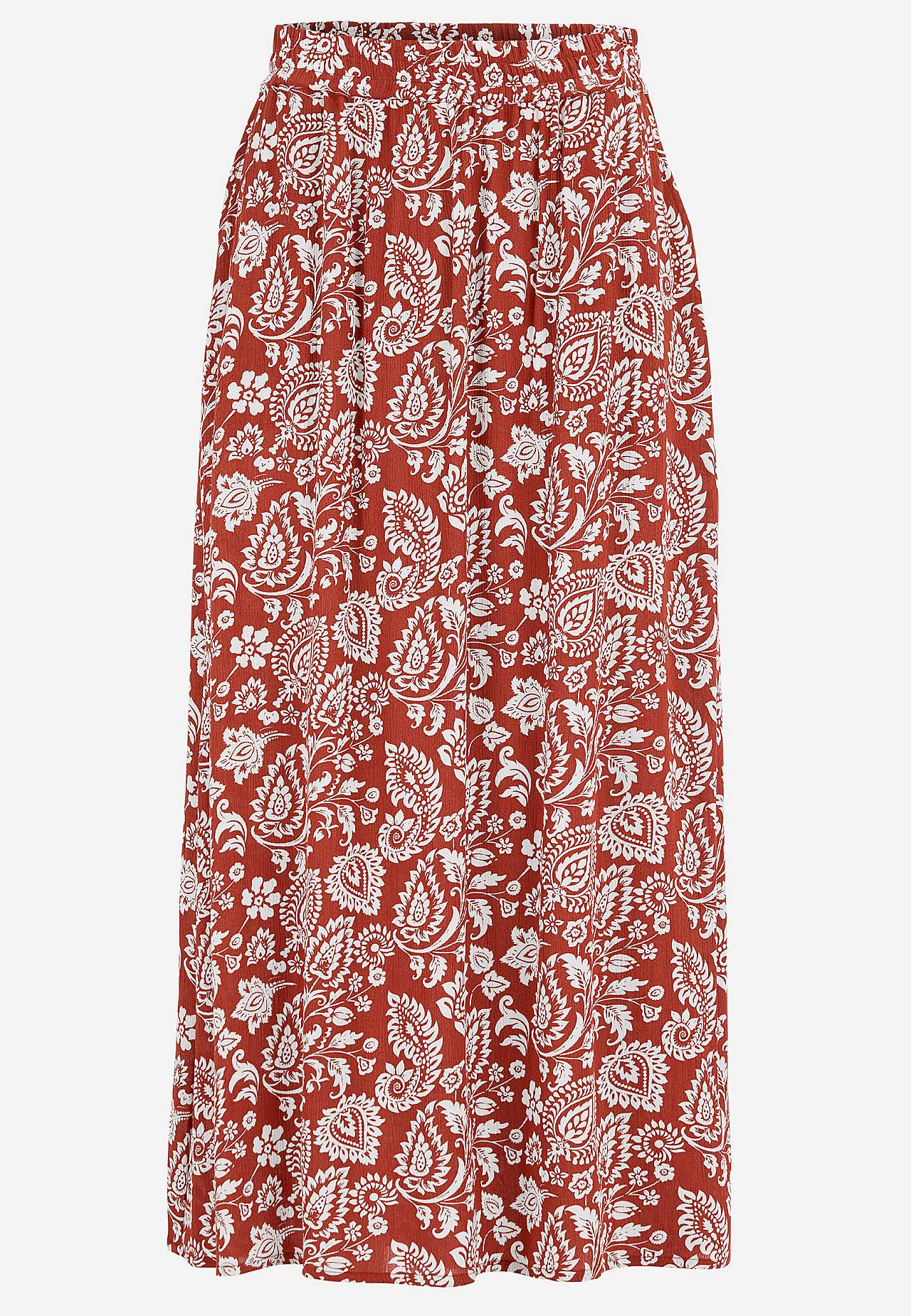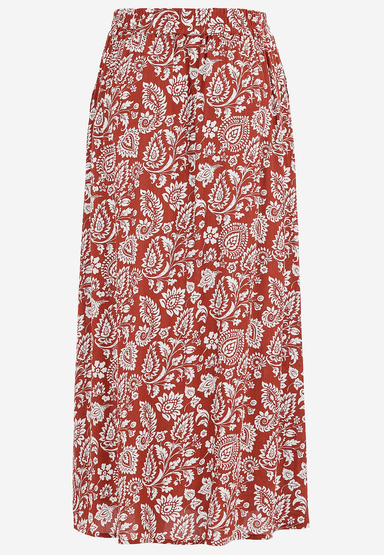 Dlouhá a tkaná viskózová sukně s kapsami. Krepový materiál s matným povrchem a jemnou strukturou. Měkký, splývavý a příjemný na dotek. Široký a měkký elastický pás. Šikmé kapsy vpředu. Rovný lem. Kombinujte s 702443. Délka: 95 cm.