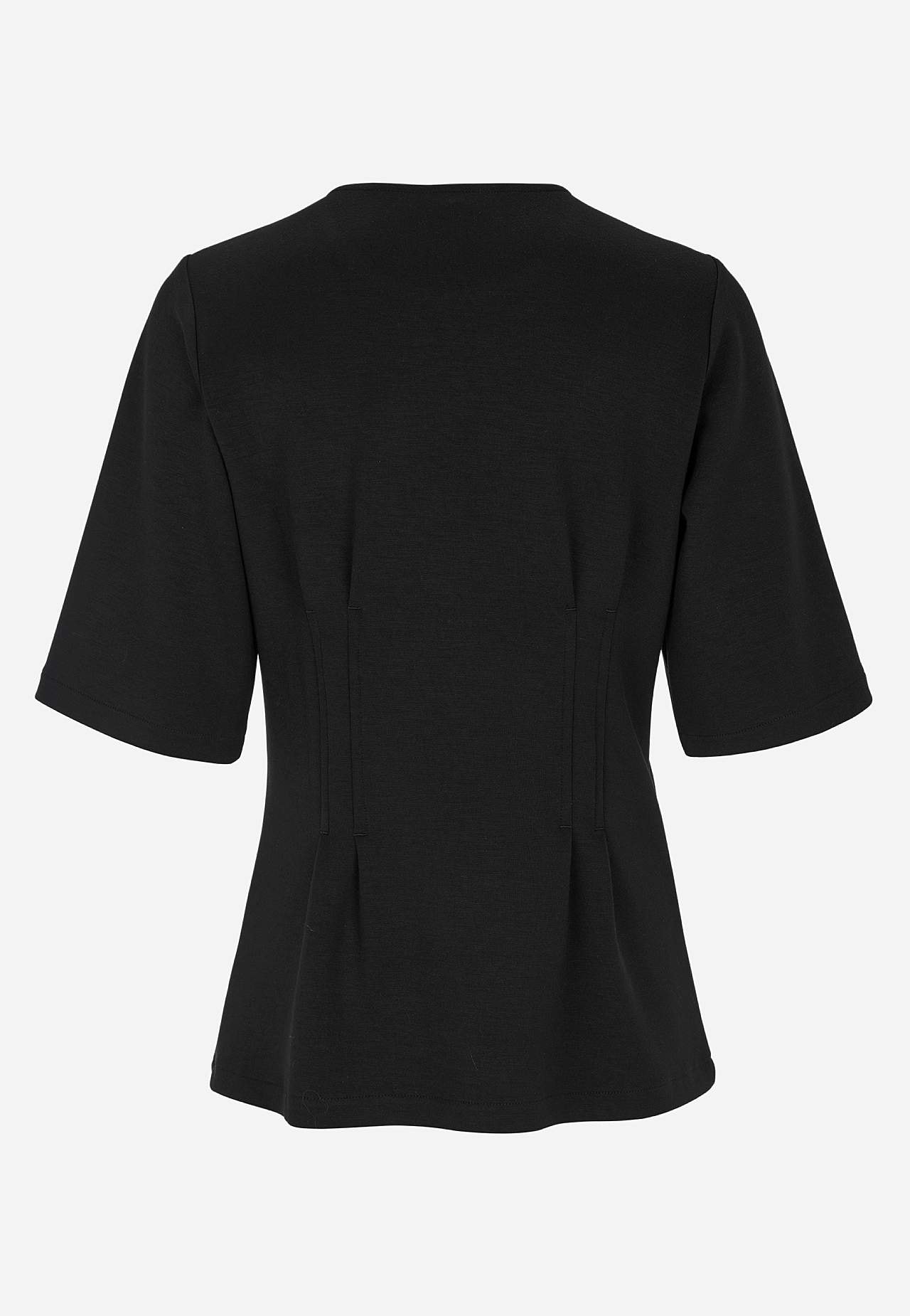 Hedvábně jemný top z mírně těžší směsi modalu. Klasický střih s lichotivým záševkem v přední i zadní části. Kulatý výstřih. Široké rukávy s délkou po lokty. Rovný lem. Vzadu sedlo. Délka se odvíjí od velikosti, cca 62-77 cm od ramene.