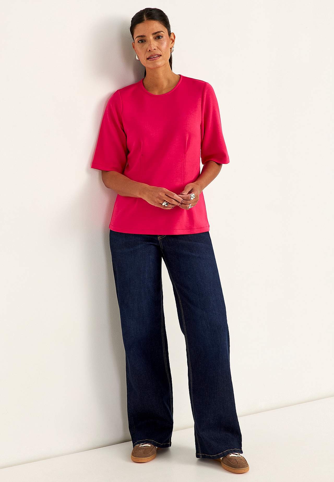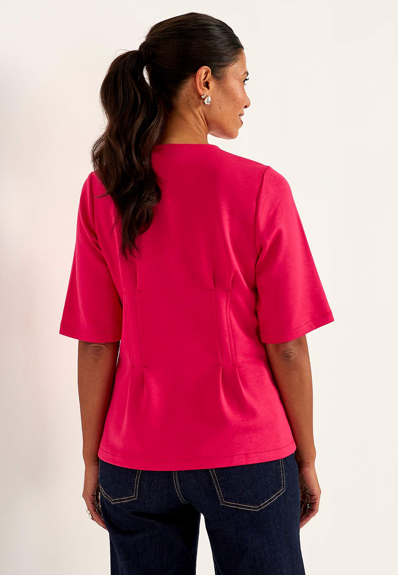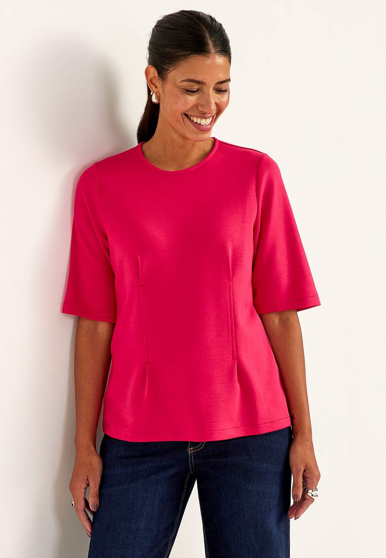 Hedvábně jemný top z mírně těžší směsi modalu. Klasický střih s lichotivým záševkem v přední i zadní části. Kulatý výstřih. Široké rukávy s délkou po lokty. Rovný lem. Vzadu sedlo. Délka se odvíjí od velikosti, cca 62-77 cm od ramene.