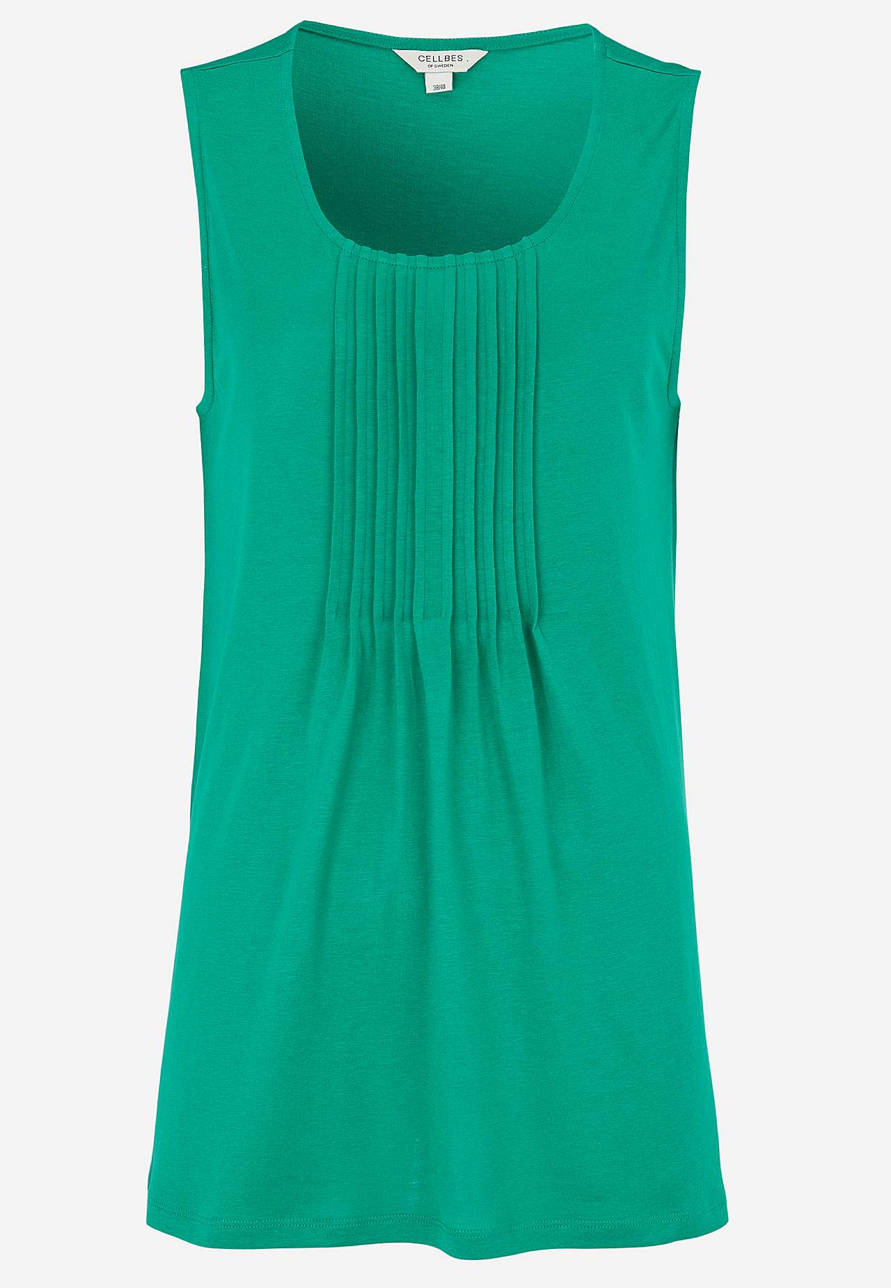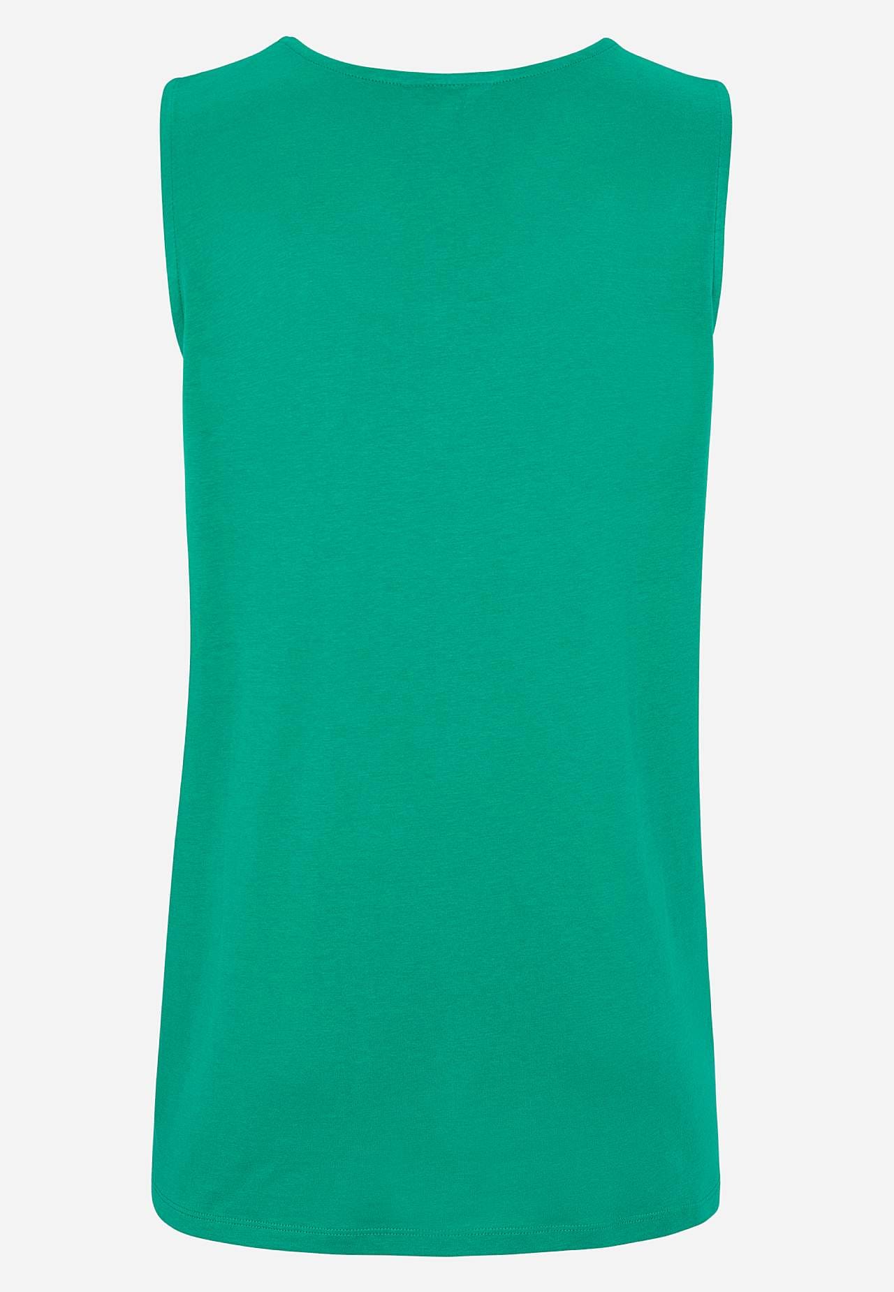 Tílko z měkké a organické bavlny s modalem do A. Ideální pro pěkné, teplé dny! Design s dekorativním plisé vpředu. Kulatý krk. Rovný lem. Vzadu sedlo. Délka se odvíjí od velikosti, cca 66-78 cm od ramene.